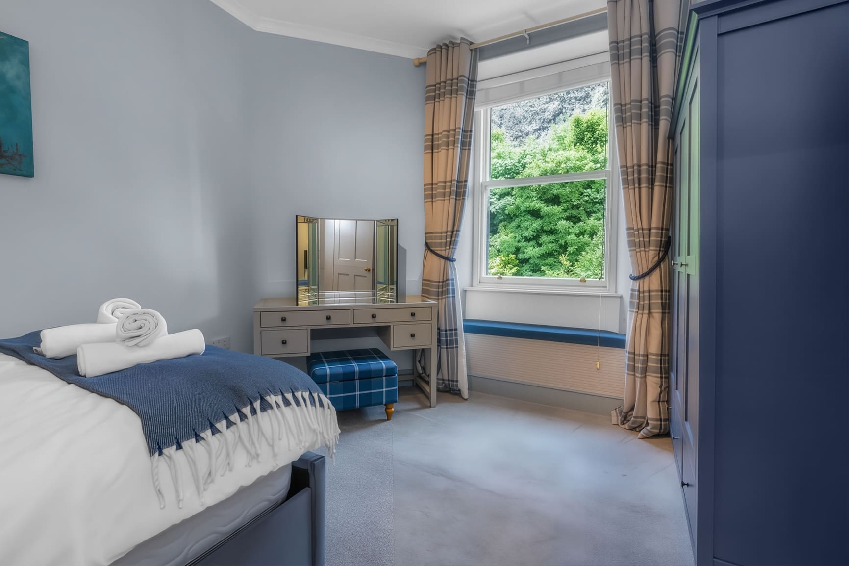 Step inside and be greeted by opulent interiors that marry traditional Scottish elegance with contemporary comfort. The spacious living area features grand corner windows, allowing natural light to flood the space and offering breathtaking vistas of Calton Hill. The decor is tastefully curated, with plush furnishings atop classic tartan rugs. The fully equipped kitchen caters to all your culinary needs, making it ideal for family meals or entertaining guests. The apartment accommodates up to six guests with three beautifully appointed bedrooms, including a mezzanine level with two single beds perfect for early risers.
