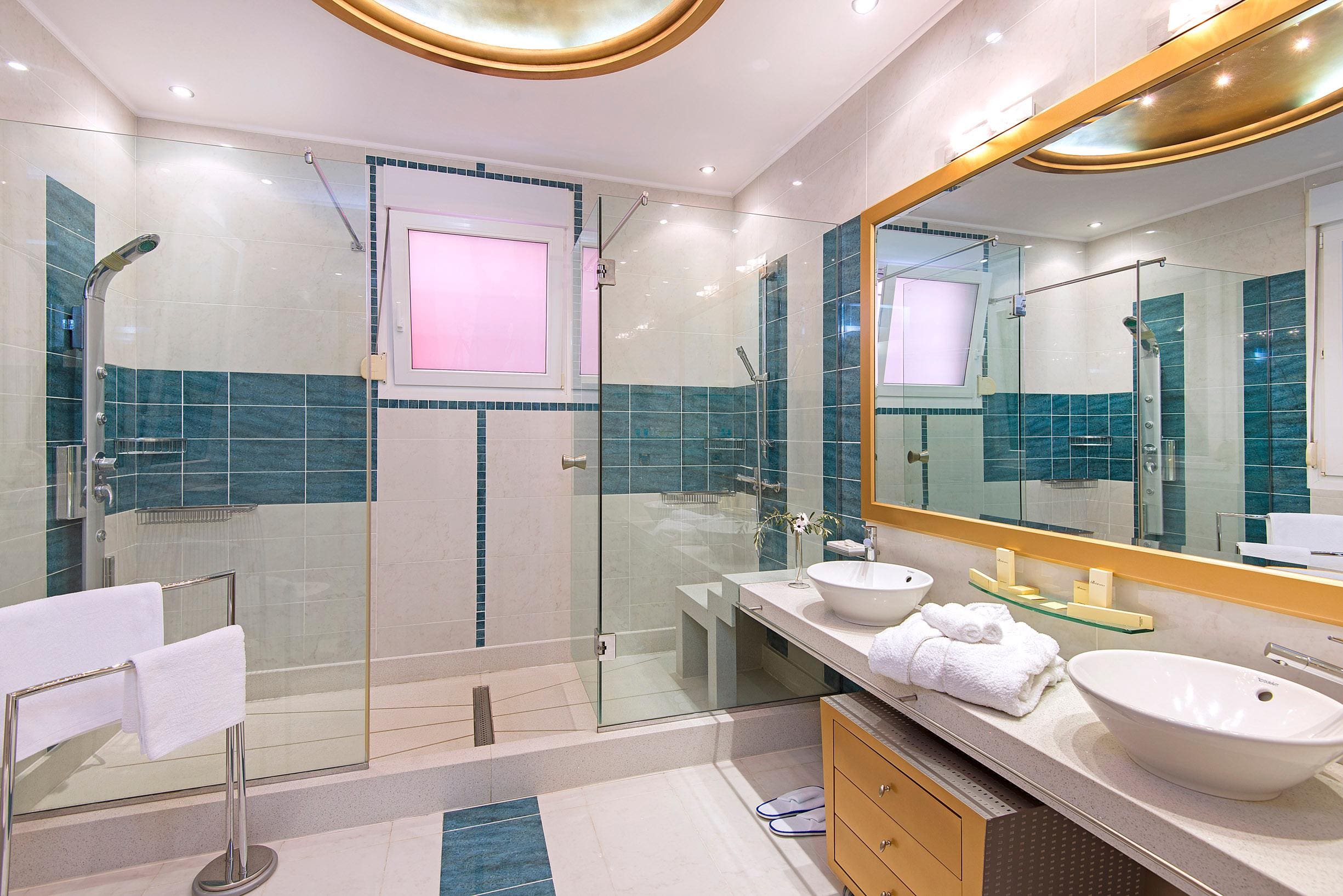 Outside, a private swimming pool glistens under the Greek sun, surrounded by a manicured lawn and comfortable sun loungers. Enjoy alfresco dining on the terrace, or discover the hidden hot tub beneath a charming gazebo. The apartment’s elevated position provides breathtaking views of the azure sea, making every moment spent outdoors a delight.