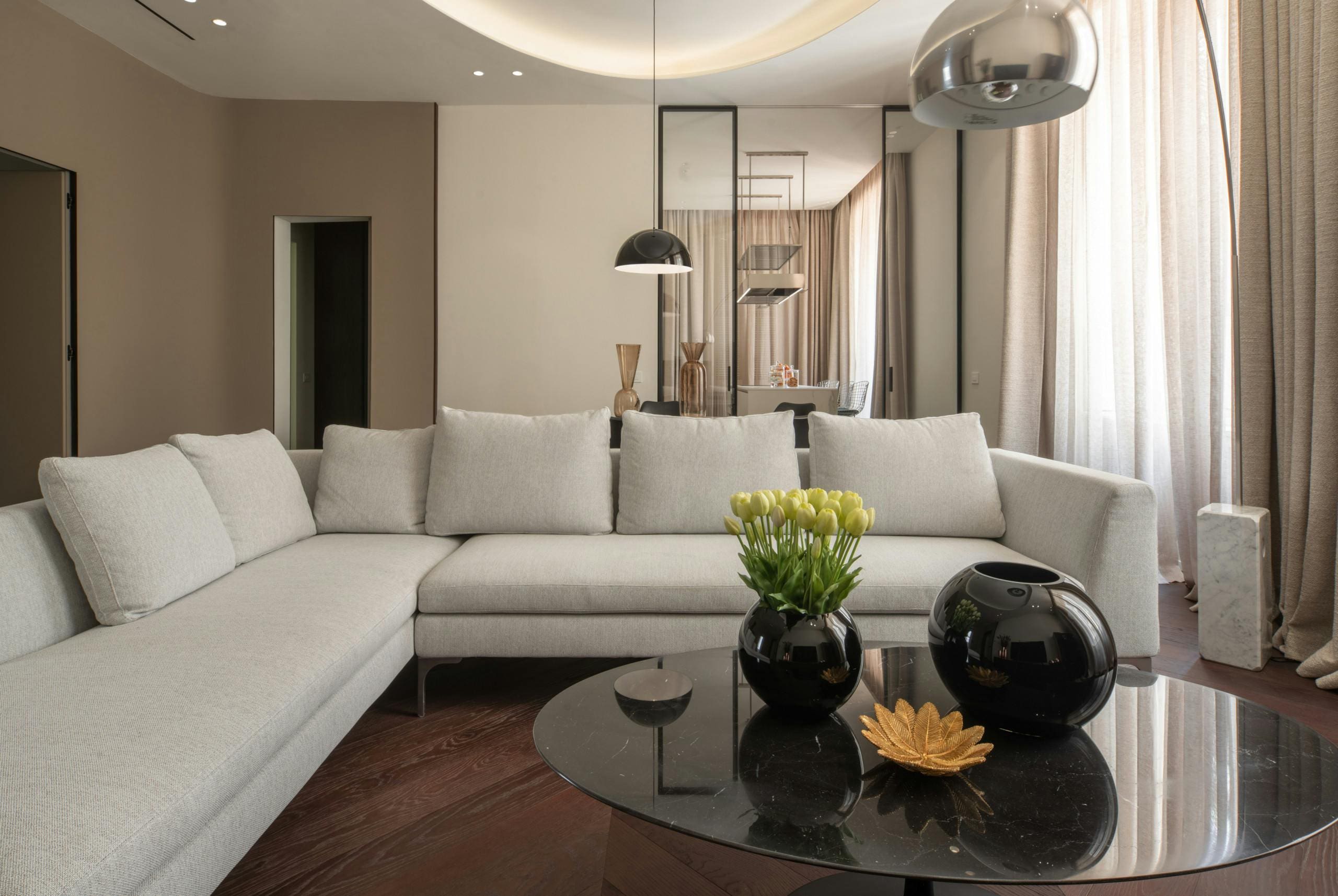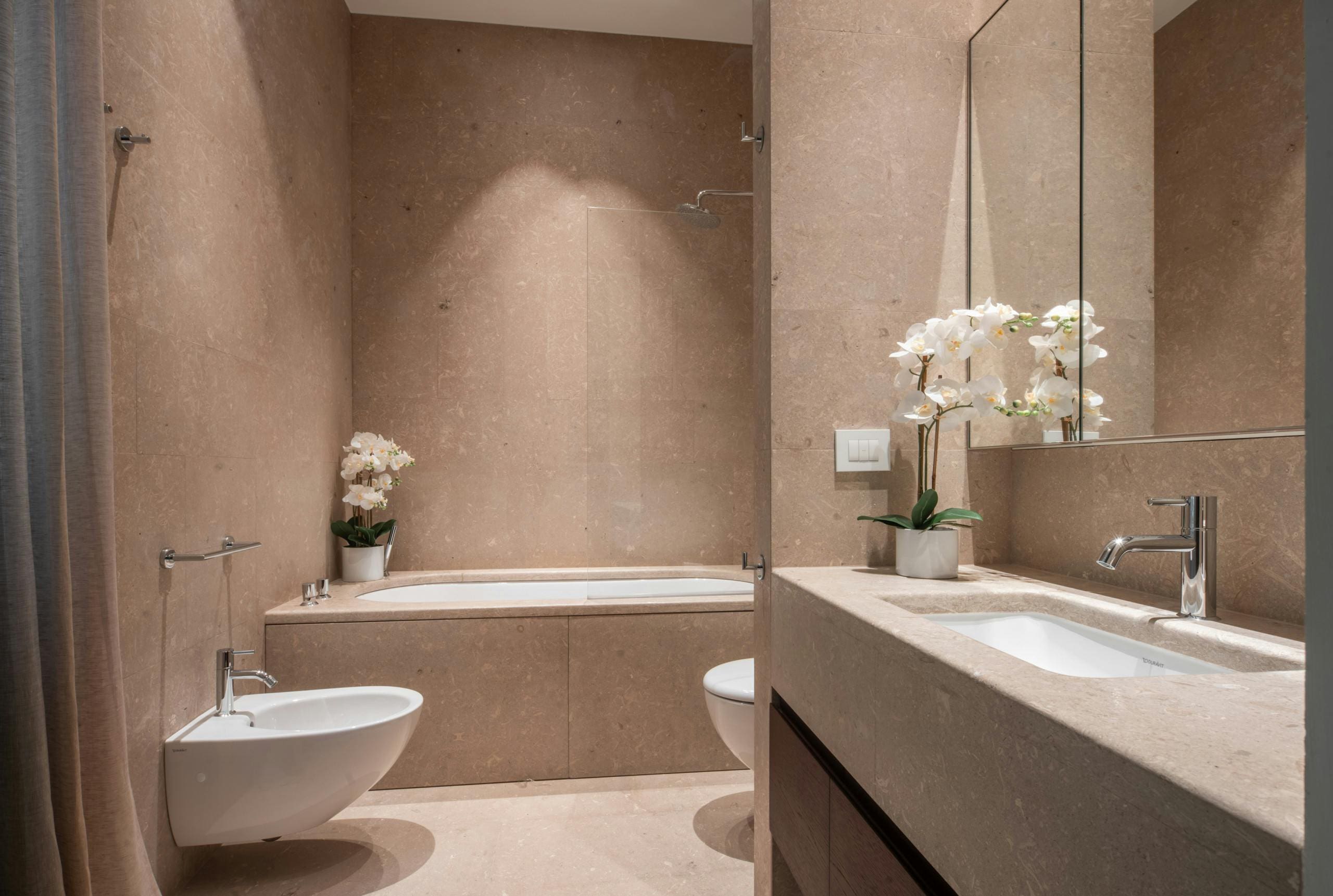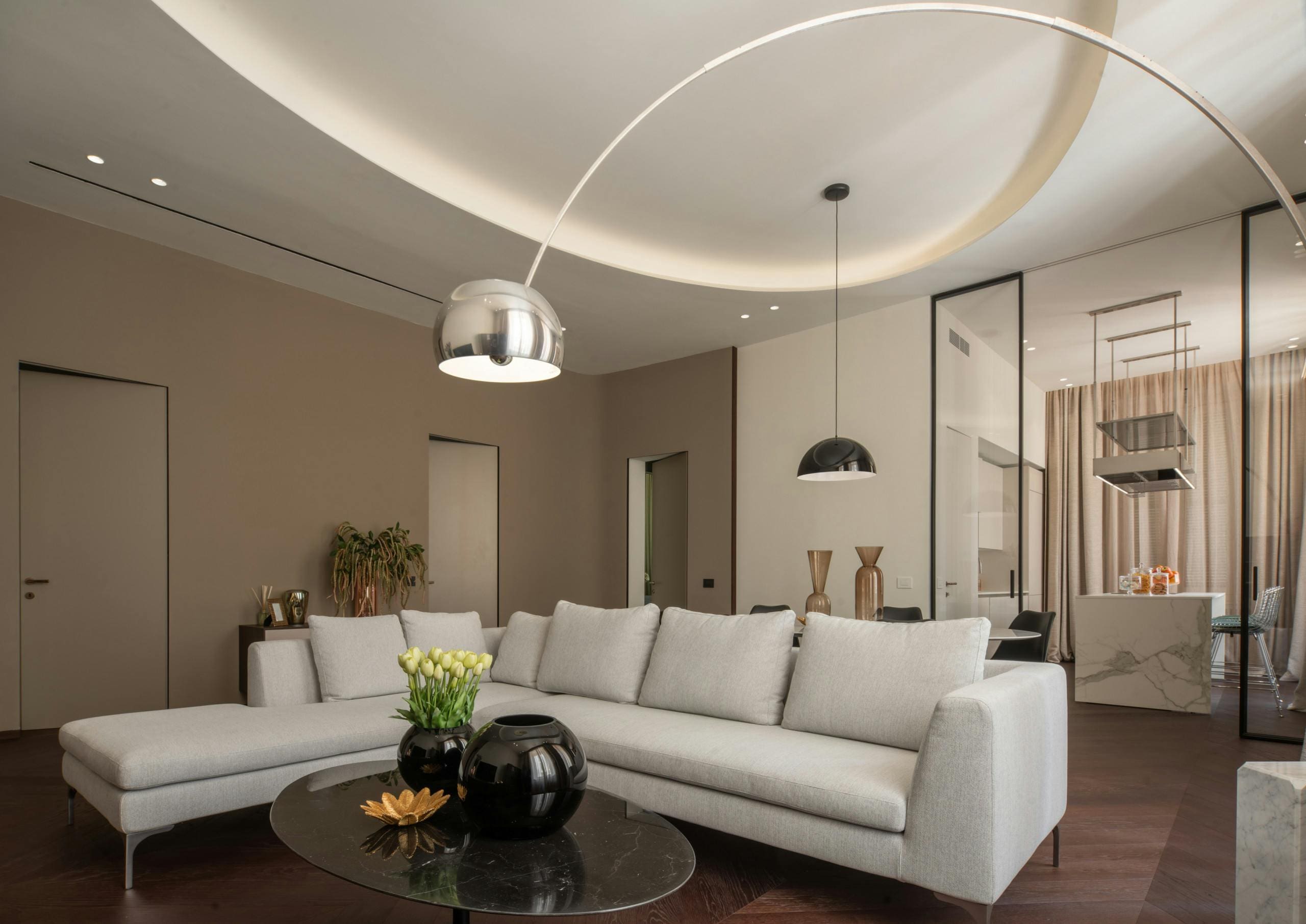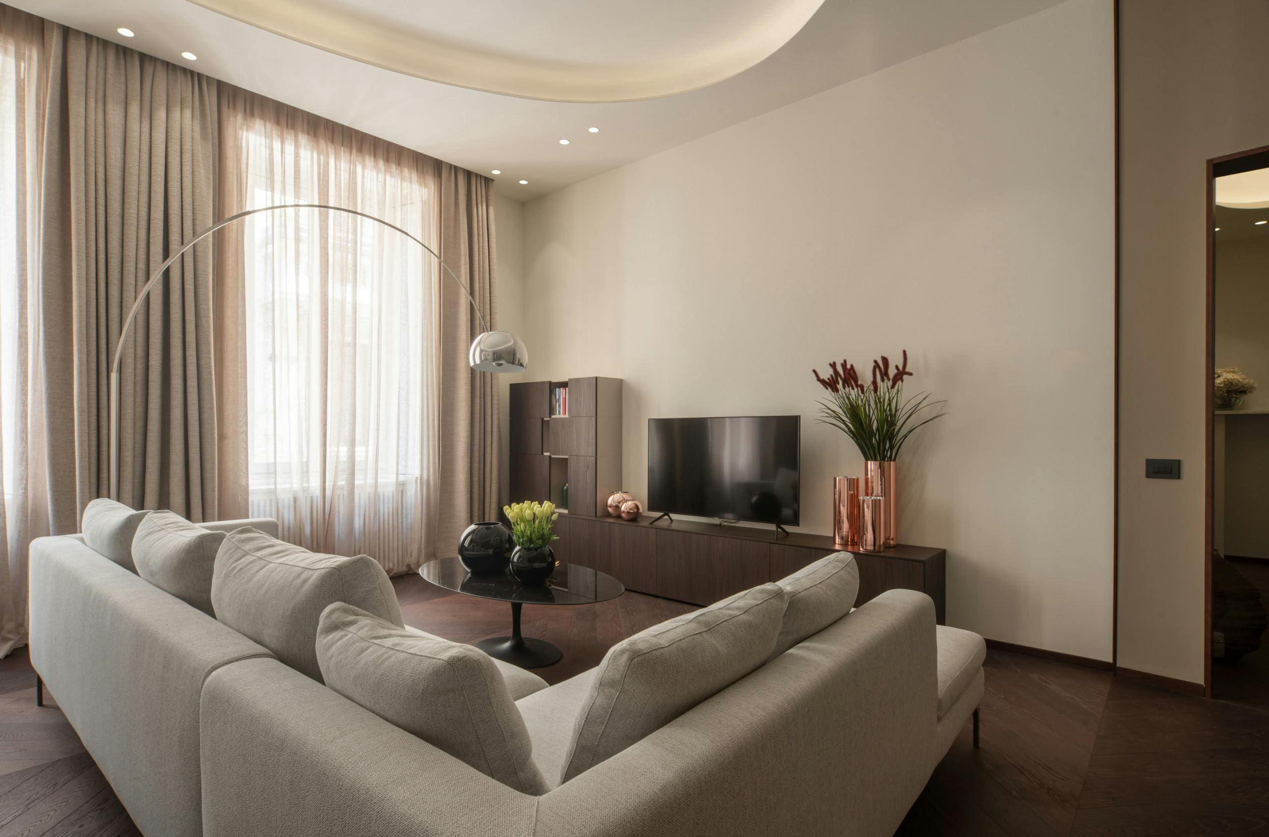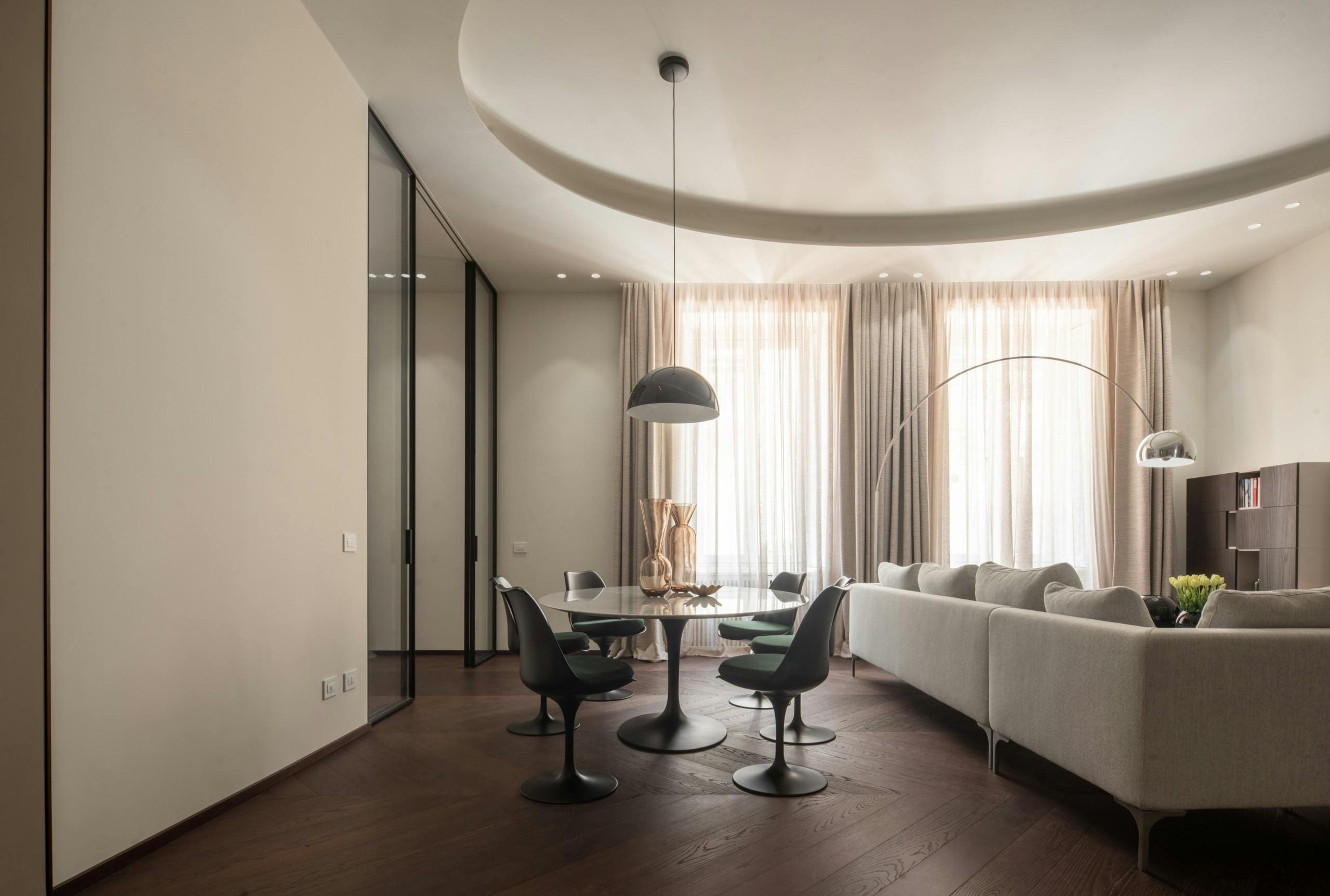 The interiors of this luxury apartment rental in Milan are designed to impress. With three spacious bedrooms and two beautifully appointed bathrooms, it comfortably accommodates up to five guests. The living area boasts a sophisticated design, providing an inviting space to relax after a day of sightseeing. The dining area, complete with a versatile table, doubles as a workspace, ideal for those mixing business with leisure. The fully equipped kitchen features a sociable island, perfect for enjoying breakfasts together before exploring the city.
