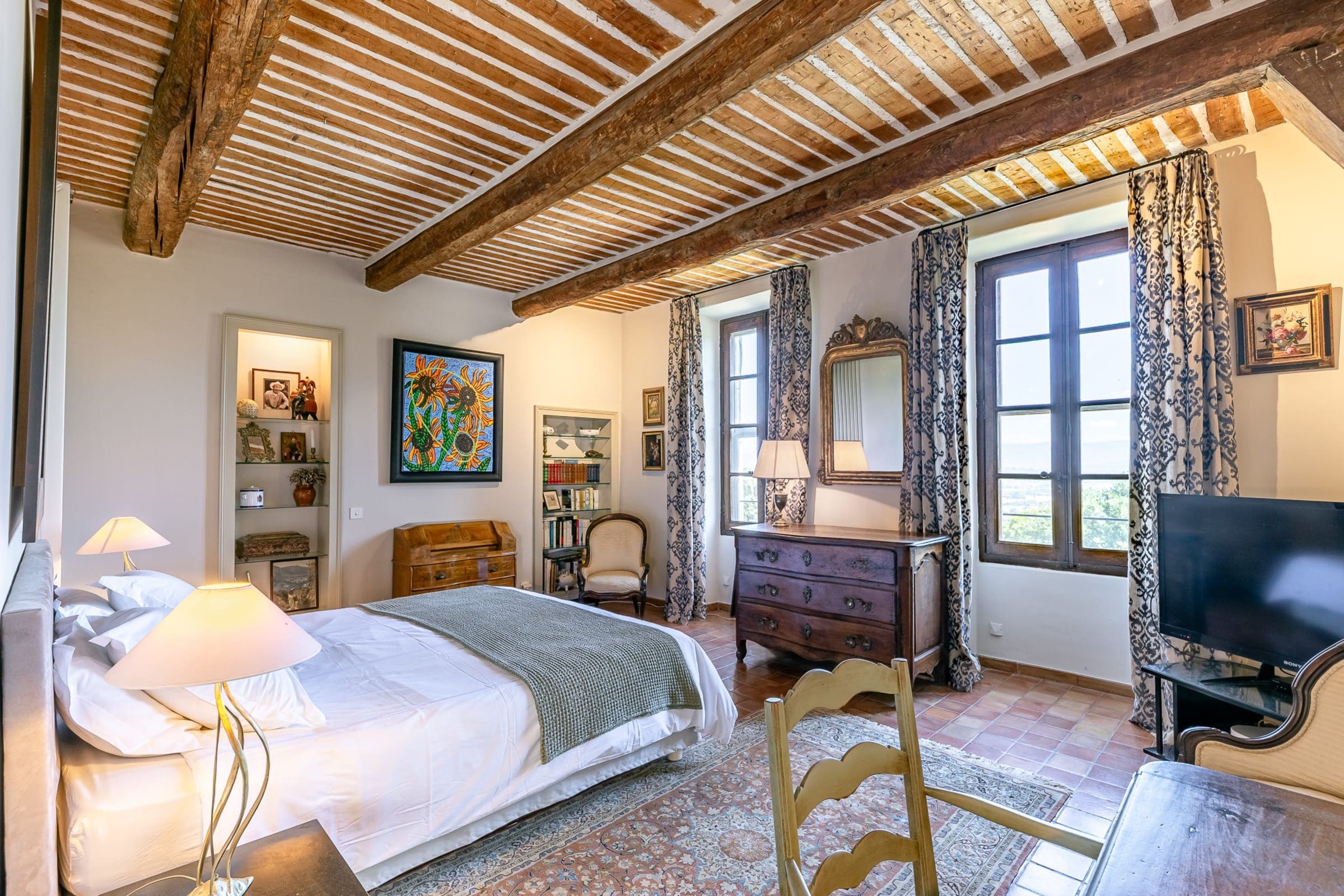 The interior of Château Mistral Vaucluse is an embodiment of elegance and sophistication. With eight beautifully appointed bedrooms and eight bathrooms, this villa accommodates up to 22 guests comfortably. The expansive living areas are complemented by a fully equipped kitchen, perfect for preparing gourmet meals. Unique features include a semi-open mezzanine with two single beds and a super-king bed below, offering versatility for family groups. Three bedrooms offer private entrances, ensuring privacy for all guests.