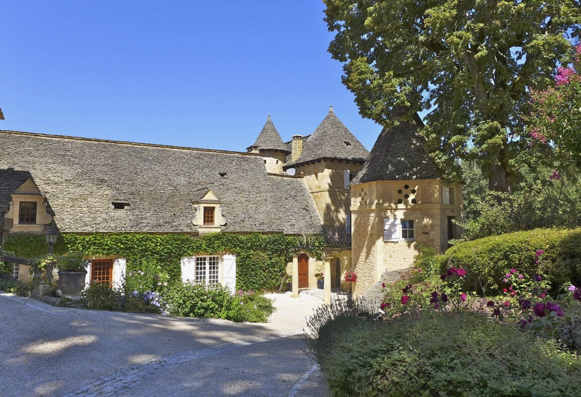 The château dates back to the 17th-century and is typically Périgordian in style with its towers, windows and shutters; look out for the locally sourced limestone, lauzes, protecting the roofs. There’s an air of fairy-tale charm as you wander around the grounds, gazing at the mesmerising château framed by ancient trees and splashes of summer colour from the terracotta pots, hanging baskets and gardens.