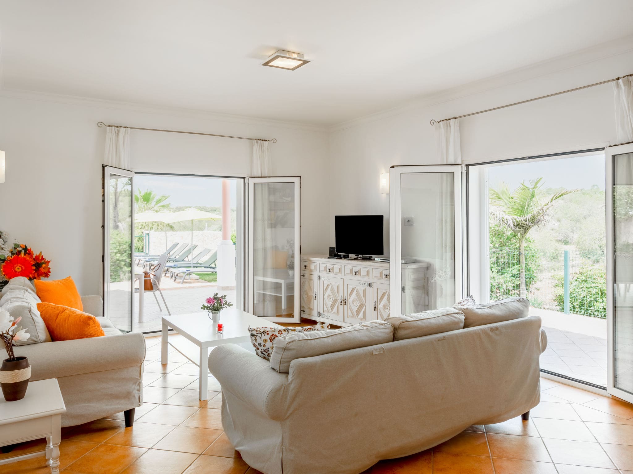 Designed for comfort and relaxation, this single-level villa spans 150 square metres of thoughtfully arranged living space. The heart of the home features a spacious lounge with dining area, complete with air conditioning, international television channels, and direct access to the outdoor terrace. Three well-appointed bedrooms accommodate up to six guests, with two twin bedrooms offering single beds and one master bedroom featuring a French double bed. Each bedroom benefits from individual air conditioning and heating controls for year-round comfort.