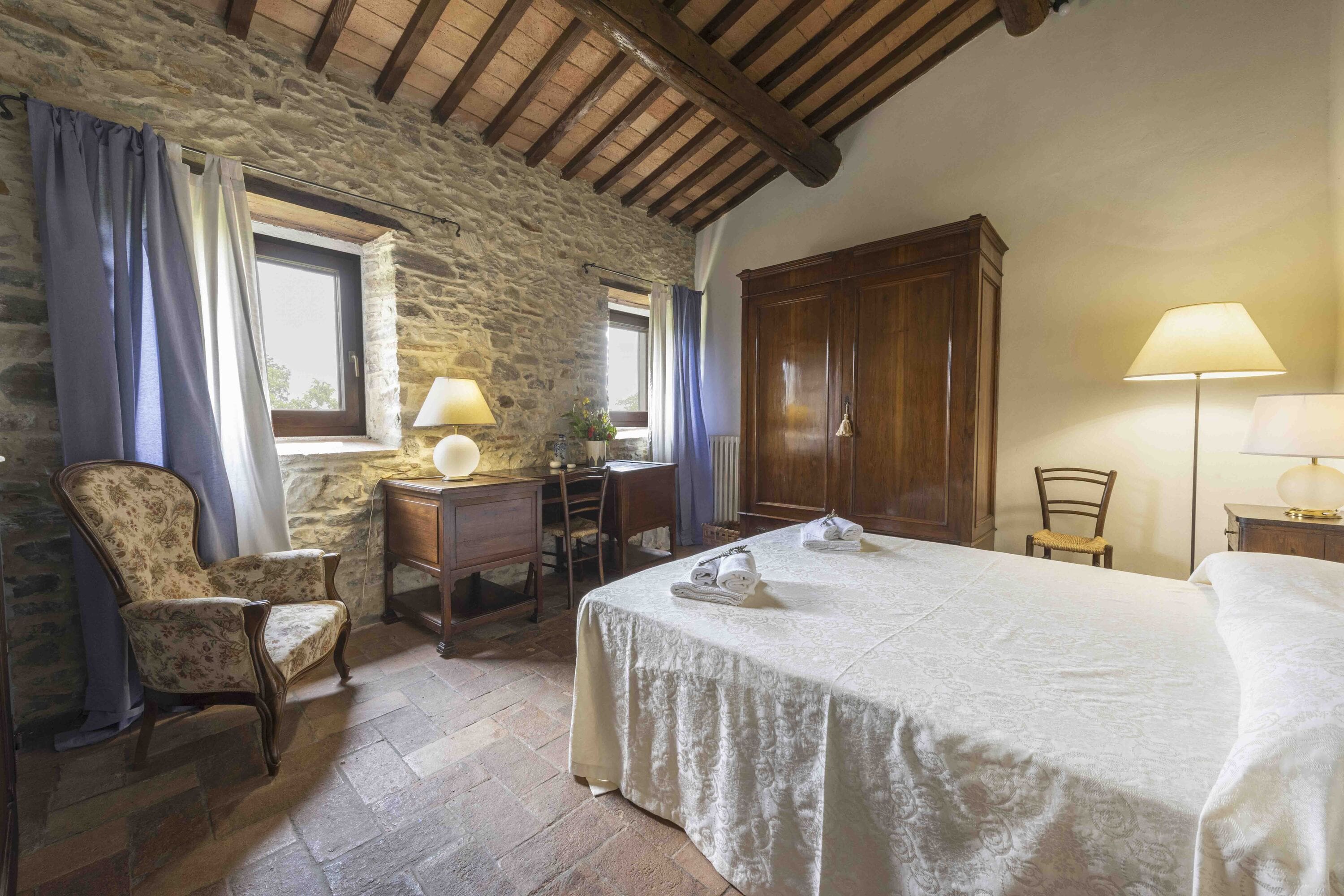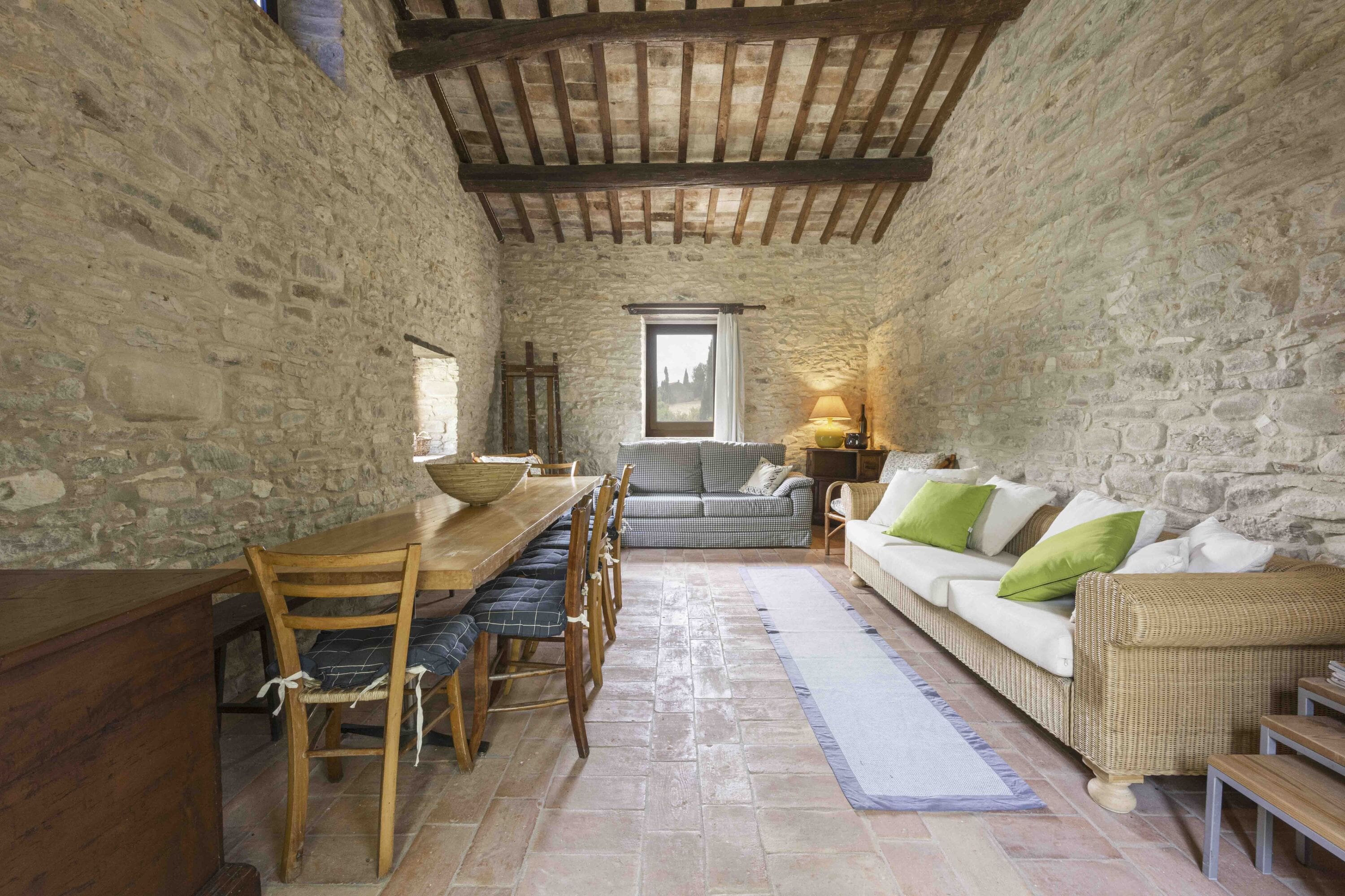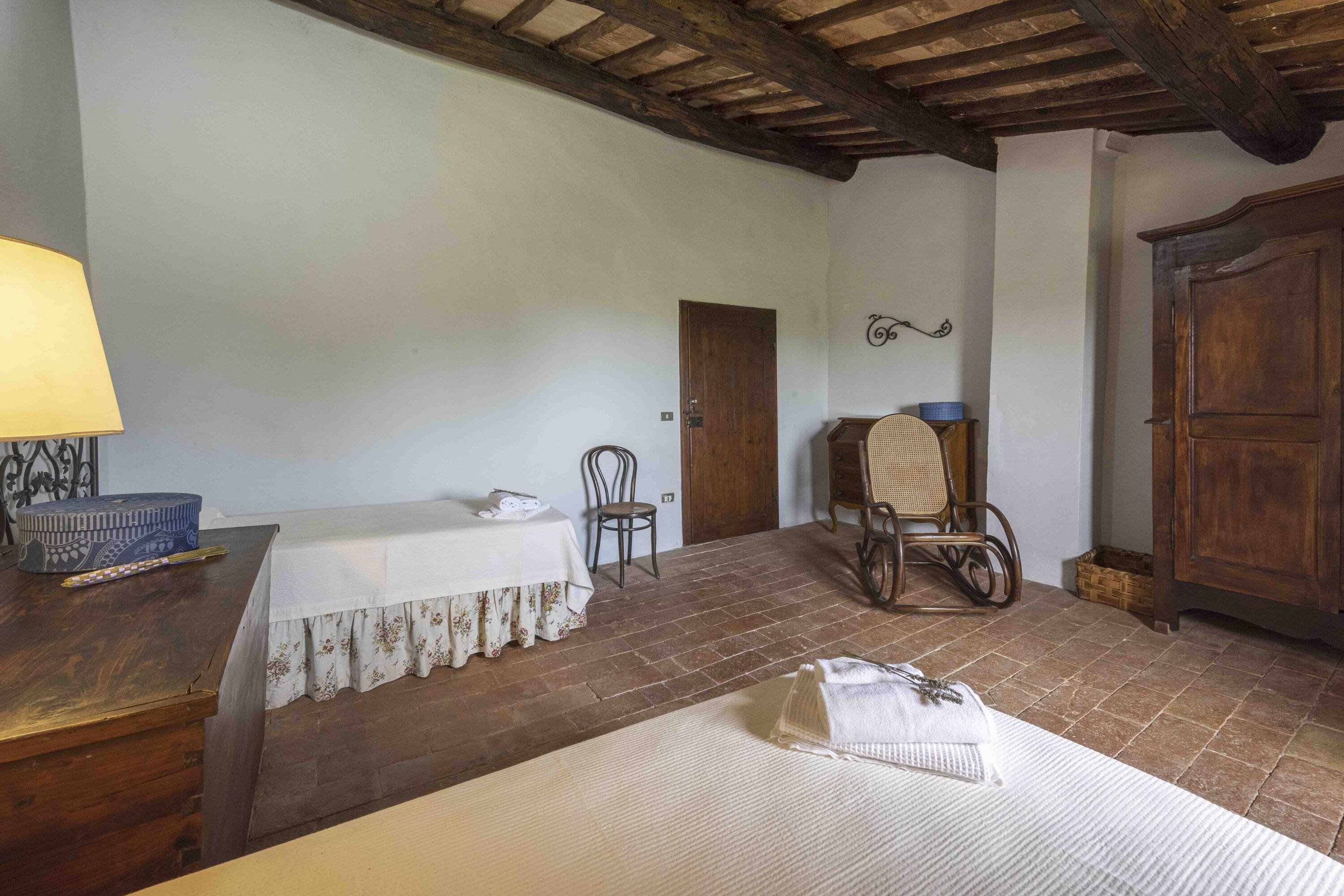 The interior of Fattoria Poggio Arezzo is a testament to classic Tuscan style. Spread over three floors and a mezzanine, the villa boasts five beautifully appointed bedrooms and four bathrooms, comfortably accommodating up to eleven guests. The living spaces are adorned with timber beams and flagstone floors, exuding rustic charm, while the modern kitchen is fully equipped for all your culinary adventures. The attic bedroom, featuring two single beds and a small double bed, is an ideal retreat for children.