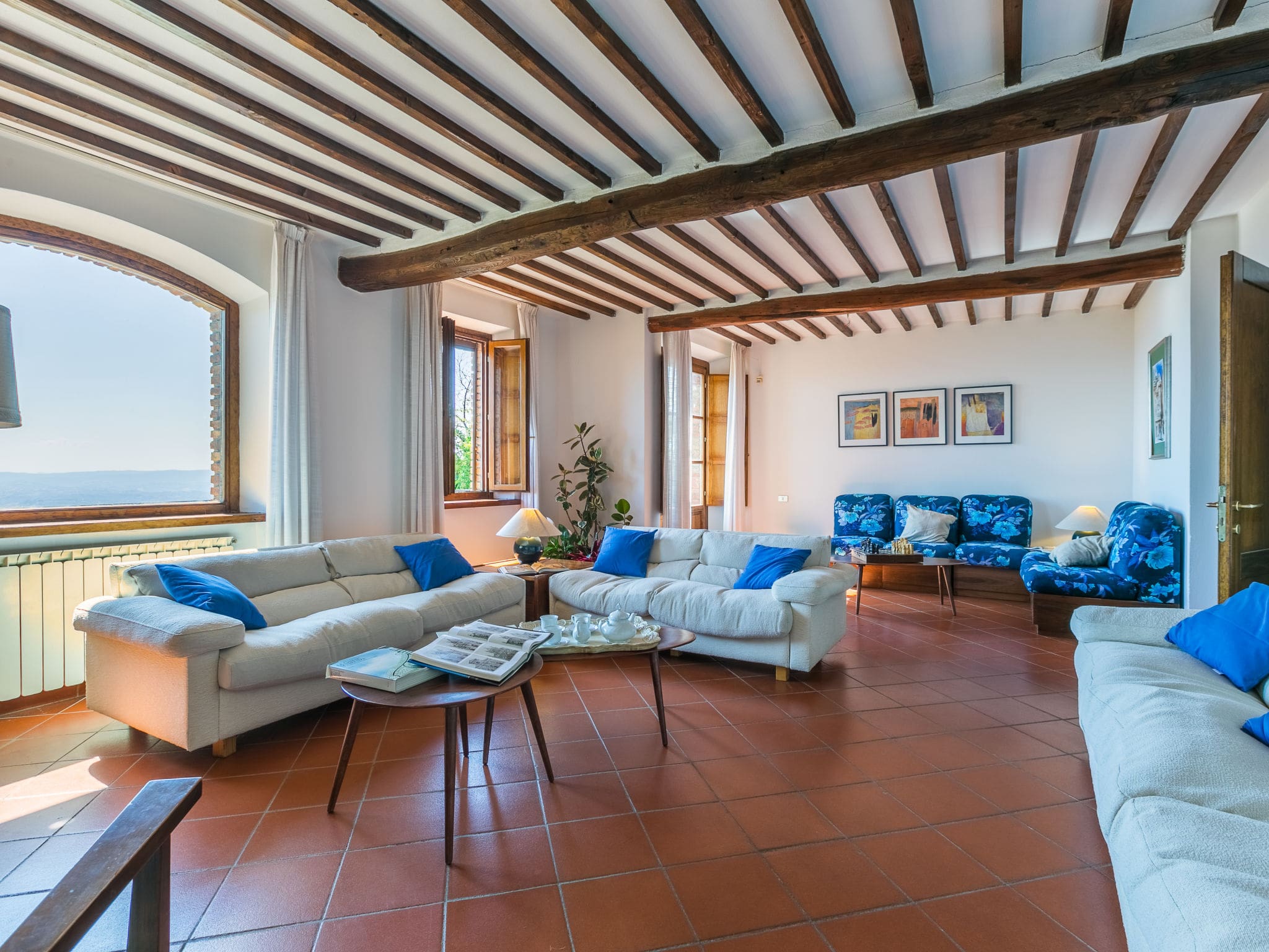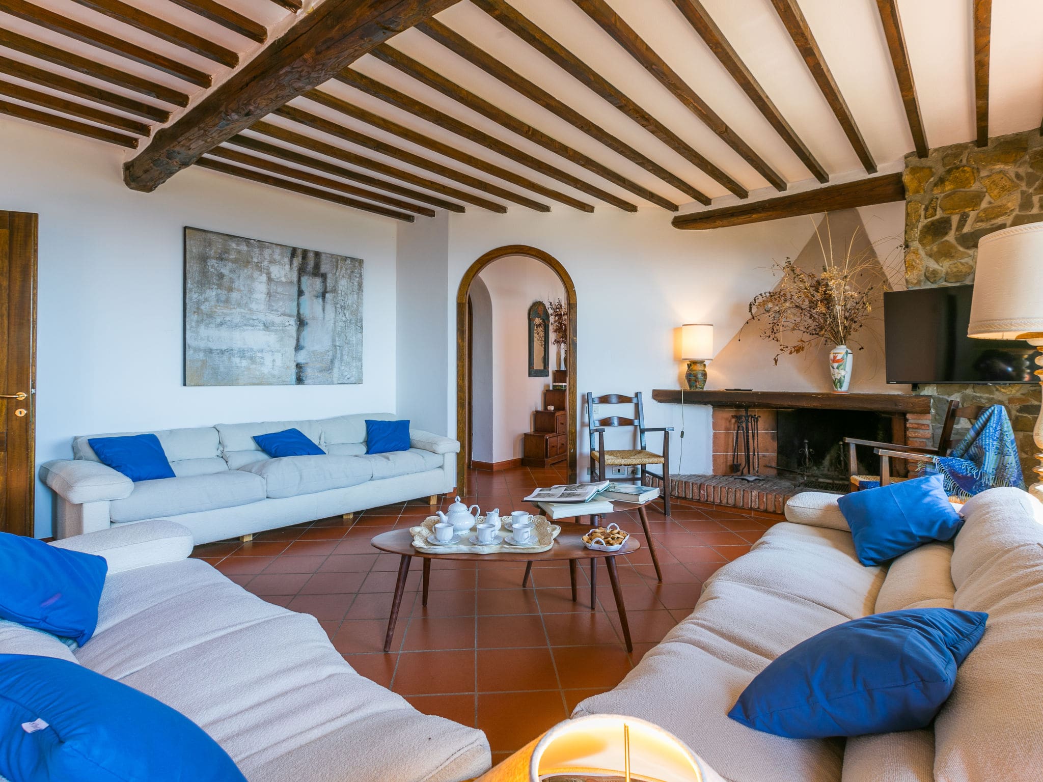The villa welcomes guests through a spacious entrance hall leading to a magnificent living room adorned with panoramic windows and a traditional open-hearth fireplace. The west-facing position captures golden Tuscan sunlight throughout the afternoon, creating an inviting atmosphere for relaxation. Air conditioning throughout ensures comfort during warmer months, while the flat-screen television provides modern entertainment options.