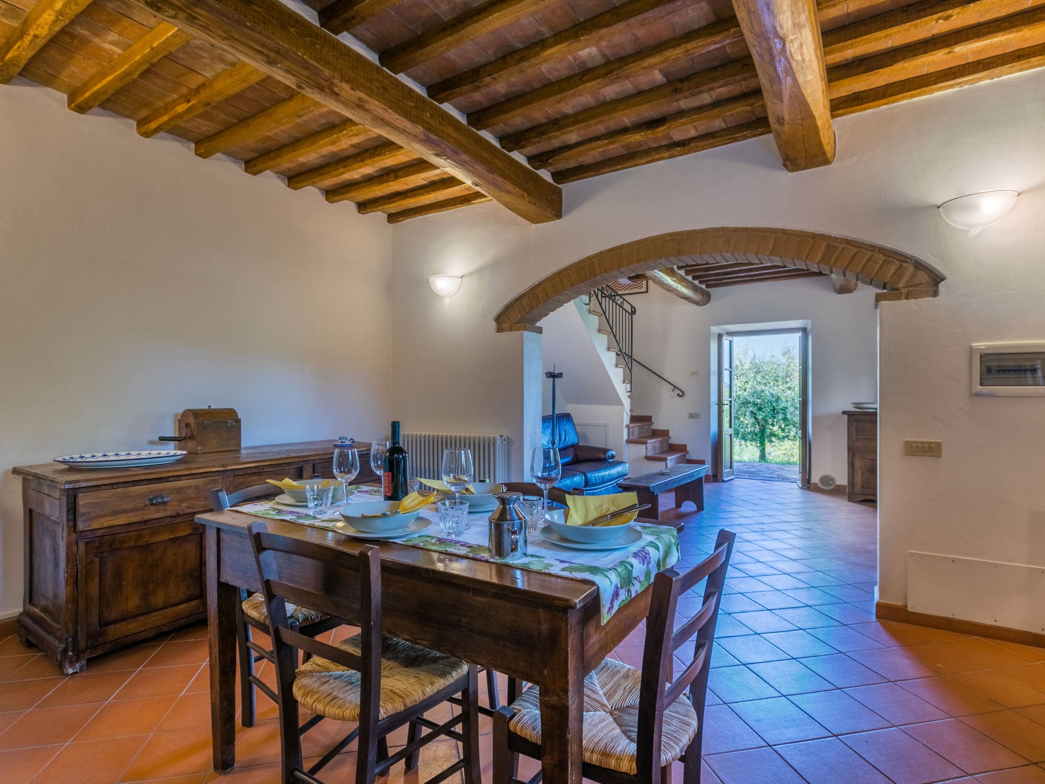 The private 6×12 metre swimming pool takes centre stage in the outdoor spaces, available from mid-May to mid-October. Surrounded by the natural landscape of meadows and vineyards, the pool area includes an outdoor shower and comfortable deck chairs for lazy afternoons under the Tuscan sun. Three terraces and a patio provide various outdoor dining and relaxation options, complete with barbecue facilities and terrace furniture.