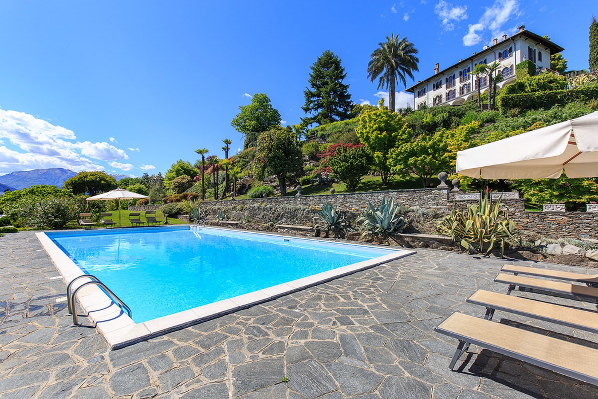 The outdoor areas are a sanctuary of serenity. The private swimming pool, operational from mid-May to the end of September, invites you to unwind amid lush gardens and towering palm trees. Terraces provide perfect spots for al fresco dining or enjoying an evening aperitif while watching the sun set over the lake. The mature garden paths, though unlit at night, add a touch of rustic charm, encouraging leisurely strolls during the day.