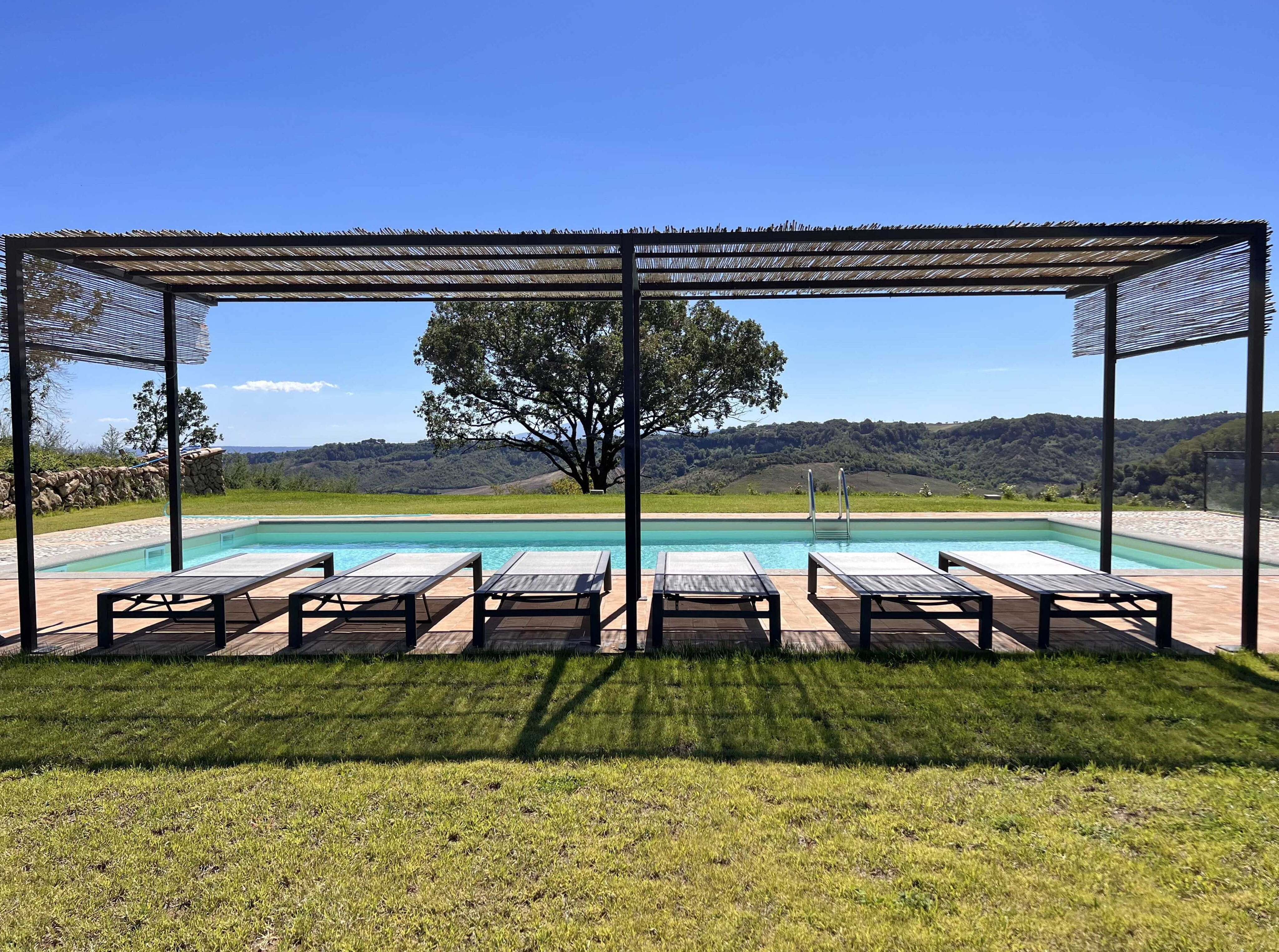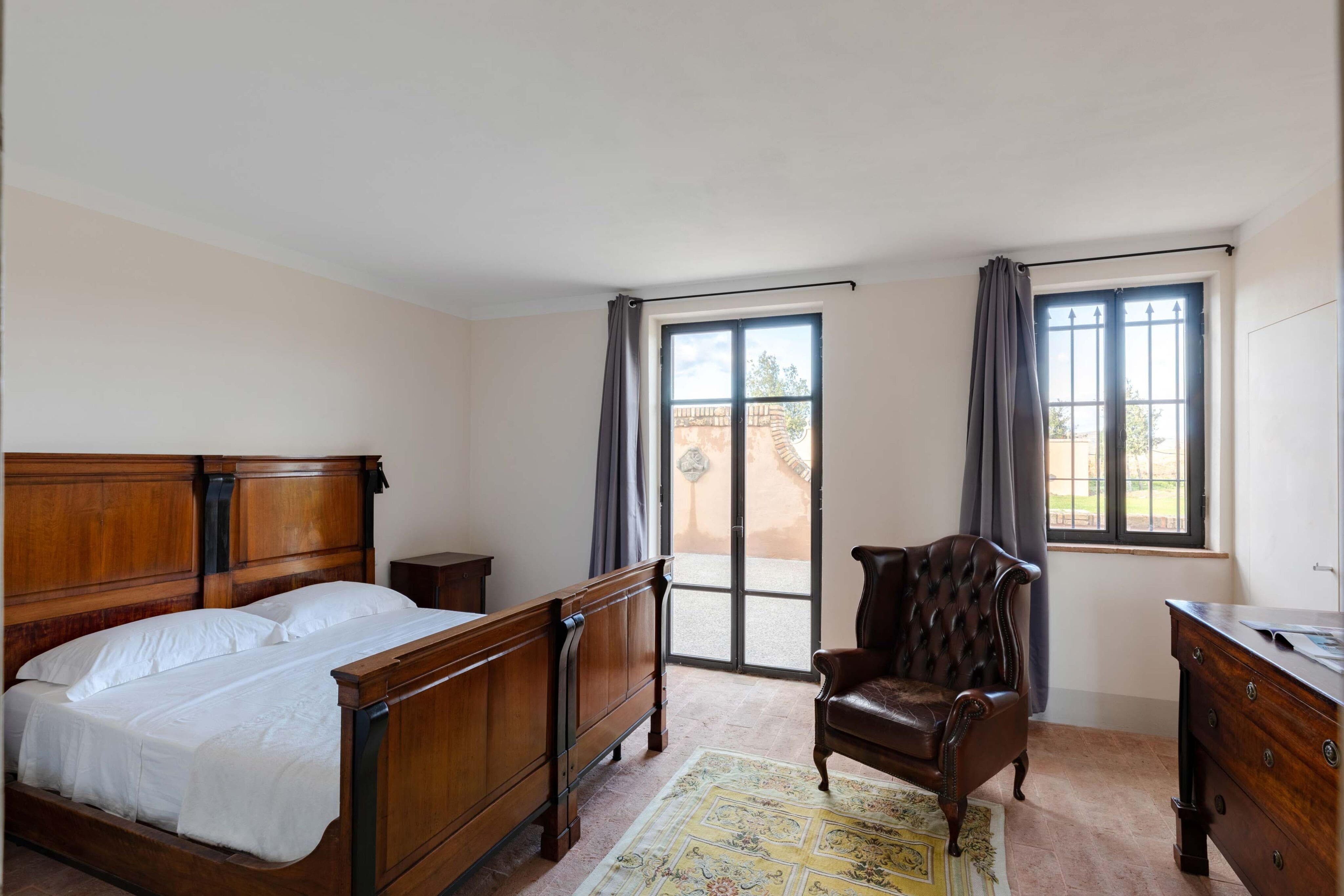 The outdoor spaces are equally captivating, with a sparkling swimming pool set against a backdrop of rolling Tuscan hills. Terraces and gardens surround the property, offering numerous spots for relaxation and al fresco dining. The panoramic views of the countryside provide a tranquil setting for unwinding and soaking up the sun.