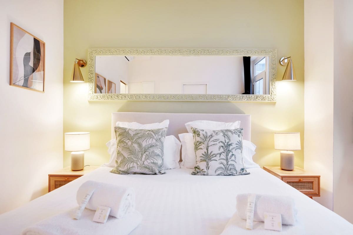 Step inside to discover a beautifully appointed interior designed to captivate. The living room is a haven of relaxation, perfect for unwinding with a morning coffee as sunlight streams through the large windows. The apartment features two spacious bedrooms, each with its own en-suite bathroom, ensuring privacy and convenience for all guests. The second bedroom can be customized to suit your needs, transforming from a king-size bed to two singles upon request. A stylish sofa bed in the living room accommodates two additional guests, making this apartment ideal for families or small groups.