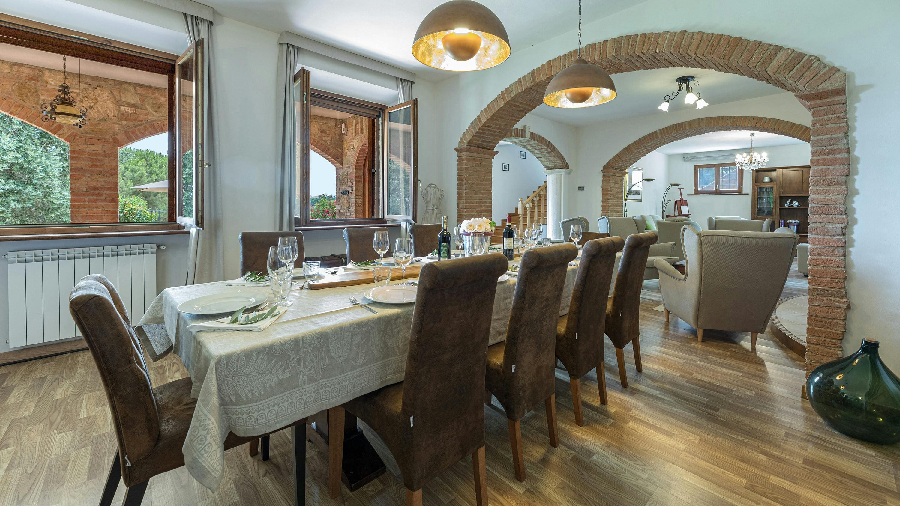 Step inside Fattoria Collina Montepulciano to discover a harmonious blend of traditional Tuscan architecture and modern amenities. With five elegantly appointed bedrooms and four beautifully designed bathrooms, this villa accommodates up to ten guests comfortably. The rustic charm of the interior is enhanced by exposed wooden beams, terracotta floors, and tasteful furnishings. The well-equipped kitchen invites culinary exploration, and the spacious living areas provide ample space for relaxation and entertainment. Air conditioning ensures comfort throughout the bedrooms and living room, making it an ideal stay during the warmer months.