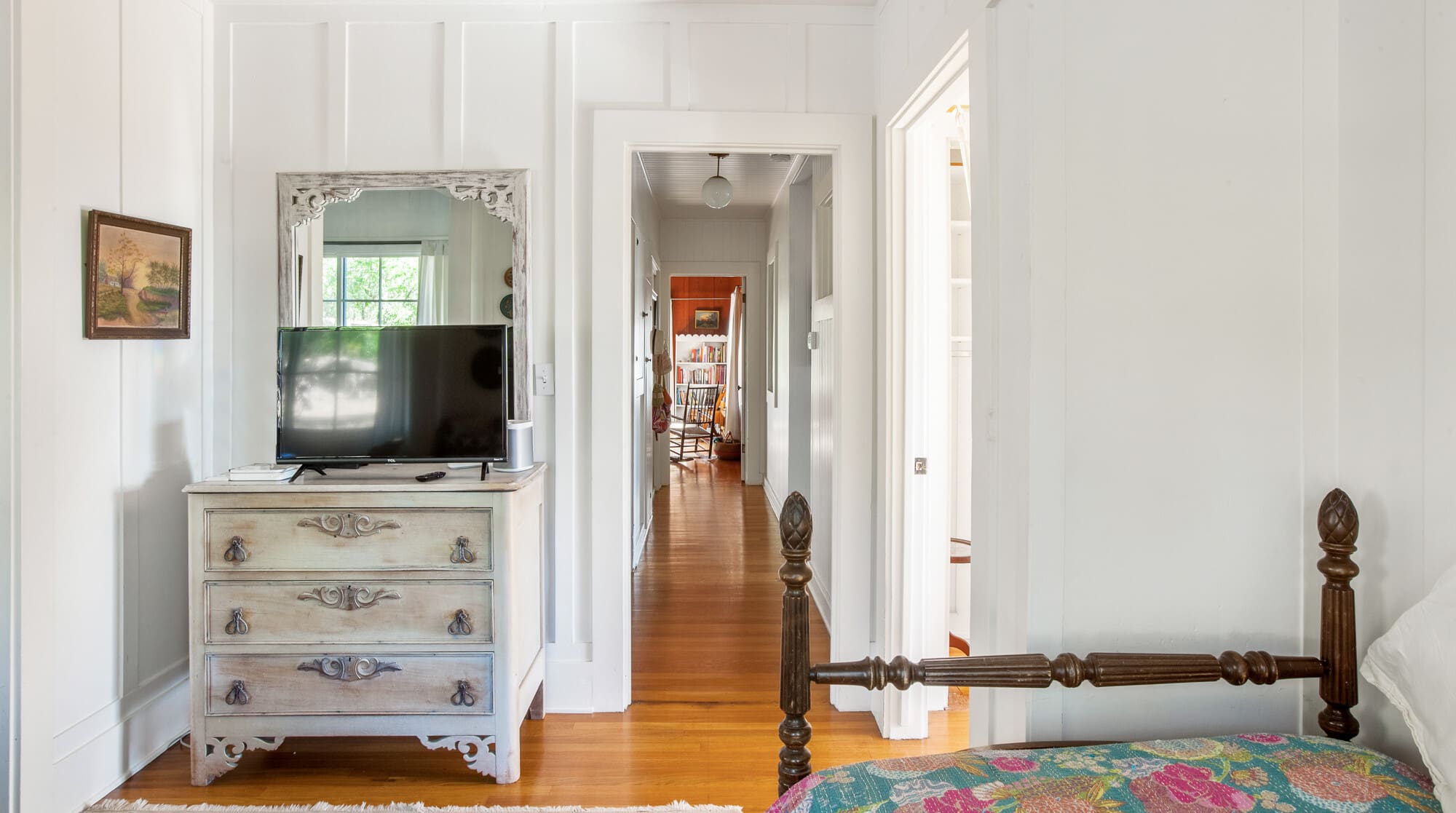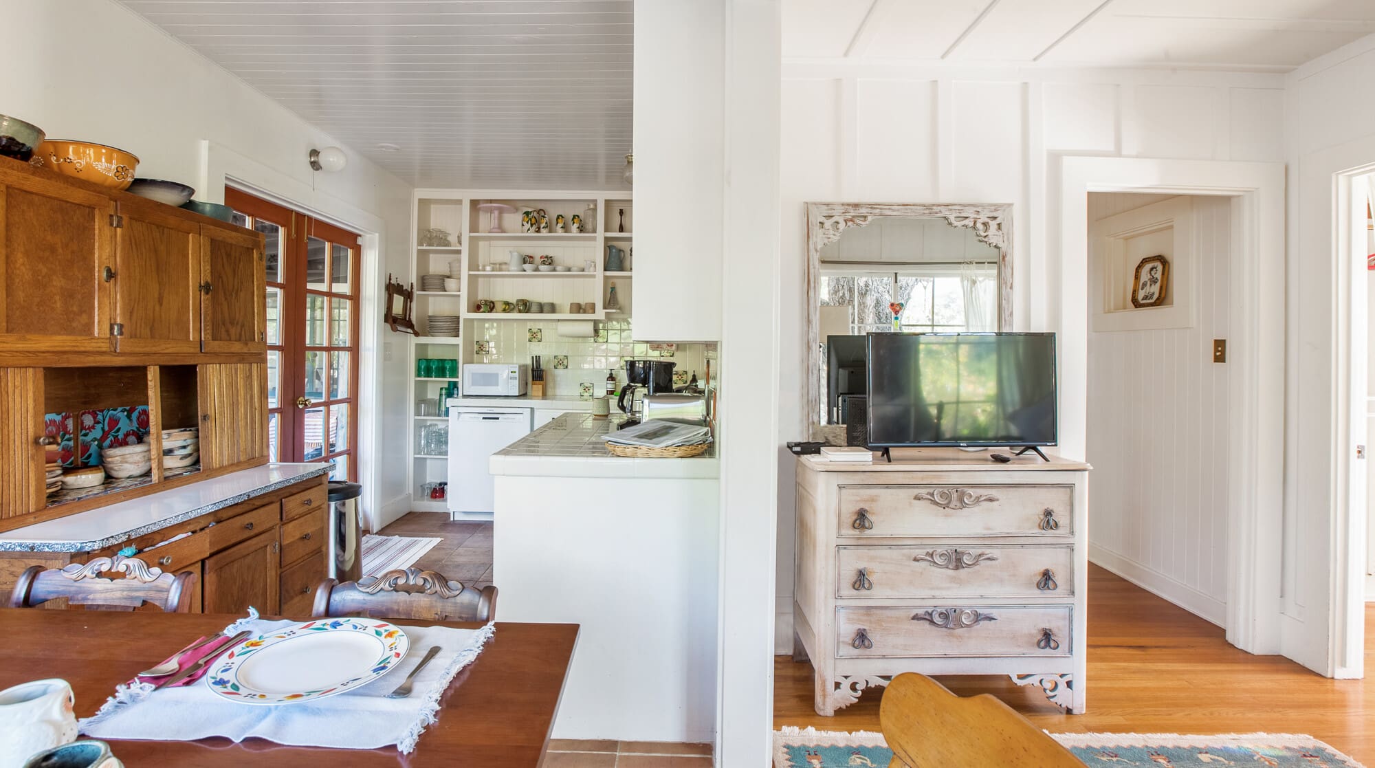 Step inside to find a delightful blend of rustic charm and modern comfort. The lodge features three inviting bedrooms, each exuding its own unique character. The main living area is adorned with warm wood paneling and vintage furnishings, creating a cozy atmosphere. The kitchen, with its retro dressers and modern appliances, is perfect for preparing family meals. The third bedroom, a converted artist’s studio, is bathed in natural light, offering a tranquil space even if it lacks air conditioning.