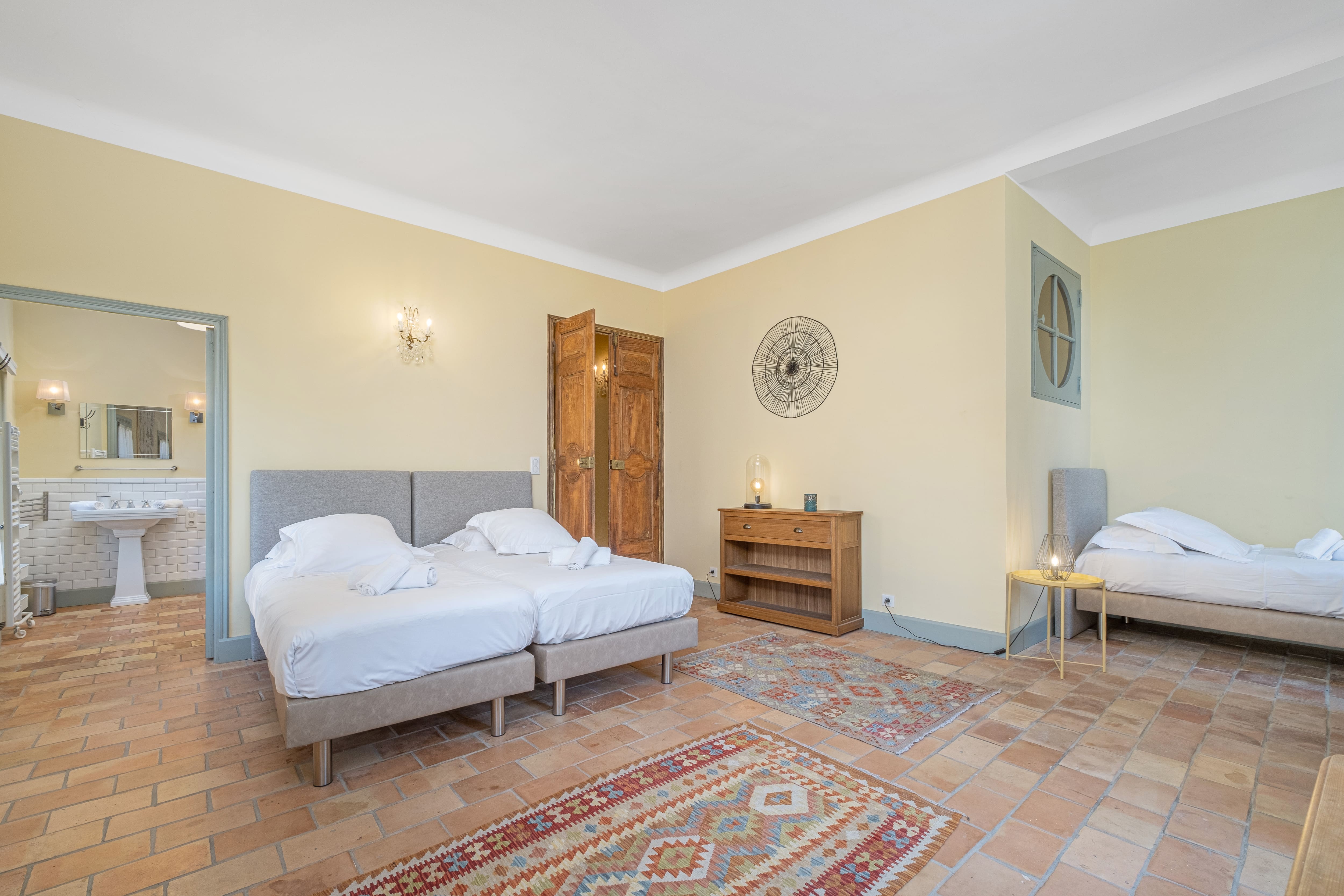 Step inside this luxurious villa to find a harmonious blend of traditional French charm and modern comforts. The interior boasts spacious living areas decorated with elegant furnishings and artistic touches that reflect the region’s rich cultural heritage. The well-equipped kitchen, complete with a large range, invites culinary adventures, while the dining areas, both indoor and outdoor, provide the perfect setting for memorable meals. Each of the six bedrooms is a serene sanctuary, offering air-conditioned comfort and tasteful decor. Note that air conditioning is available only in the bedrooms, with the exception of the dormitory room featuring three single beds.