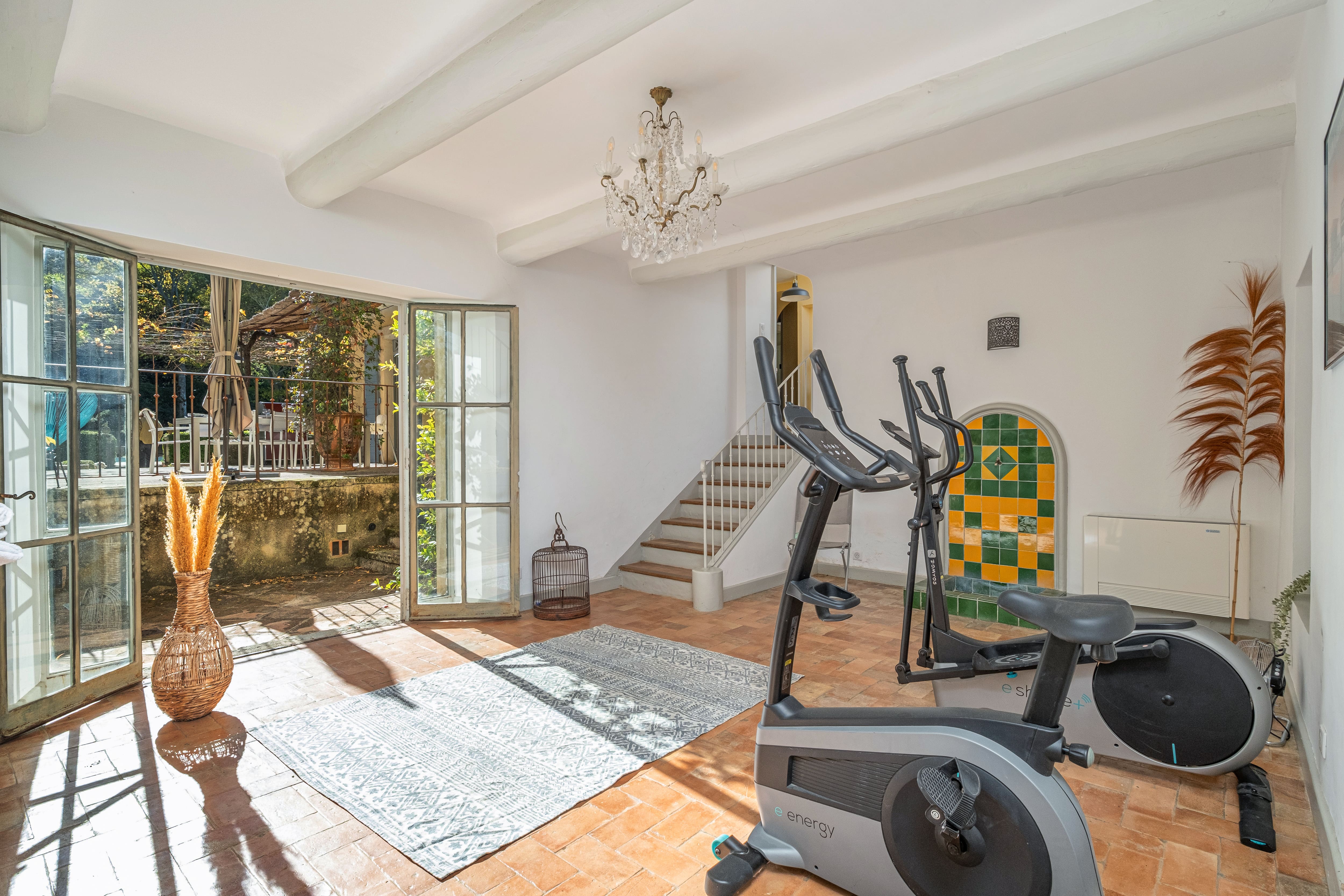 The outdoor spaces of this villa are a true oasis. The expansive gardens, filled with lavender, roses, and olive groves, provide a picturesque backdrop for leisurely strolls and alfresco dining. The inviting swimming pool is perfect for a refreshing dip, while the gym offers a space for fitness enthusiasts. With breathtaking views of the surrounding countryside, guests can unwind and soak in the beauty of Vaucluse.