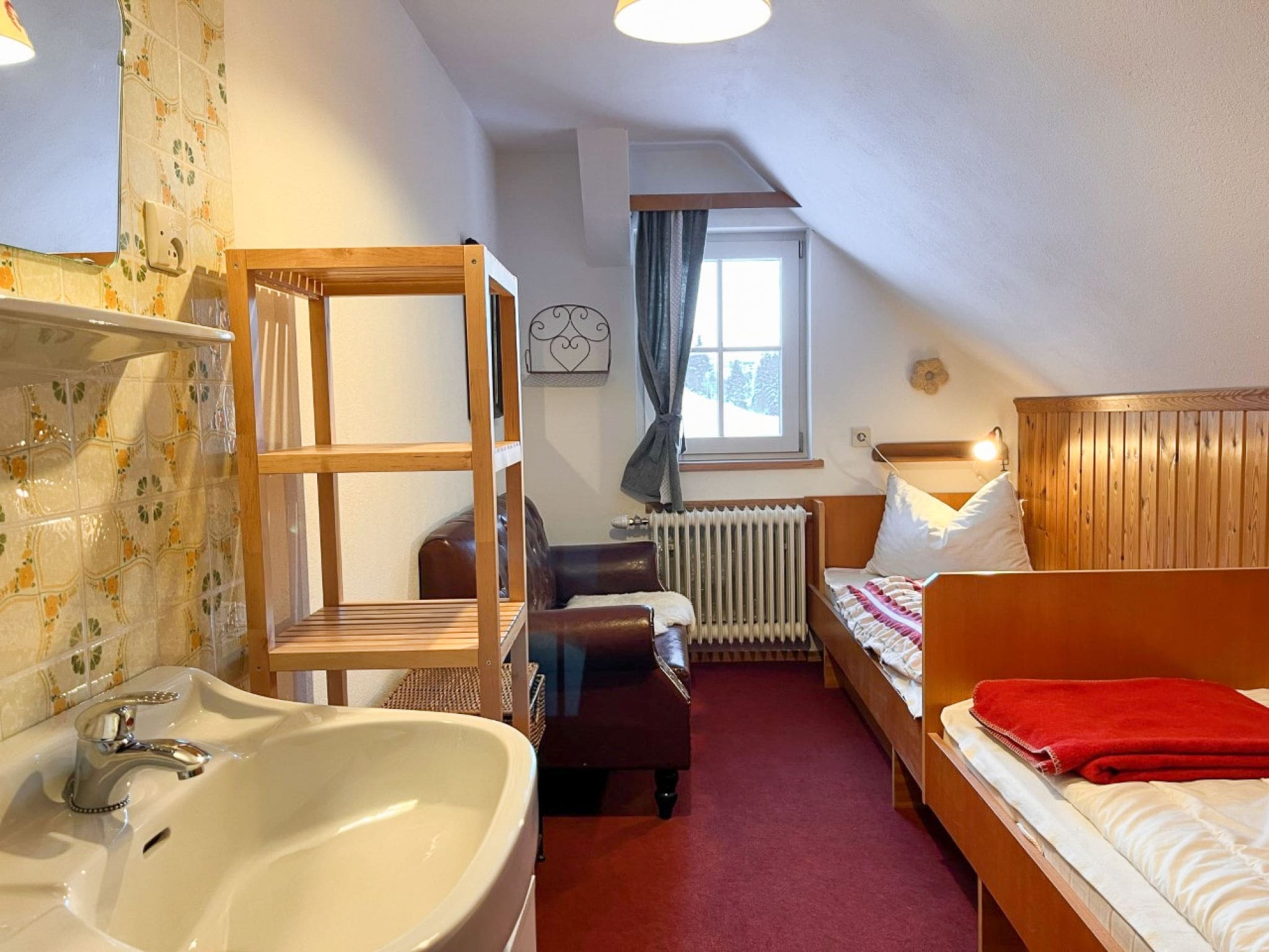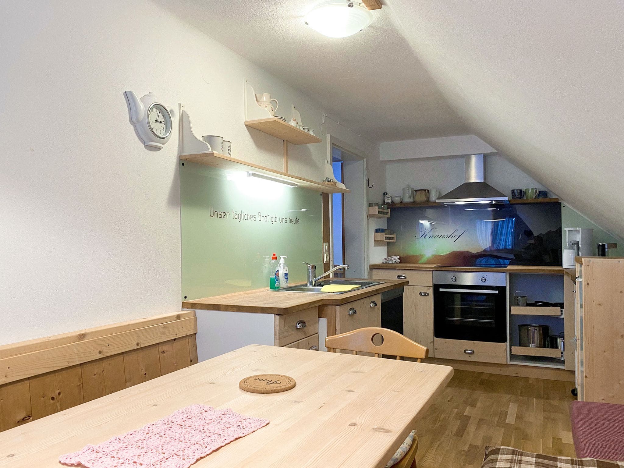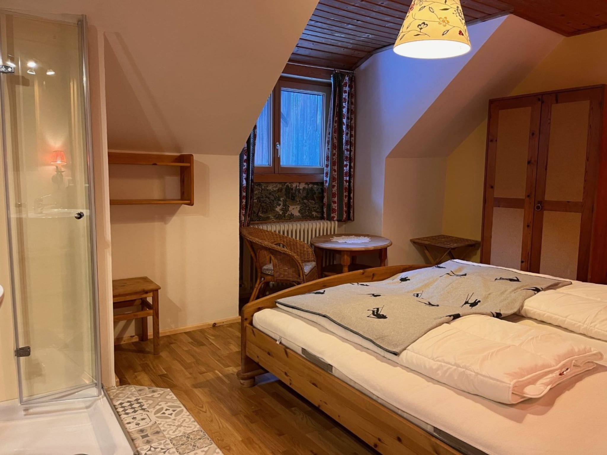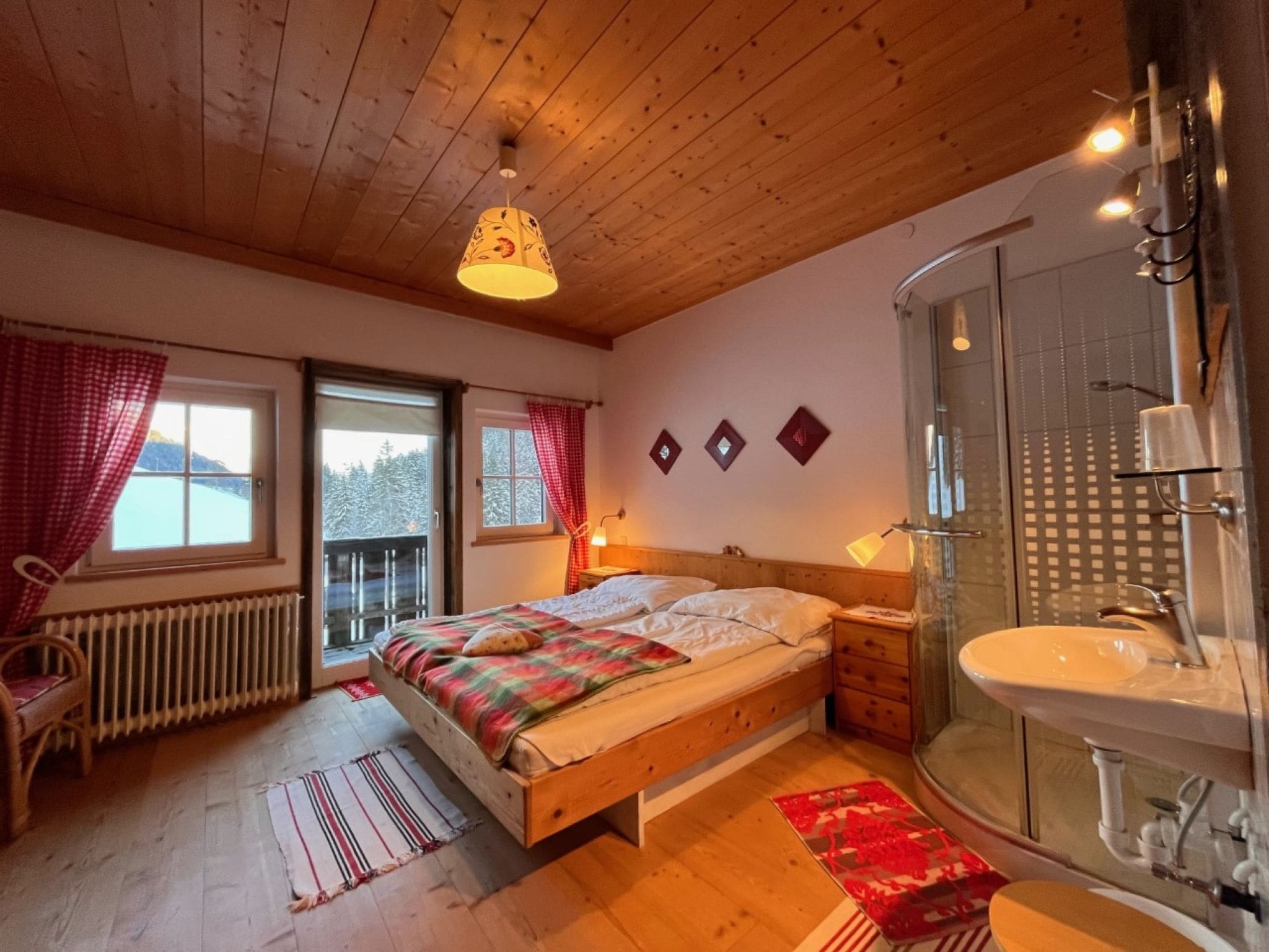 This beautifully appointed farmhouse apartment spans 110 square metres across the second floor of a historic working farm, featuring five thoughtfully designed bedrooms that accommodate up to 11 guests in comfort and style. Each of the five bedrooms includes its own hand basin and shower facilities, with three rooms offering private access to sun-drenched balconies where guests can wake to spectacular mountain vistas and fresh alpine air.