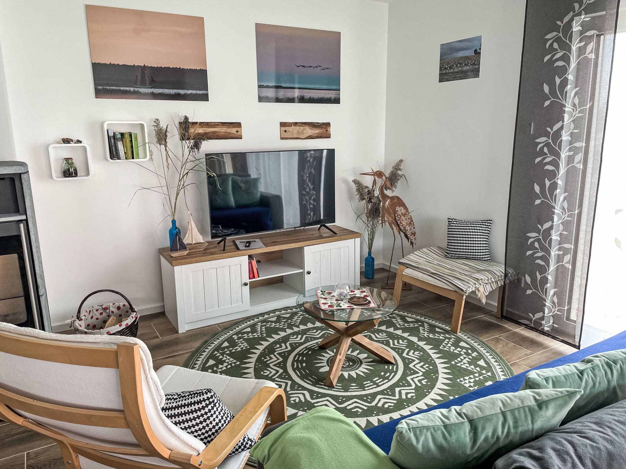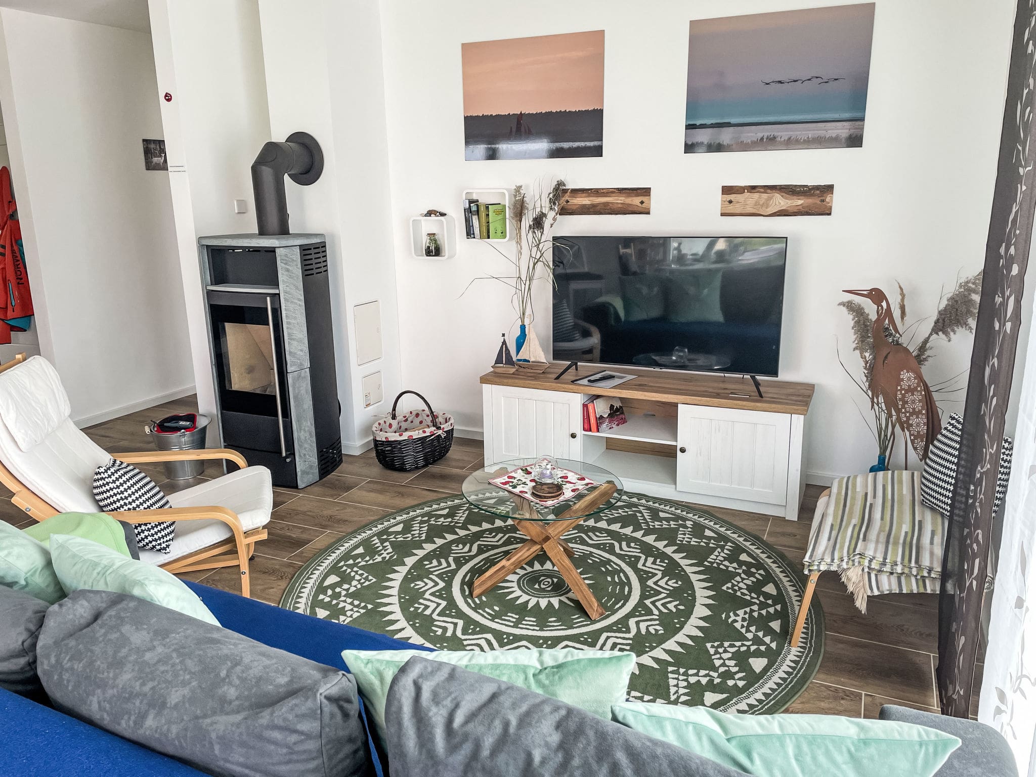 The 108-square-meter single-level layout creates a seamless flow between indoor and outdoor living spaces. The heart of the home features an open-plan living and dining area anchored by a beautiful Scandinavian wood stove, perfect for cozy evenings after days spent exploring the nearby Saaler Bodden lake. The fully equipped modern kitchen includes premium appliances, from a dishwasher to an electric coffee machine, making meal preparation effortless. Three well-appointed bedrooms accommodate up to six guests, with the master suite featuring an ensuite bathroom, while a second full bathroom serves the remaining bedrooms. Contemporary furnishings throughout reflect the clean lines and natural materials characteristic of Nordic design.