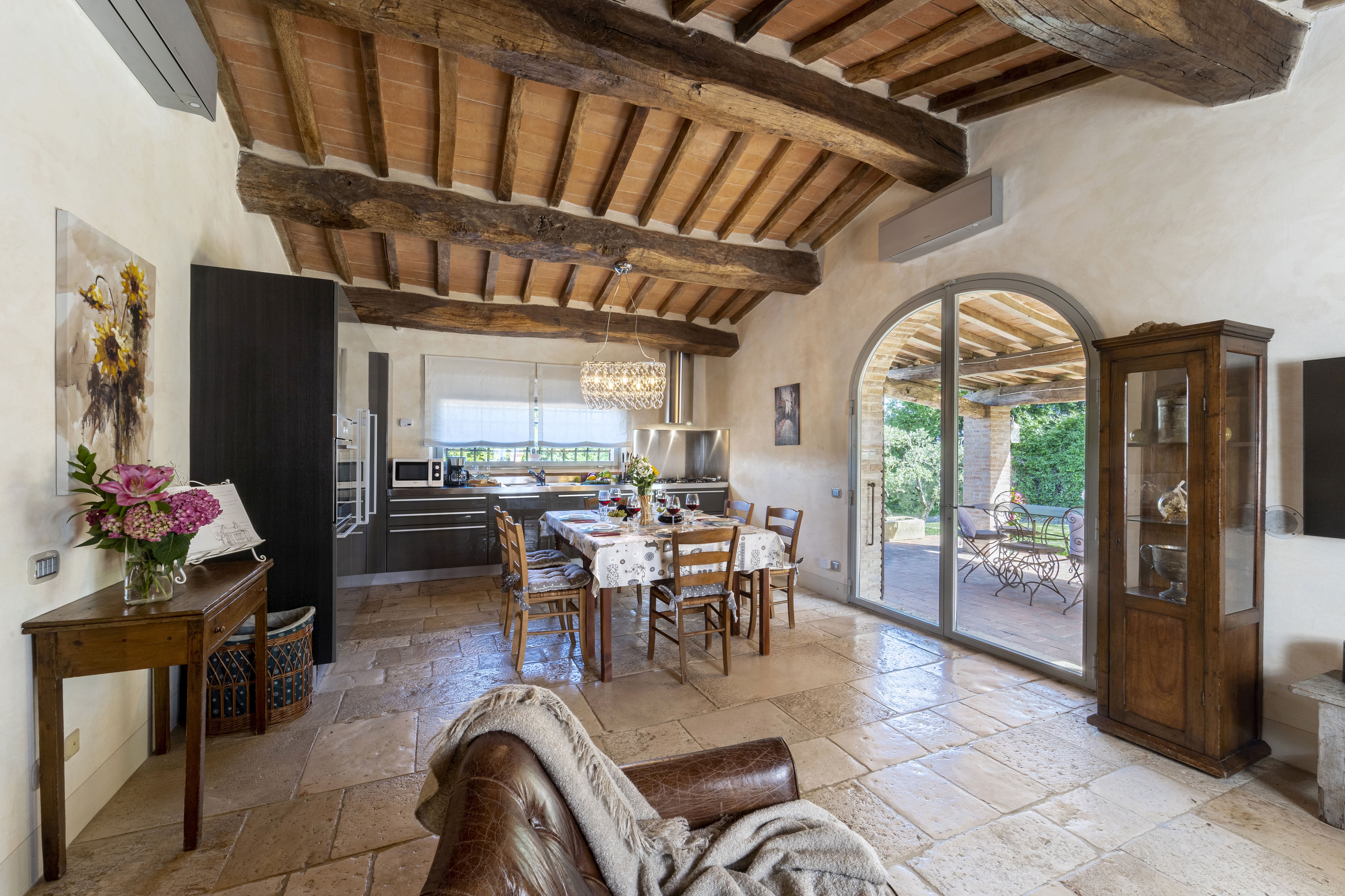 The outdoor spaces are a true highlight, with a private swimming pool available from late April to early October. Surrounded by lush gardens and breathtaking views of the Tuscan countryside, this is the ideal spot for a refreshing swim or sunbathing under the Italian sun. The alfresco dining area invites you to savor meals with a backdrop of rolling hills, creating a truly magical dining experience.