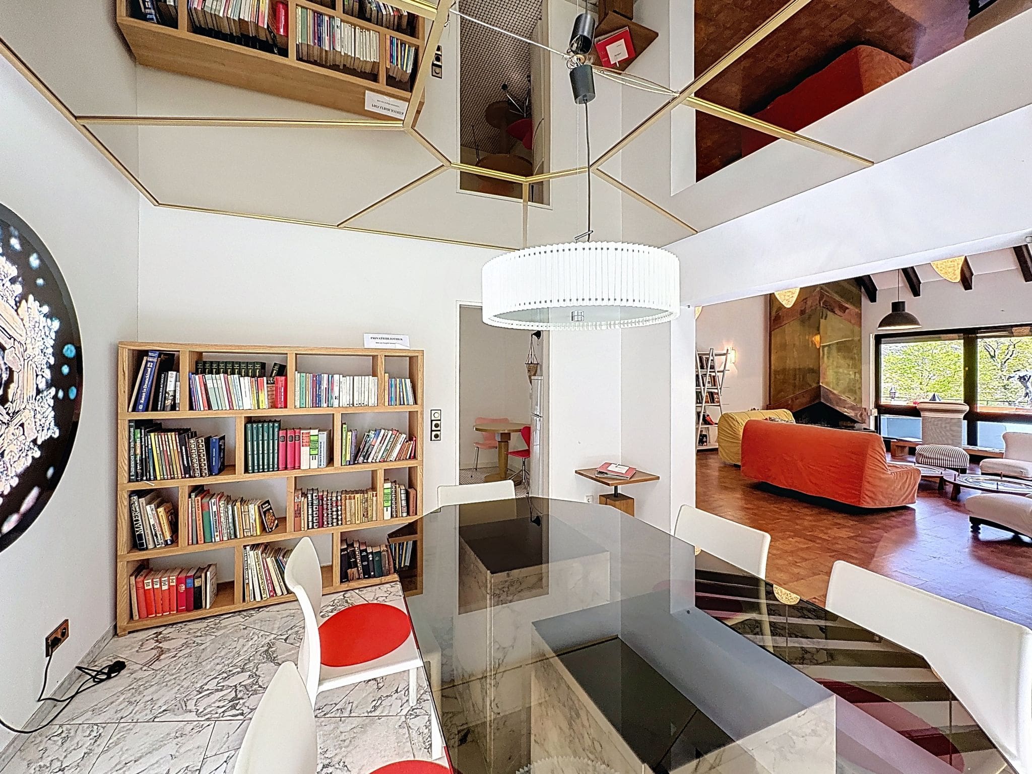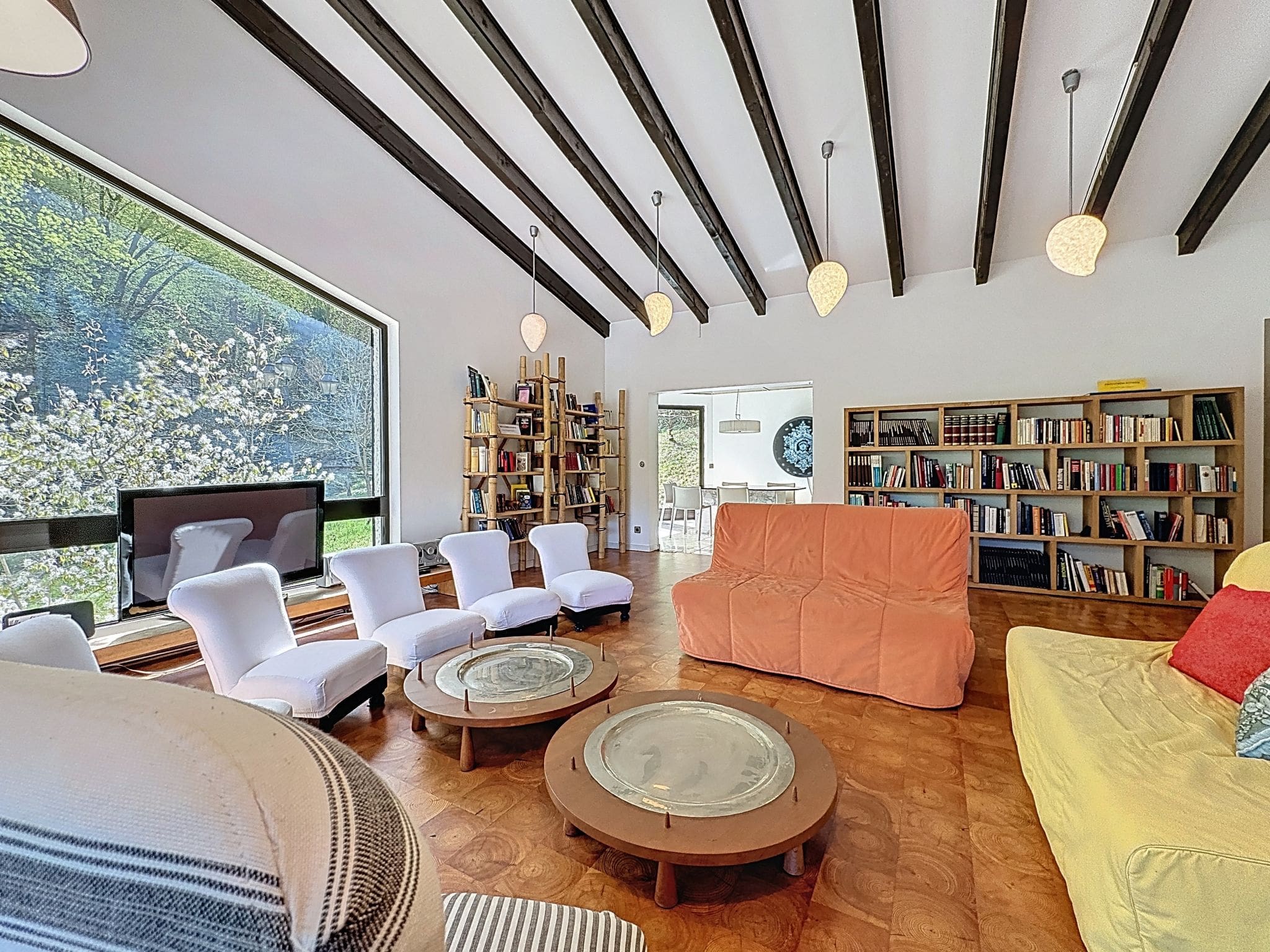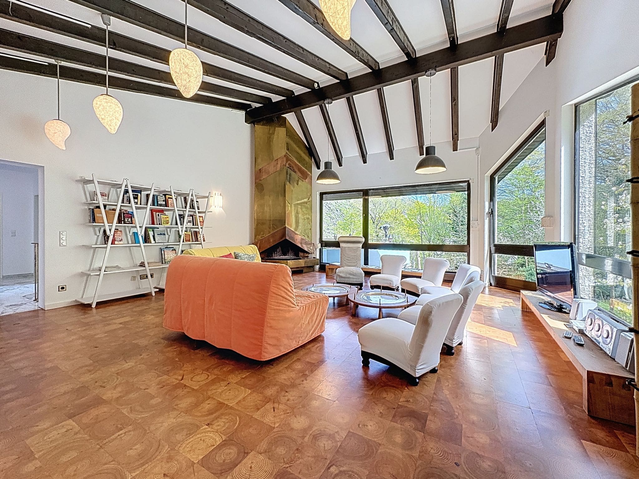 The villa’s striking modern architecture creates a sophisticated sanctuary across two thoughtfully designed levels. Four beautifully appointed bedrooms accommodate up to ten guests in supreme comfort, featuring luxurious double beds and premium linens. The master suite enjoys a private ensuite, while additional bathrooms ensure convenience throughout your stay. The heart of the home reveals itself in the spectacular open-plan living and dining area, where soaring ceilings and floor-to-ceiling windows frame views of the surrounding forest and meadows. An impressive open-hearth fireplace provides a cozy focal point, while the adjacent library corner offers a quiet retreat for evening reading.