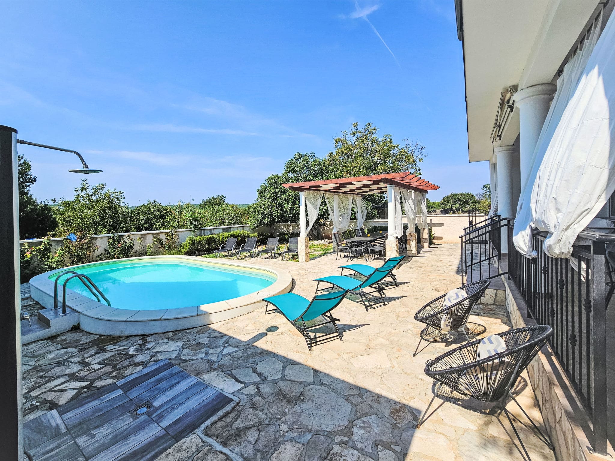 The villa’s outdoor spaces truly shine, featuring a private angular swimming pool measuring seven by three meters. Available from June through early September, the pool provides refreshing respite during warm Croatian summers. The surrounding terraces total 50 square meters of covered and open space, furnished for dining and relaxation. An outdoor shower allows for convenient poolside refreshment, while the built-in barbecue creates perfect opportunities for alfresco dining under the stars.
