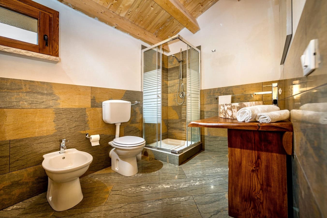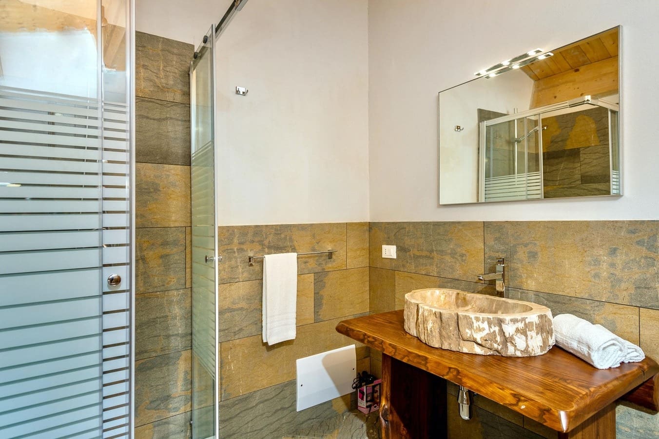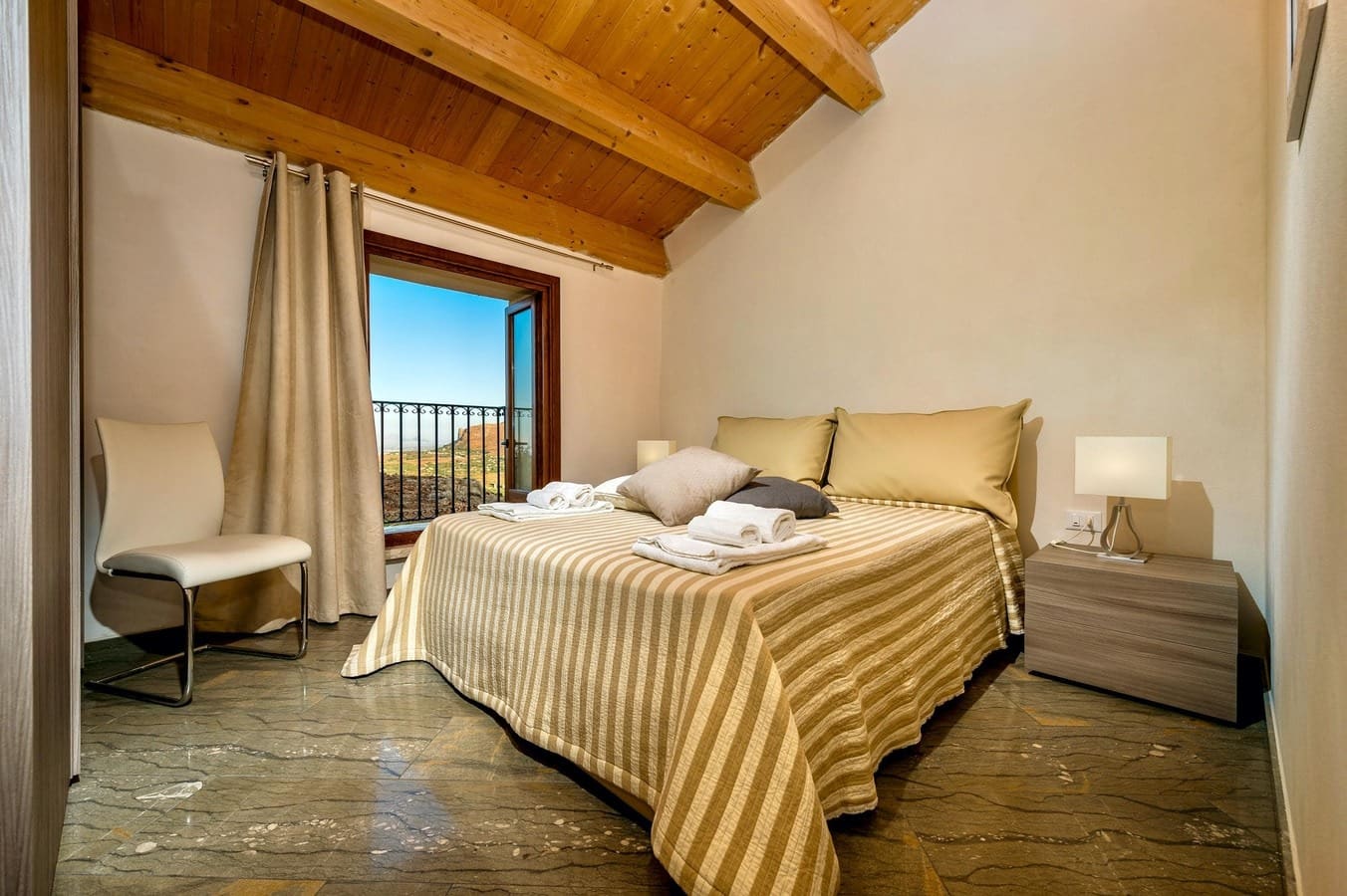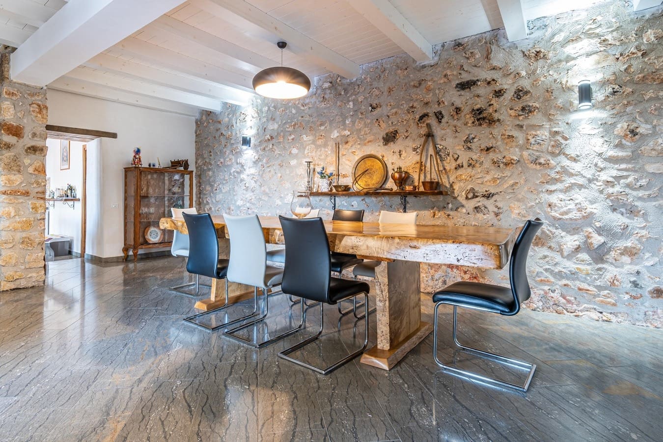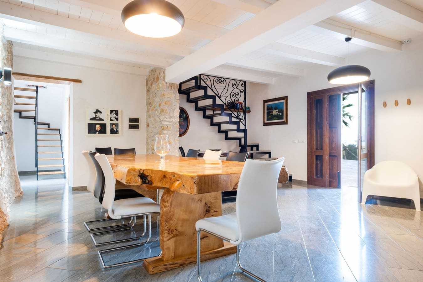 The interior of this luxury apartment rental in Sicily seamlessly combines traditional Sicilian elements with contemporary design. Featuring exposed stonework and wooden beams, the living spaces exude warmth and character. The five spacious bedrooms provide ample accommodation for up to 12 guests, while the four well-appointed bathrooms ensure convenience and privacy. The fully-equipped kitchen and open-plan dining area are perfect for enjoying meals together, and the comfortable lounge offers a cozy spot to relax after a day of exploring.