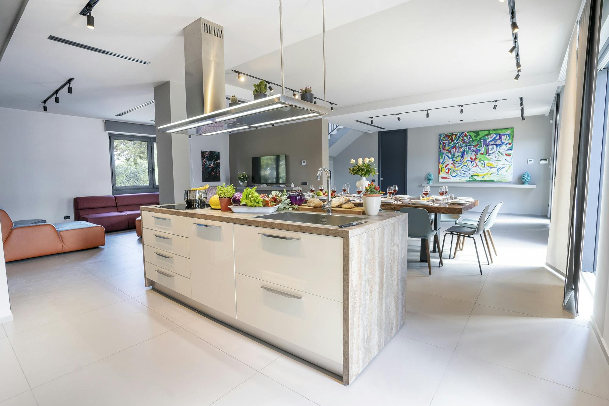 Step inside the villa to find beautifully restored interiors that honor the heritage of this ancient farmhouse, known locally as a baglio. With seven spacious bedrooms and eight luxurious bathrooms, the villa comfortably accommodates up to 14 guests. The living areas are a perfect blend of rustic charm and contemporary elegance, featuring high ceilings and exposed wooden beams. A fully equipped kitchen invites culinary exploration, while the expansive dining area is perfect for gathering with loved ones.