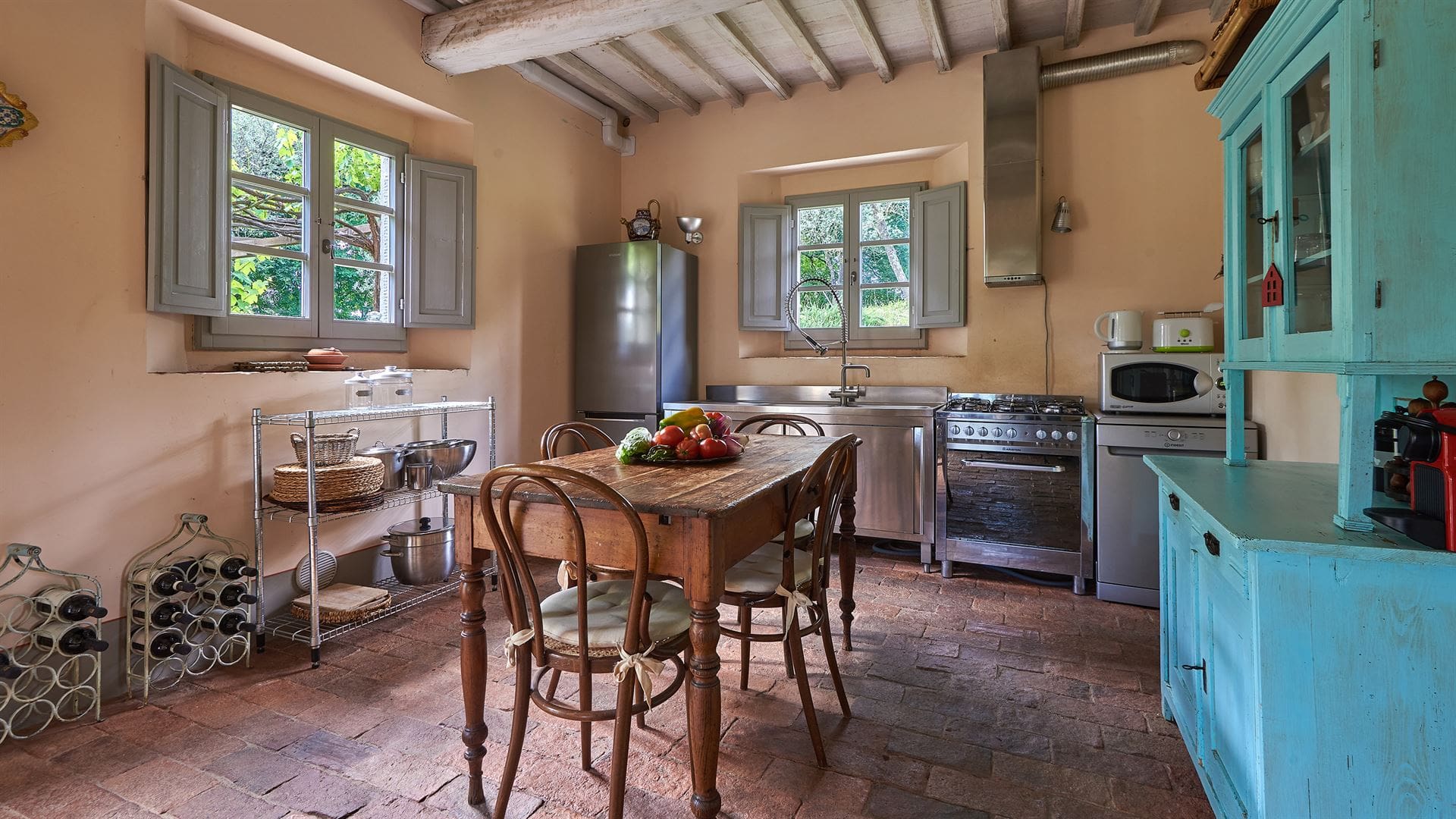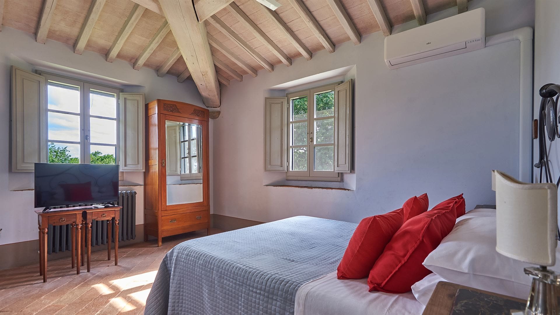 The villa’s interior embodies a harmonious blend of traditional Tuscan charm and contemporary design. With four spacious bedrooms and en-suite bathrooms, it comfortably accommodates up to eight guests. The open-plan living area, adorned with rustic beams and elegant furnishings, invites relaxation. A fully-equipped kitchen caters to culinary enthusiasts, while the expansive dining area provides the perfect setting for memorable meals.