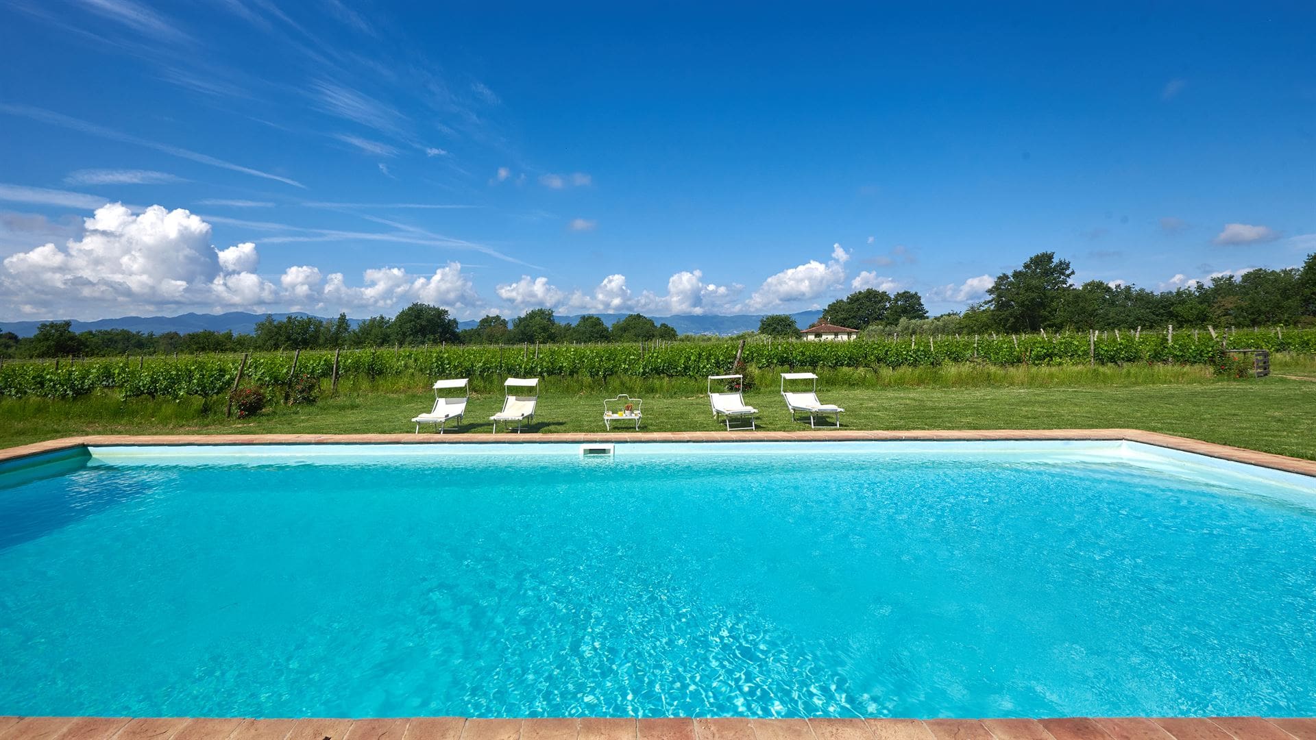Step outside to discover the villa’s enchanting outdoor spaces. A private swimming pool, nestled among the lush vineyards, offers a refreshing escape. Accessible via a golf buggy, this idyllic spot is perfect for leisurely afternoons under the Tuscan sun. The vine-clad pergola provides a picturesque backdrop for alfresco dining, while the surrounding gardens invite you to unwind amidst nature’s beauty.