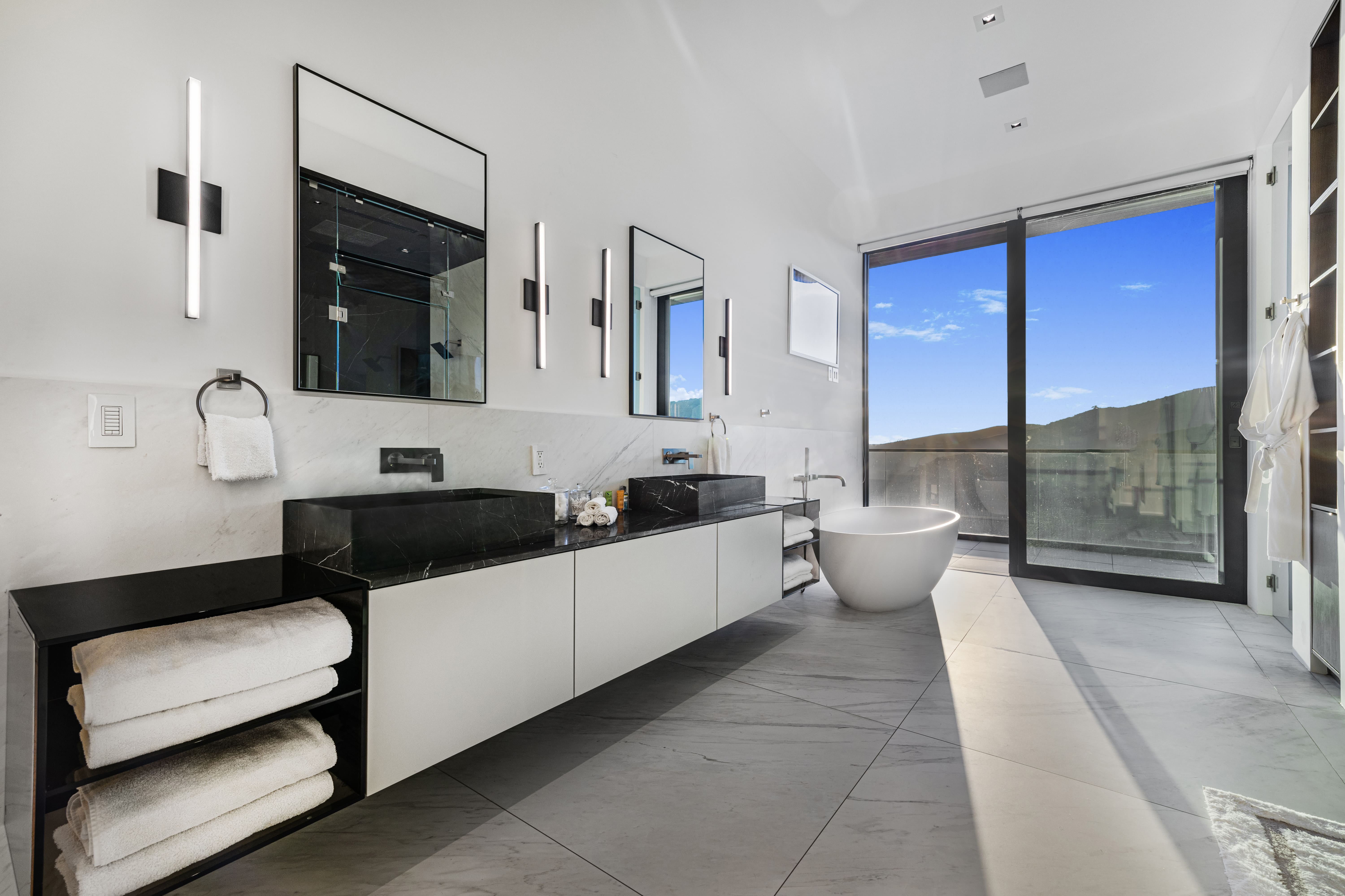 The villa’s outdoor spaces are nothing short of extraordinary. The infinity pool beckons for a refreshing dip, while the expansive terrace provides the ideal setting for al fresco dining against the backdrop of Los Angeles’ stunning vistas. Whether you’re lounging in the hot tub or enjoying a family barbecue, the outdoor amenities cater to every desire.