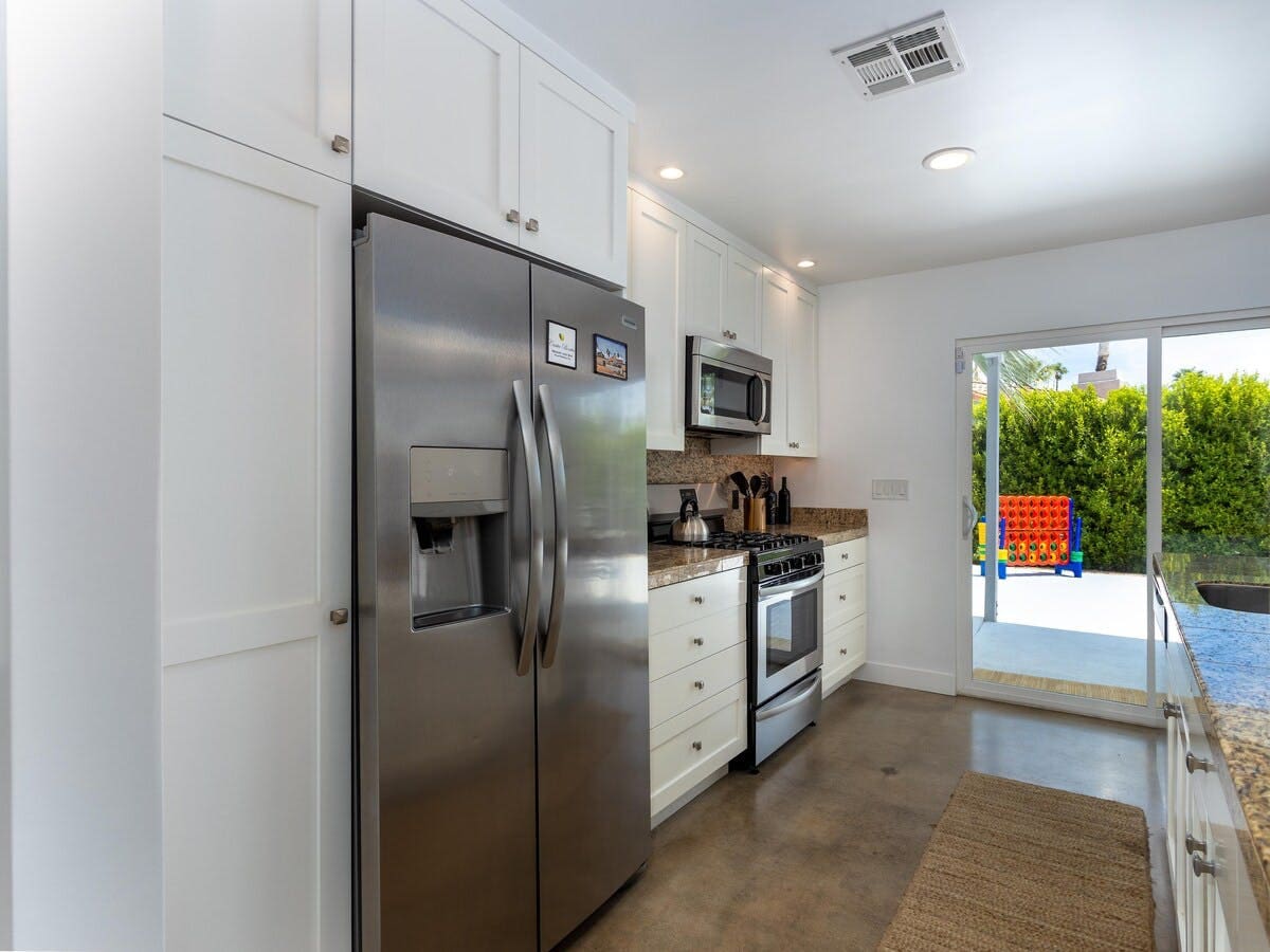 The interior of this Palm Springs apartment is a testament to modern elegance. With spacious living areas adorned with tasteful decor, it provides a warm and inviting ambiance. The open-plan living room features plush seating, ideal for cozy gatherings or relaxing evenings by the fireplace. The state-of-the-art kitchen is fully equipped for all your culinary endeavors, while the dining area offers a perfect setting for memorable meals. Each of the three bedrooms is designed for tranquility, complete with comfortable beds and flat-screen televisions for private relaxation.