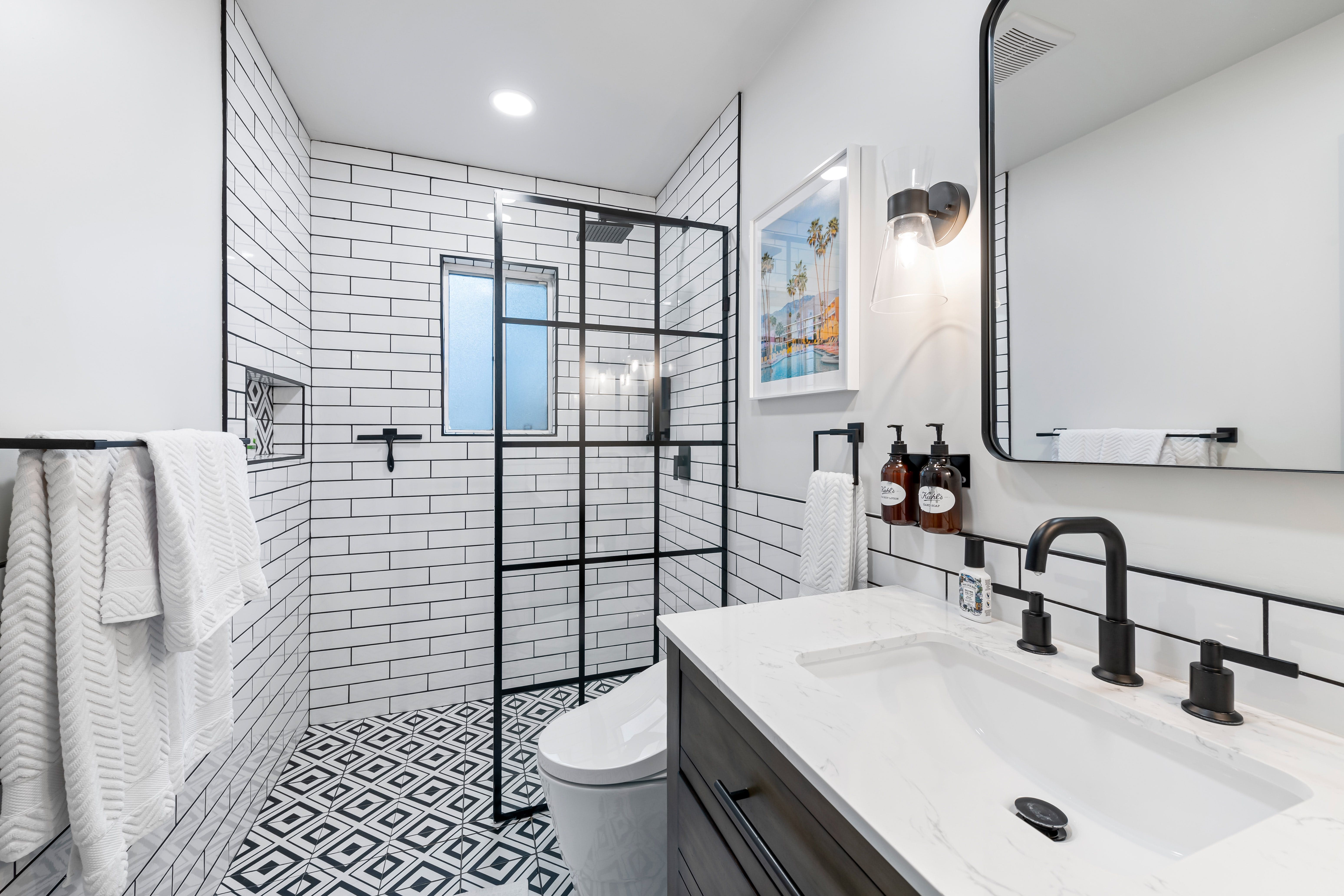 Step inside and discover a harmonious blend of modern design and comfort. The open-plan living area is flooded with natural light, courtesy of the expansive sliding glass walls. The designer kitchen, complete with marble countertops, offers a stylish space for culinary creations, while the sleek dining room is perfect for entertaining. Each bedroom is tastefully decorated with bold wallpaper and mid-century influences, ensuring a restful night’s sleep in a vibrant atmosphere.