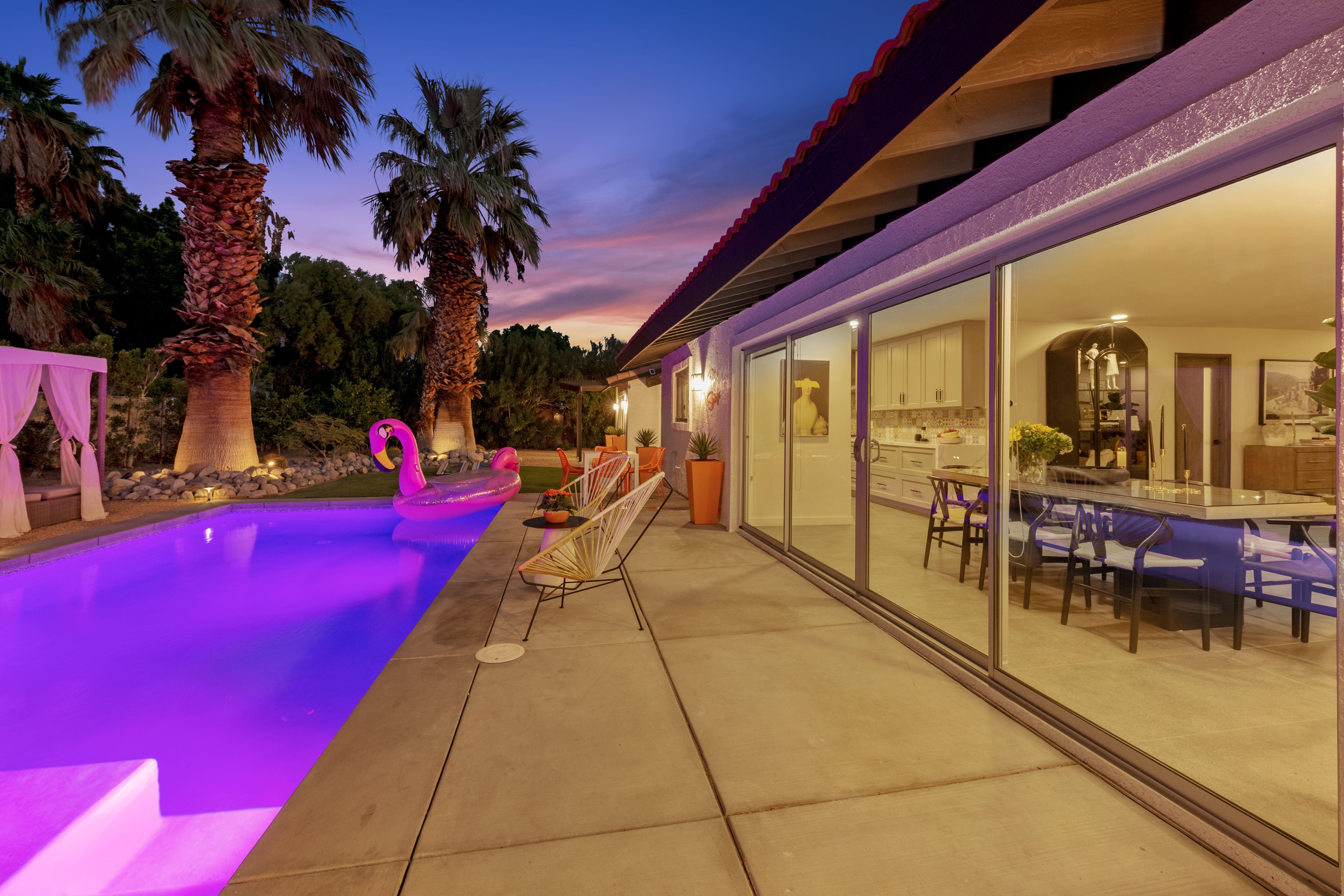 Outside, the private saltwater pool and oversized spa await, surrounded by sun loungers and Acapulco chairs for ultimate relaxation. The beautifully landscaped garden, lined with tall palms, provides a picturesque backdrop for BBQ dinners and sunset gatherings. Enjoy the peaceful ambiance and breathtaking views of the surrounding golf courses and mountains.