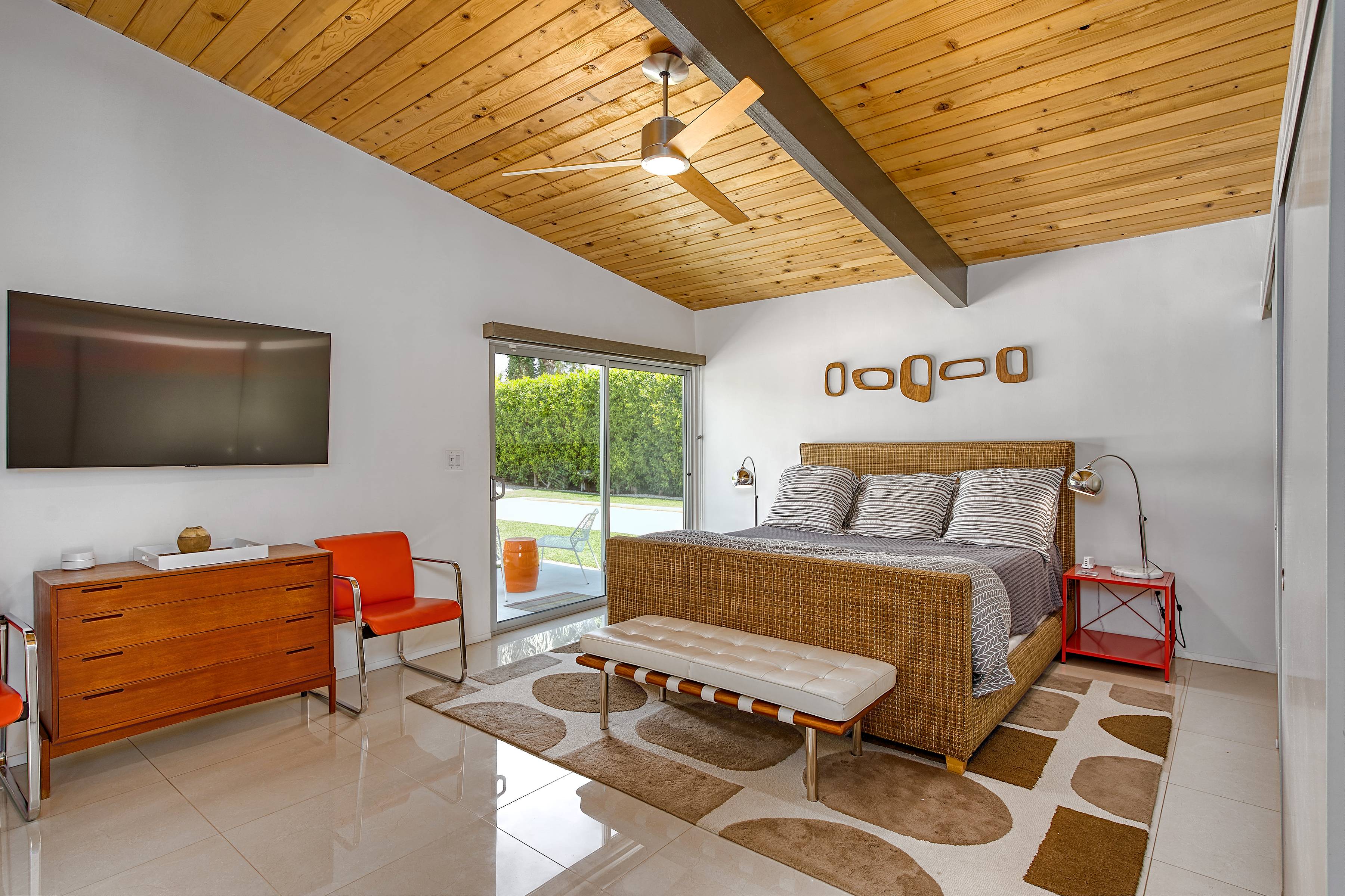 Step into a beautifully restored 1960s villa where mid-century charm meets modern luxury. The open-plan living space features vaulted tongue and groove ceilings and expansive glass doors that flood the interiors with natural light. Carefully curated mid-century furnishings create an inviting atmosphere perfect for social gatherings or quiet relaxation. The villa offers three spacious bedrooms, accommodating up to six guests, and two elegantly designed bathrooms. A fully equipped kitchen provides everything needed for culinary delights.