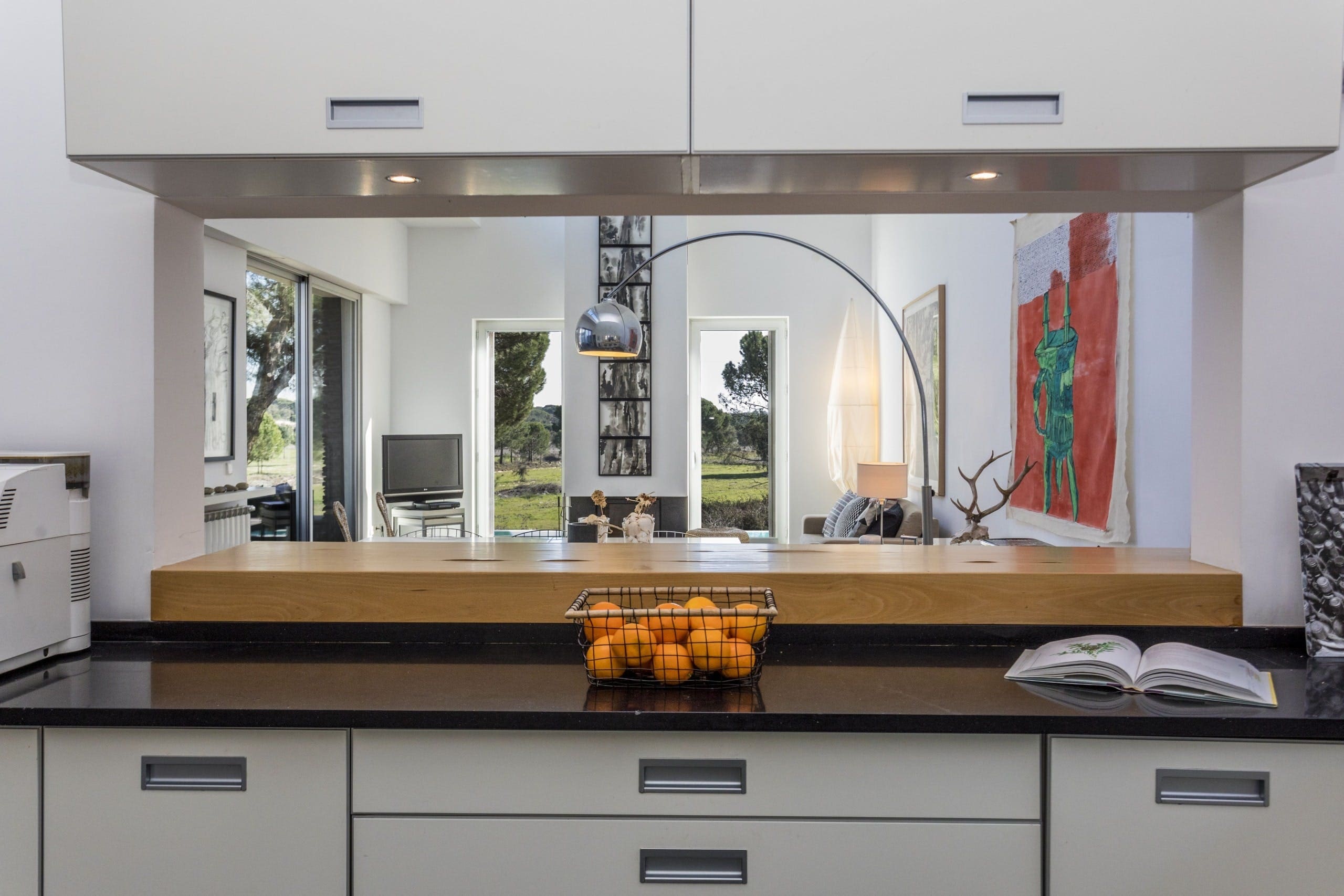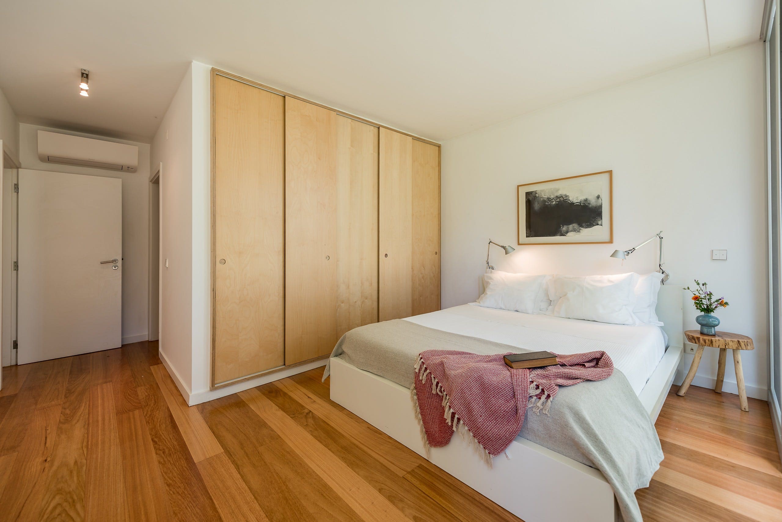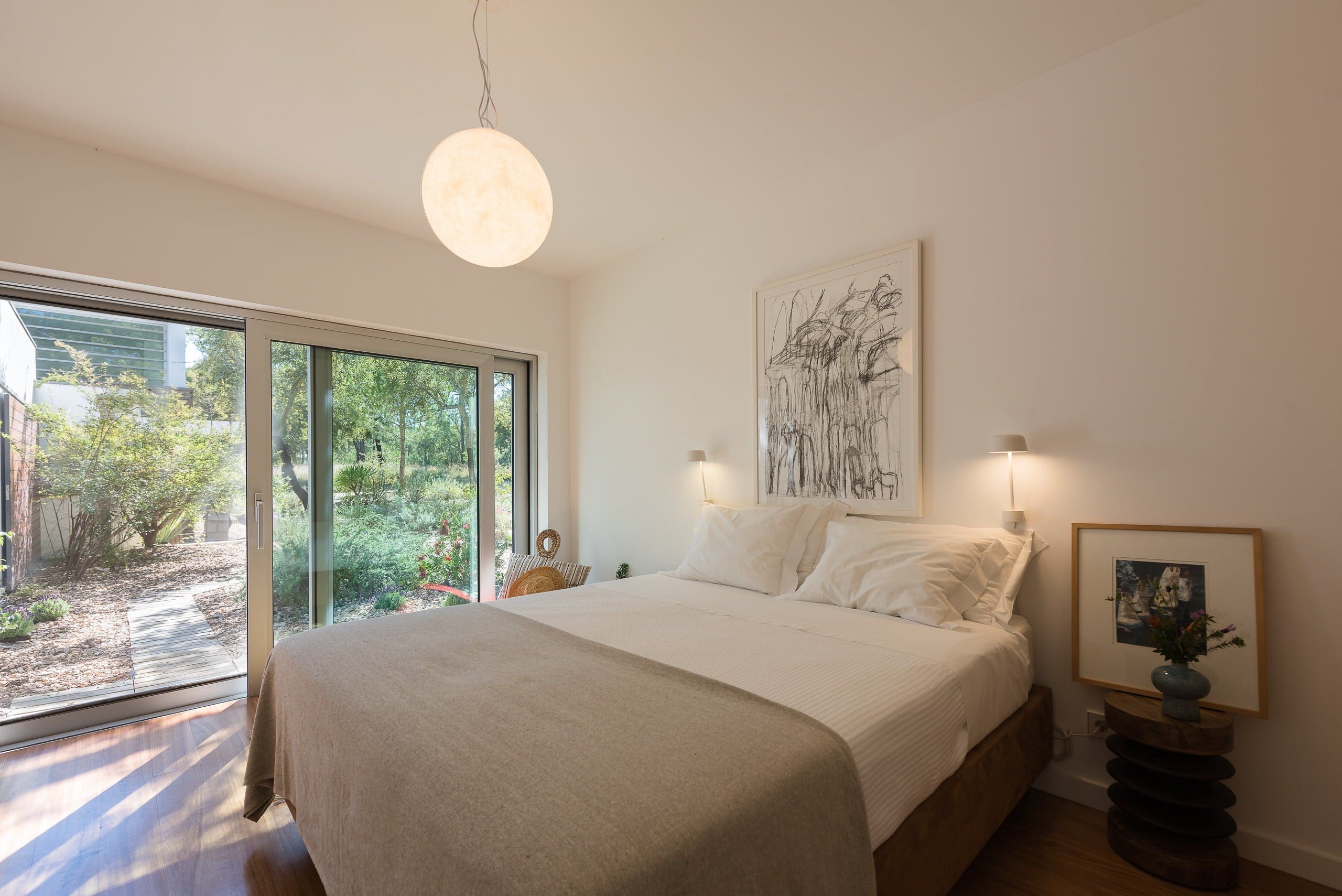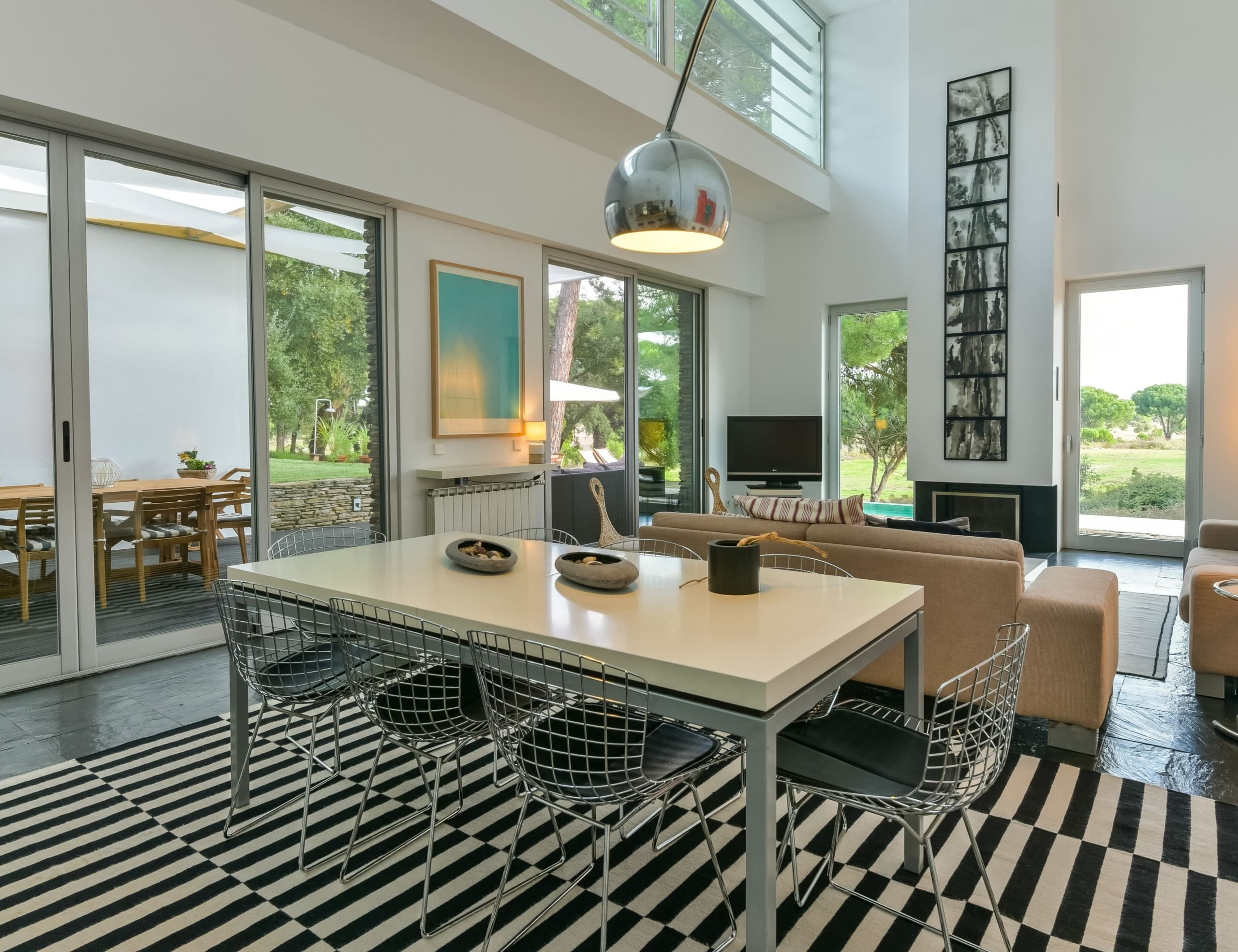 The interior of this Comporta apartment is a harmonious blend of contemporary design and comfort. Each of the five bedrooms is thoughtfully designed with ensuite bathrooms, offering privacy and luxury. The open-plan living area features large windows that flood the space with natural light, providing a seamless connection to the serene surroundings. The fully equipped kitchen boasts top-of-the-line appliances, perfect for preparing meals to enjoy at the spacious dining table, which can also serve as a convenient workspace.