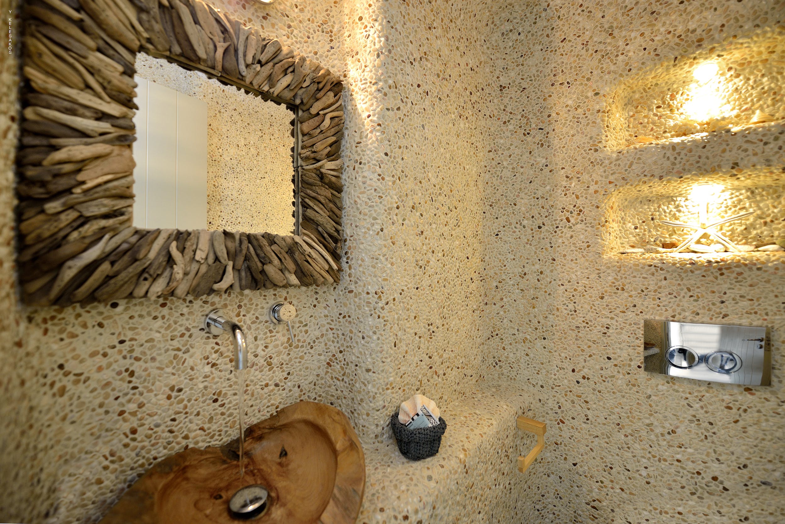 The interior of this Mykonos apartment exudes classic Greek charm, blending traditional white-washed stone walls with contemporary Asian-inspired accents. The expansive living areas are designed for relaxation and entertainment, featuring floor-to-ceiling glass doors that open to the terrace, allowing the gentle sea breeze to flow through. The dining area, equipped with a dedicated bar, is perfect for hosting gatherings. Each of the seven bedrooms offers air conditioning for your comfort, ensuring restful nights after sun-soaked days.