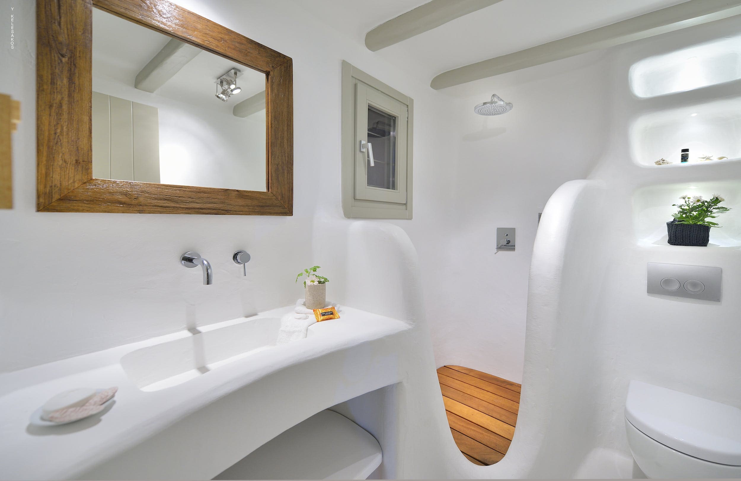 Step into a world of Cycladic charm as you enter the villa’s bright and airy living spaces. The open-plan design allows natural light to flood the interiors, highlighting the elegant decor and offering stunning vistas of the Aegean Sea. The main building houses four beautifully appointed bedrooms, while a separate guest house across the way provides three additional bedrooms, ensuring privacy and comfort for all guests. The fully equipped kitchen and spacious dining area make hosting gatherings a delight.