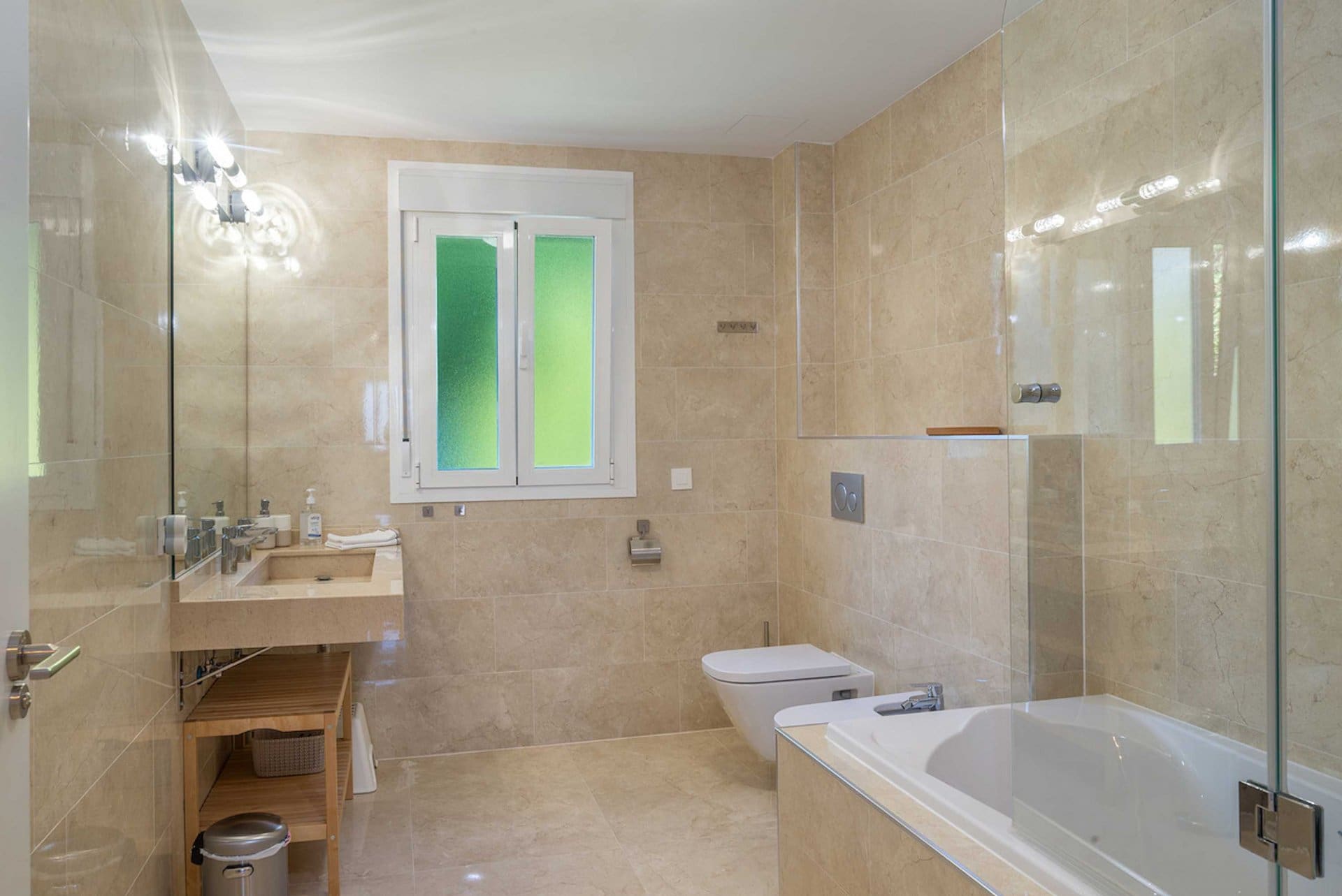 The interior of this apartment exudes a refined elegance, combining modern amenities with traditional Spanish charm. The open-plan living area is perfect for relaxation and entertainment, featuring plush seating, a state-of-the-art entertainment system, and expansive windows that flood the space with natural light. The fully-equipped kitchen boasts high-end appliances, ideal for preparing gourmet meals. Each of the five bedrooms offers a serene retreat with comfortable beds and tasteful decor, while the four bathrooms ensure ample convenience for all guests.