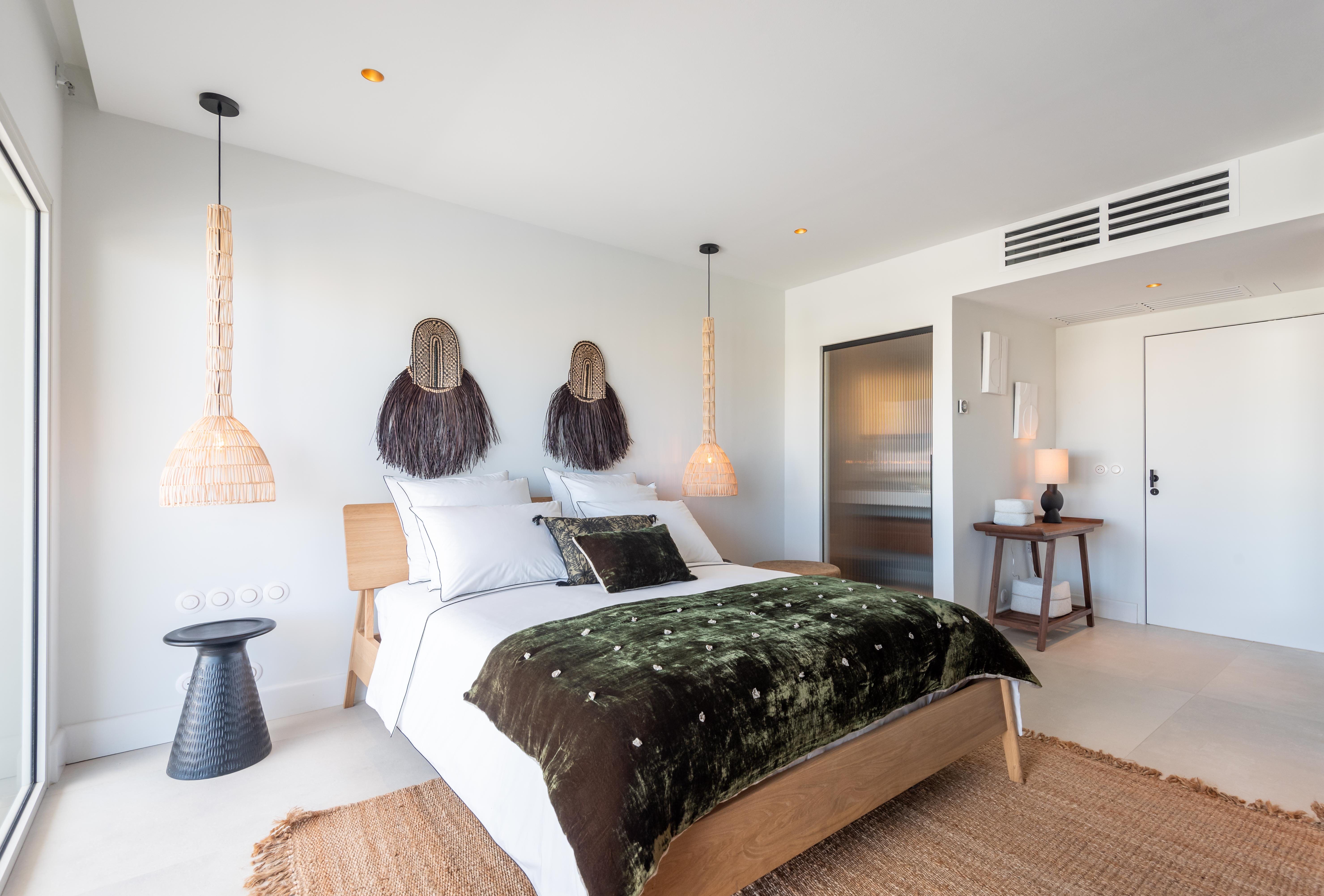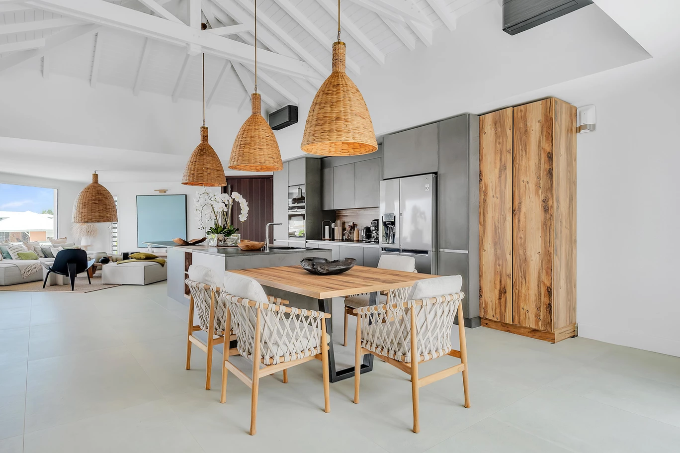 The villa’s outdoor spaces are nothing short of spectacular. The heated infinity pool offers a seamless view of the Caribbean Sea, while the white terrace with its lounge area and alfresco dining setup provides the perfect spot for enjoying the island’s warm breezes. Guests have direct access to the beach at Hotel Manganao, just a two-minute walk away, adding to the villa’s appeal.