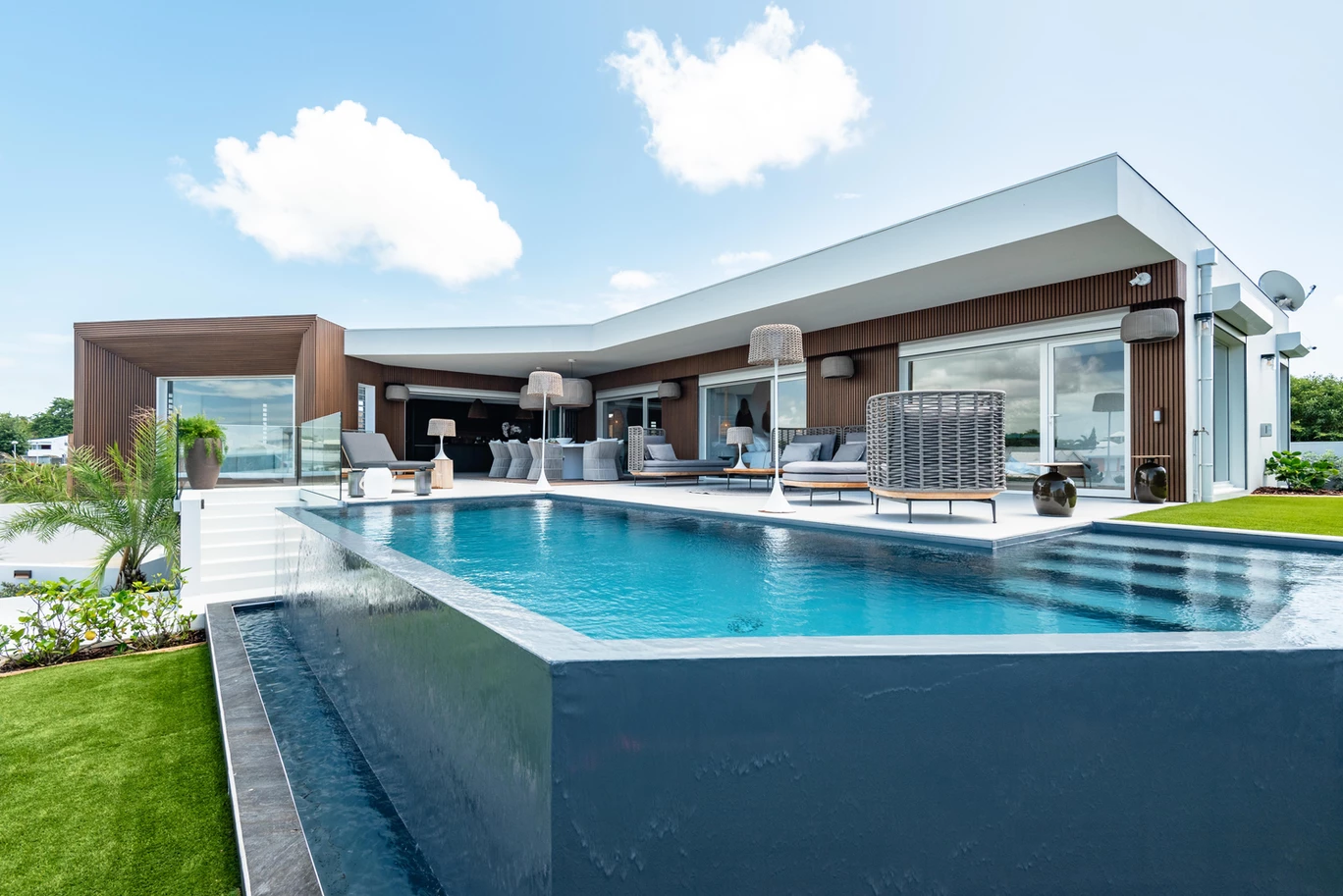 A: The villa includes a heated infinity pool, air-conditioned bedrooms, access to nearby beaches, and optional housekeeping services.