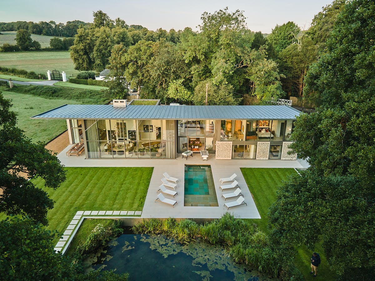 Outside, the Hampshire countryside unfolds before you. The expansive terrace provides ample seating, ideal for al fresco dining or leisurely afternoons by the unfenced swimming pool. Enjoy the peaceful views of the surrounding farmland and watch as sheep graze nearby, creating a picturesque backdrop to your stay.