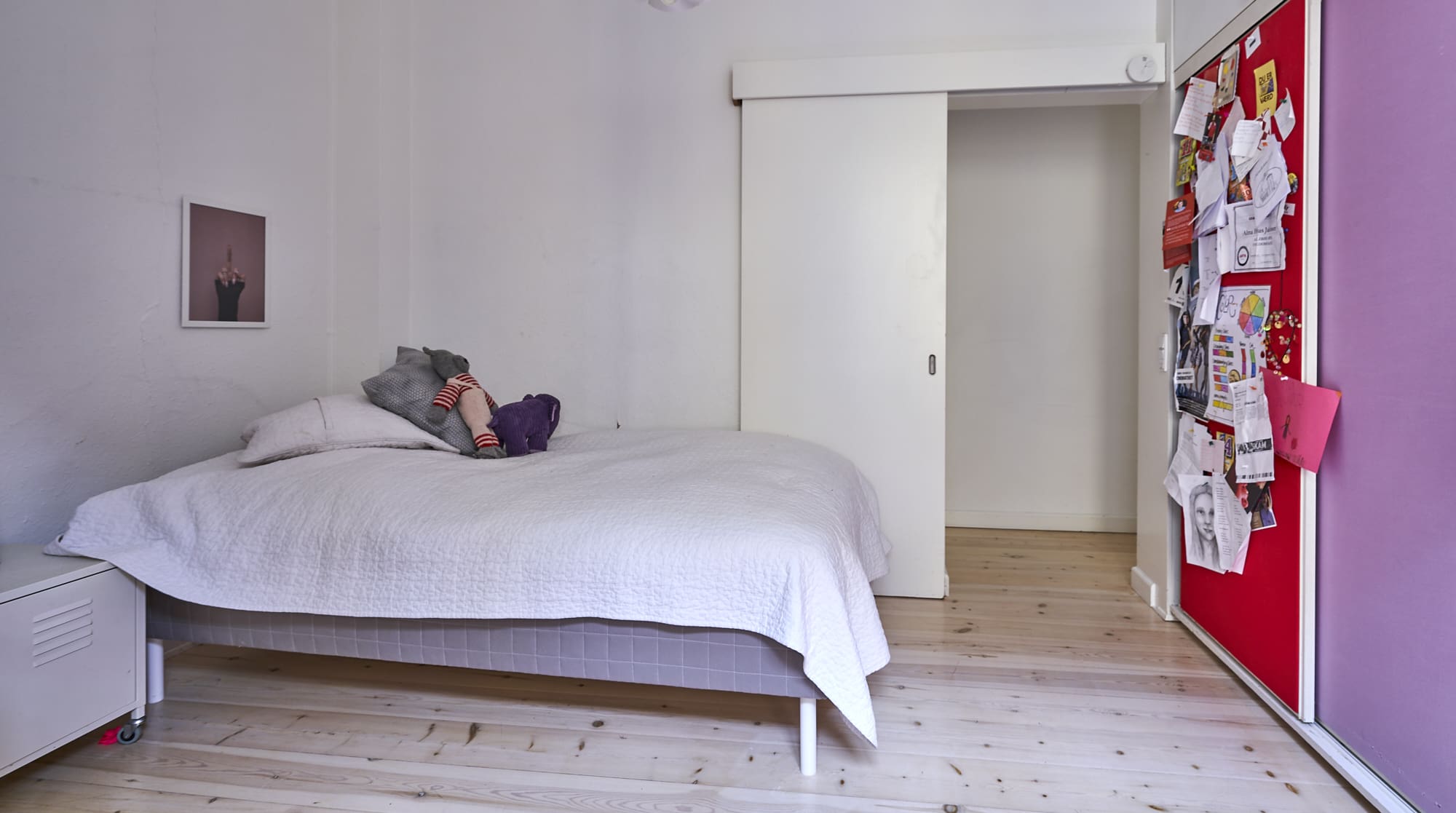 Step inside to a world of color and creativity. The three-bedroom apartment is a tribute to Danish design, with a playful mix of bold hues and iconic furniture pieces. The living area invites relaxation with its plush seating and eclectic decor, while the kitchen boasts modern amenities for culinary exploration. Two children’s bedrooms are whimsically appointed, offering a family-friendly haven, while the master bedroom promises restful nights. Please note, the home reflects its lived-in nature, complete with some personal belongings.