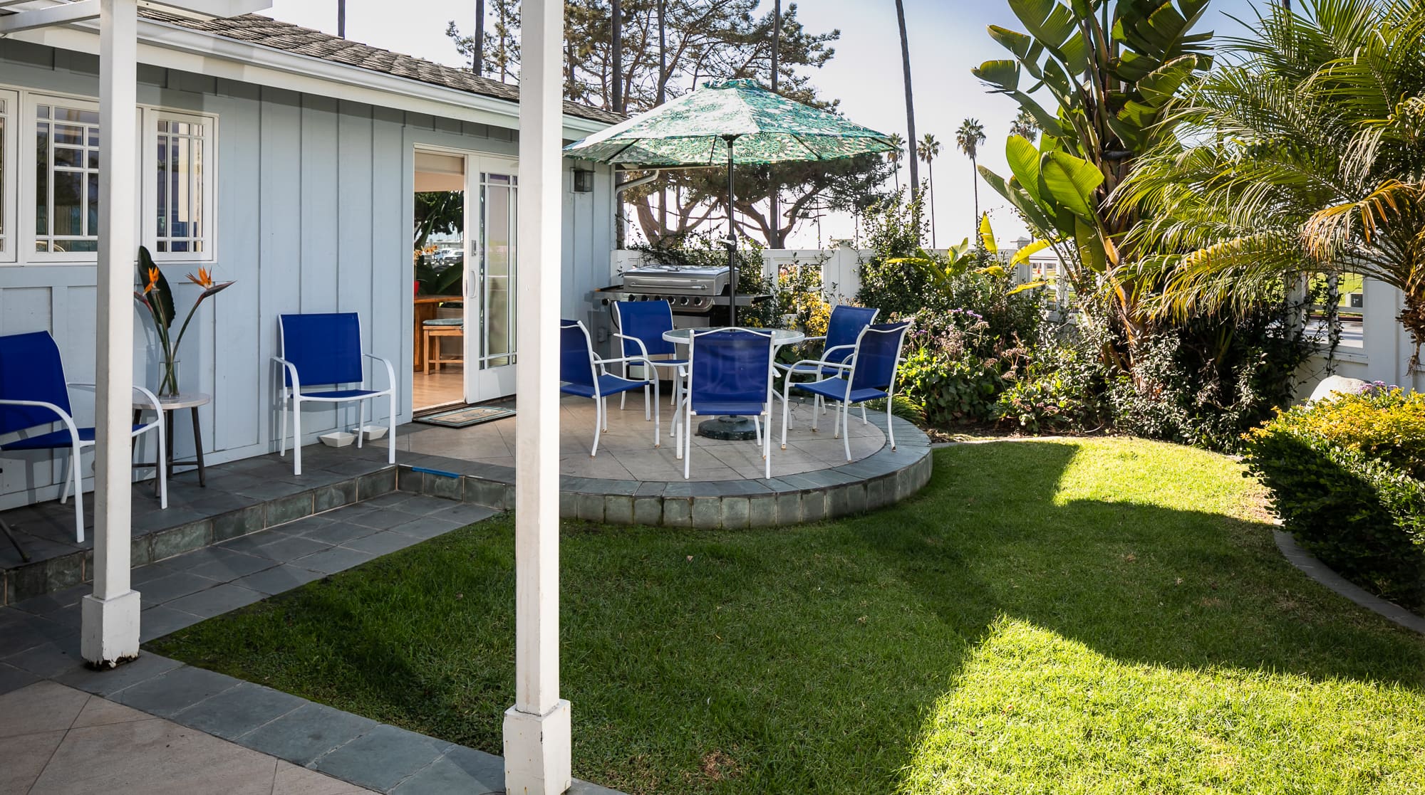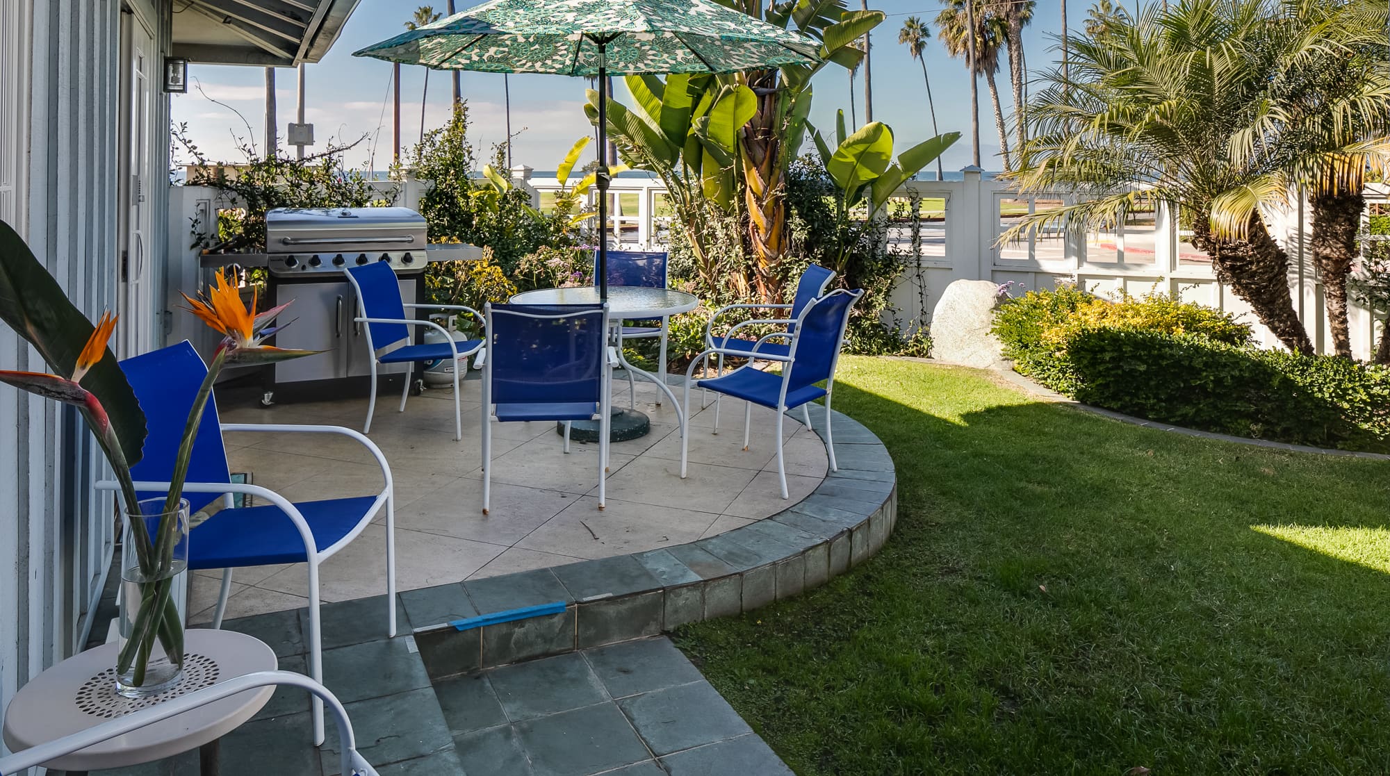Outside, the allure of Southern California’s coastline beckons. The property’s lush gardens and terraces offer ample space for relaxation and entertainment, complete with a hot tub for rejuvenating soaks. The nearby beach is just steps away, and the property provides everything you need for a fun day in the sun, including beach boards, towels, chairs, sun umbrellas, and a convenient pull-along cart.