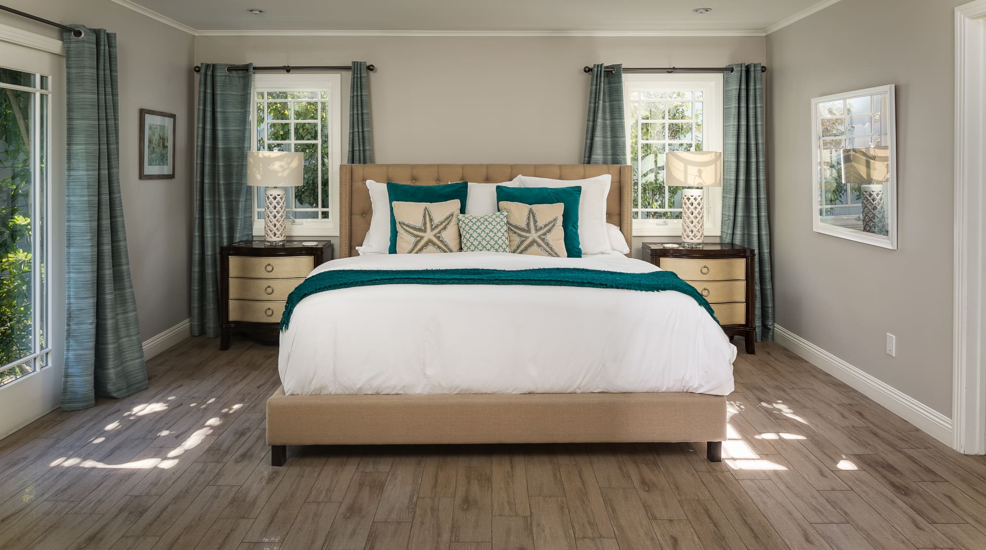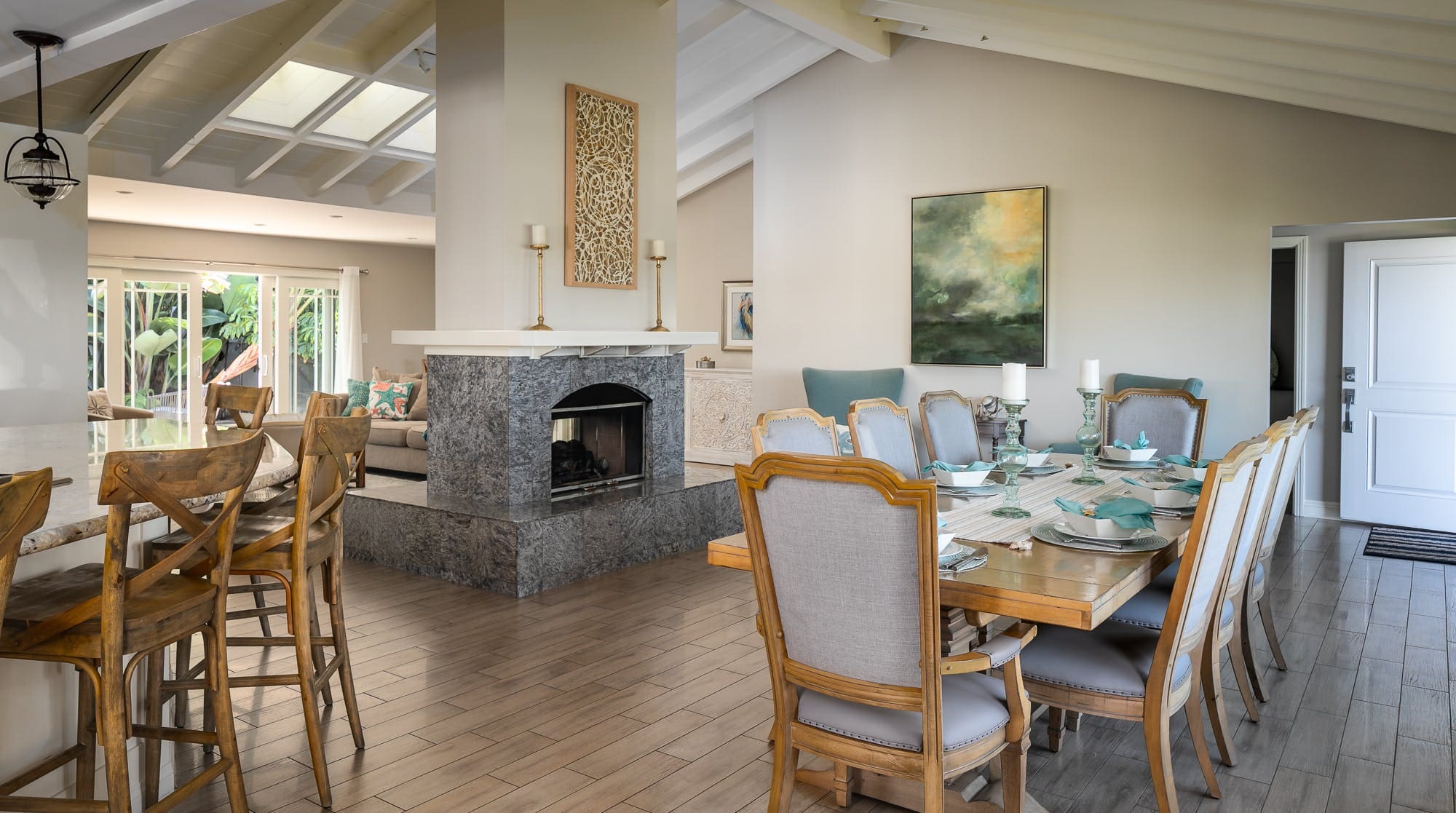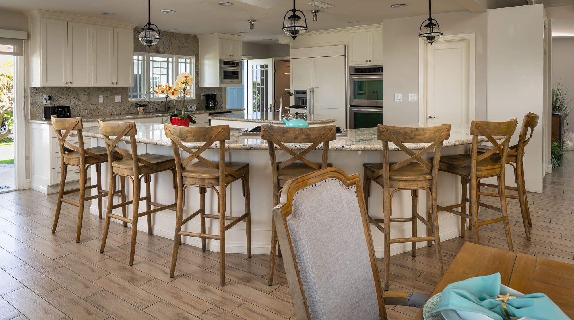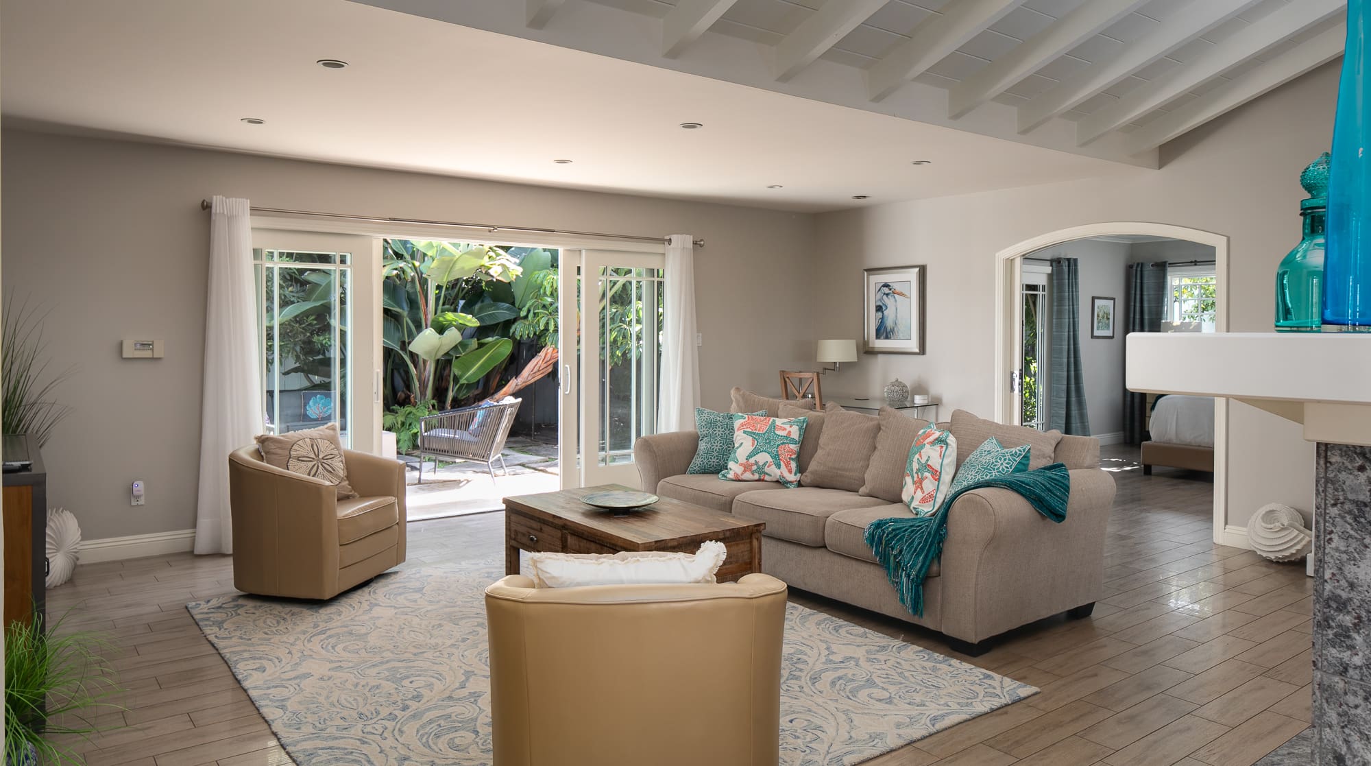 Step inside and discover a sanctuary of sophisticated design and modern amenities. The main house features three elegantly appointed bedrooms, each designed with meticulous attention to detail. Sweeping hardwood floors and expansive white walls create a serene atmosphere, while the free-flowing layout invites relaxation. The self-contained casita across the courtyard offers an additional en-suite bedroom, perfect for guests seeking a bit more privacy. The living areas are spacious and inviting, with ample seating for gatherings. A fully equipped kitchen stands ready for culinary adventures, complete with high-end appliances and sleek finishes.