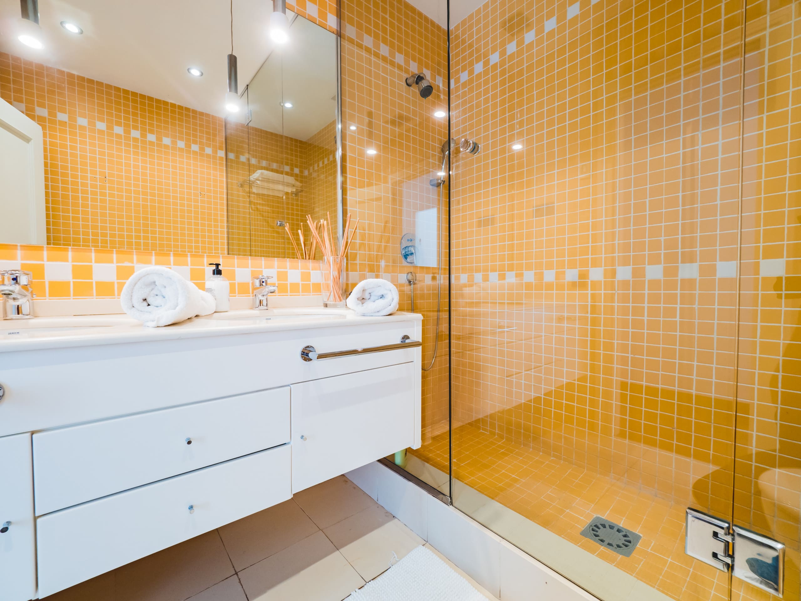 Spread across three floors, the apartment features a modern and stylish interior. It boasts four spacious bedrooms and three elegant bathrooms, accommodating up to eight guests comfortably. The living areas are designed for relaxation, with plush seating and large windows that let in plenty of natural light. The fully equipped kitchen is perfect for preparing meals, and there’s a dedicated desk space for those needing to work remotely.