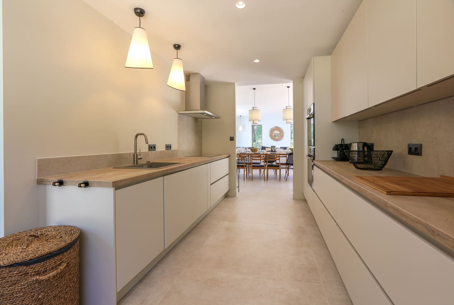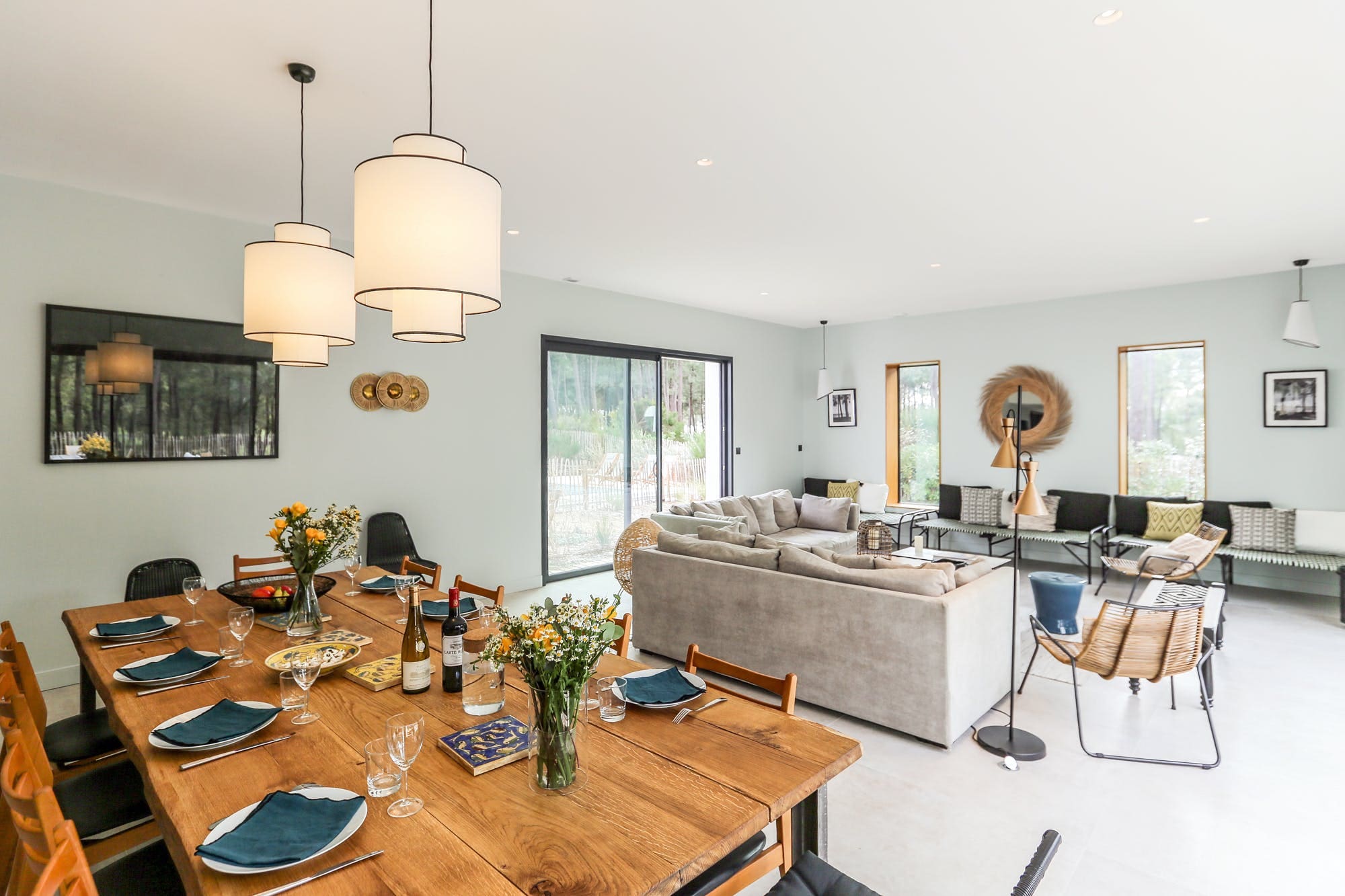 The apartment accommodates 14 guests across seven bedrooms and bathrooms. A private entrance ensures privacy, and free parking with an EV charging socket is available on the driveway. Though there is no dedicated desk, the dining table provides a convenient workspace. For more options, browse our luxury villa rentals in France.