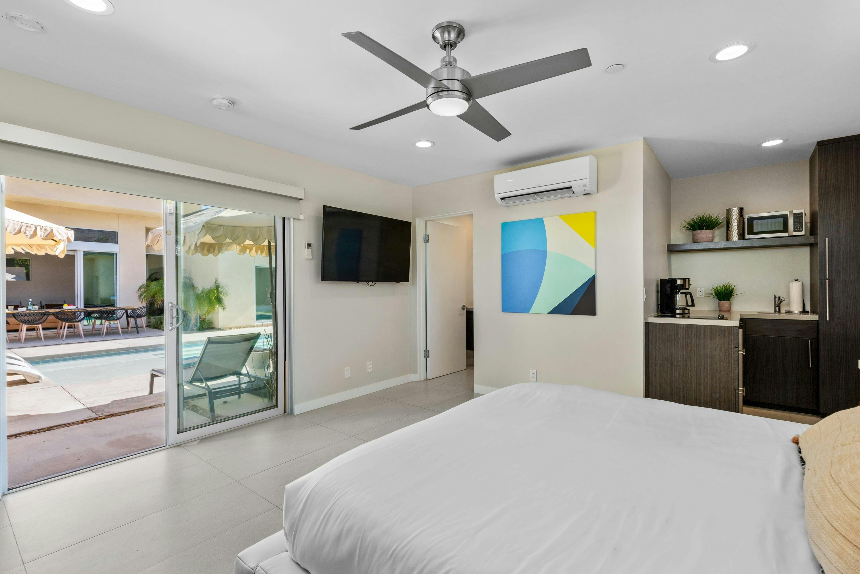 Step inside to discover an inviting living space that seamlessly combines modern design with timeless comfort. The house features four spacious bedrooms, each adorned with plush furnishings and contemporary decor. The main living area, with its open-plan design, is perfect for socializing and relaxation, while the fully equipped kitchen invites culinary creativity. The separate casita suite, accessible from the courtyard, provides a private retreat with its own bathroom and kitchenette, ideal for guests seeking extra privacy.