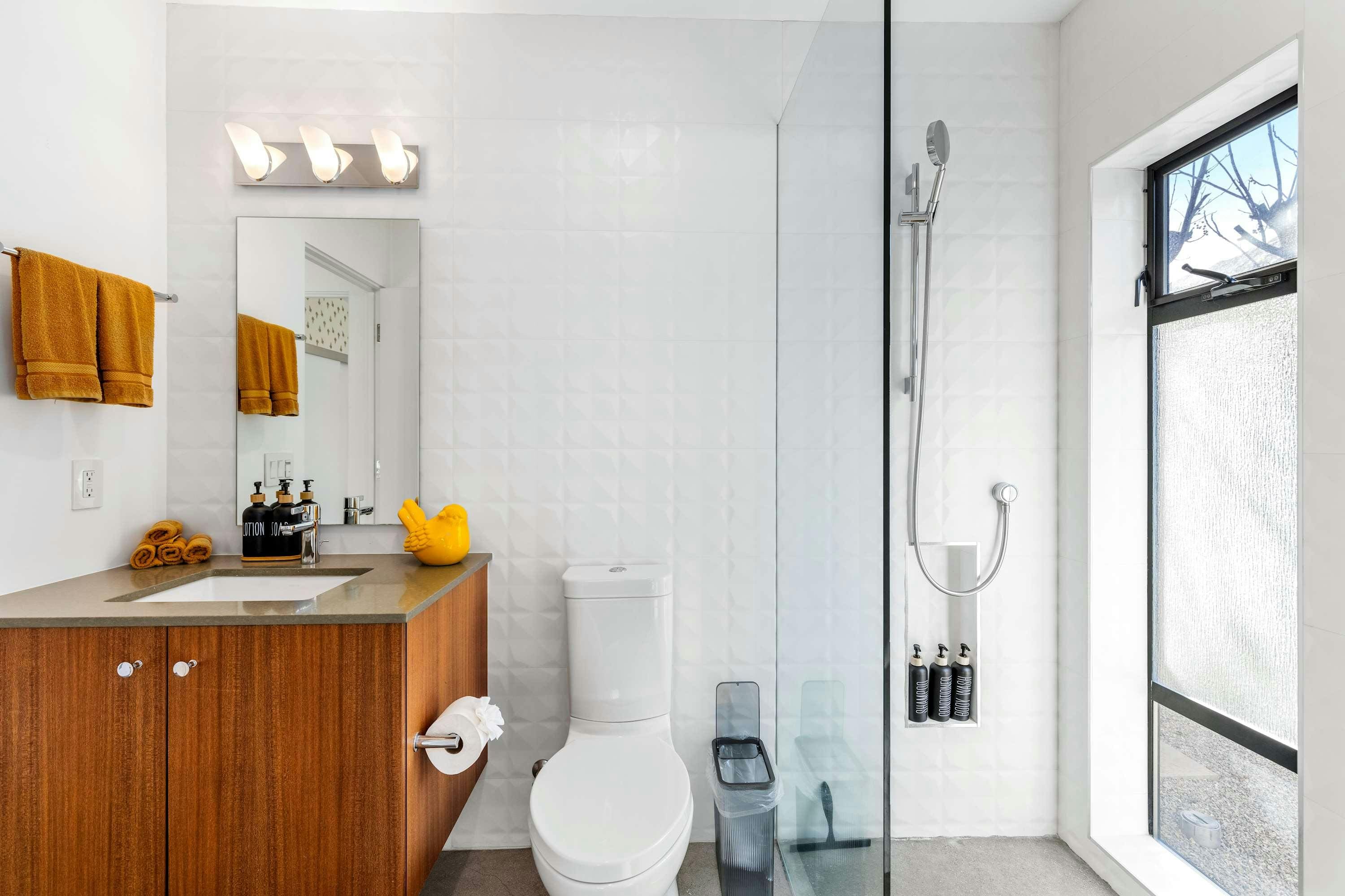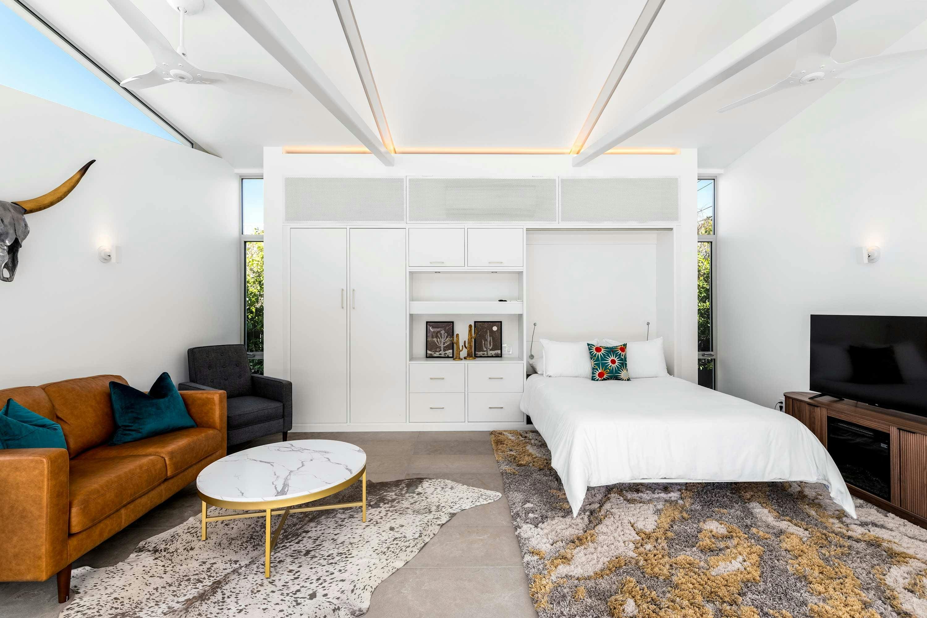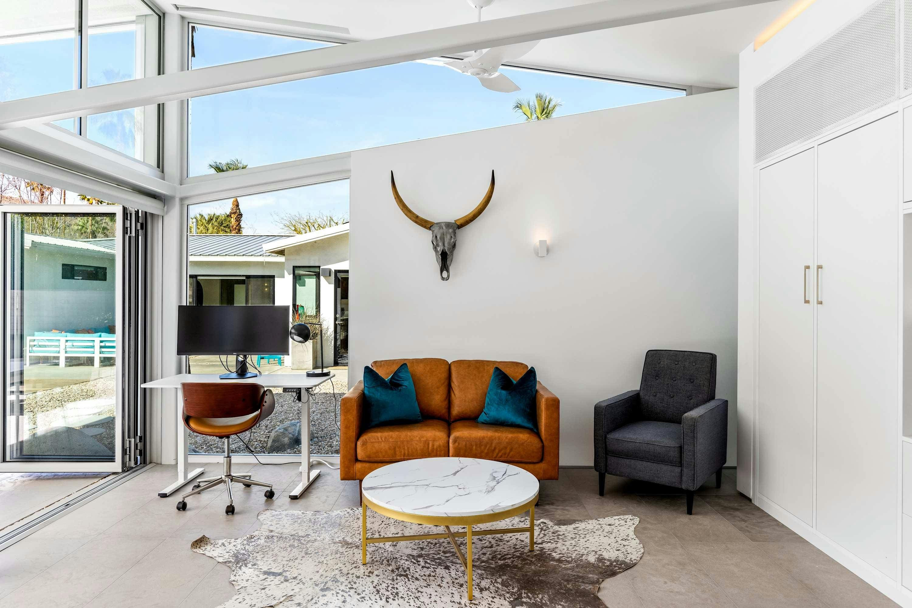 Step into a world of contemporary Californian elegance as you enter this beautifully designed home. The main house features three spacious bedrooms, each with its own unique charm and comfort. The master bedroom boasts both an indoor and outdoor shower, allowing you to embrace the desert breeze. The separate annexe provides an additional en-suite bedroom, complete with its own kitchenette and living area, ideal for guests seeking privacy. The open-plan living space is adorned with retro furniture and vibrant pops of color, offering a welcoming atmosphere for gatherings.