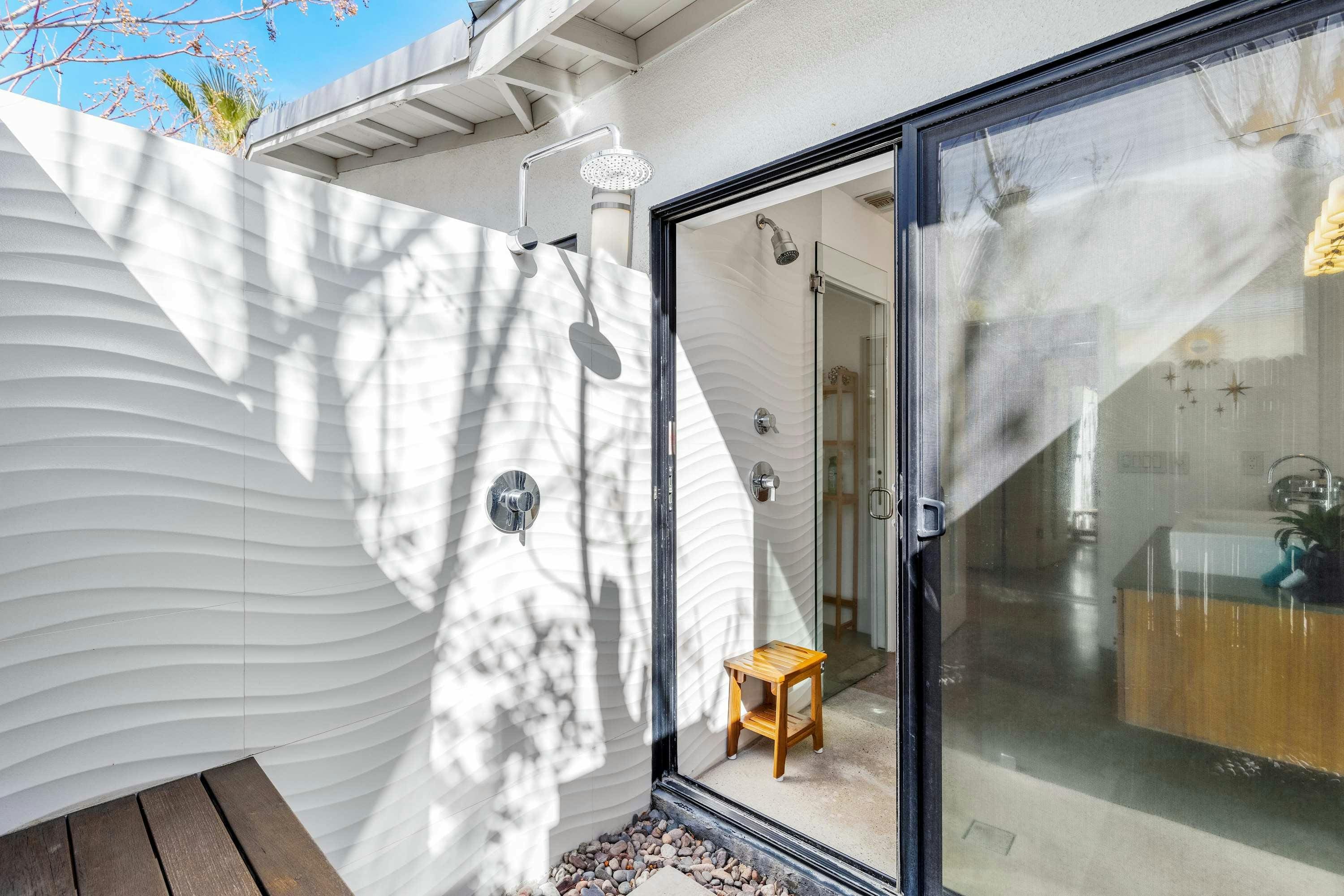 The outdoor area is a true oasis, with the swimming pool serving as the centerpiece. Relax on the sun loungers or take a dip in the pool while enjoying panoramic views of the San Jacinto mountains. The adjacent hot tub offers a perfect spot for unwinding under the stars. With an outdoor shower and toilet conveniently located by the pool, every detail ensures a seamless outdoor experience.
