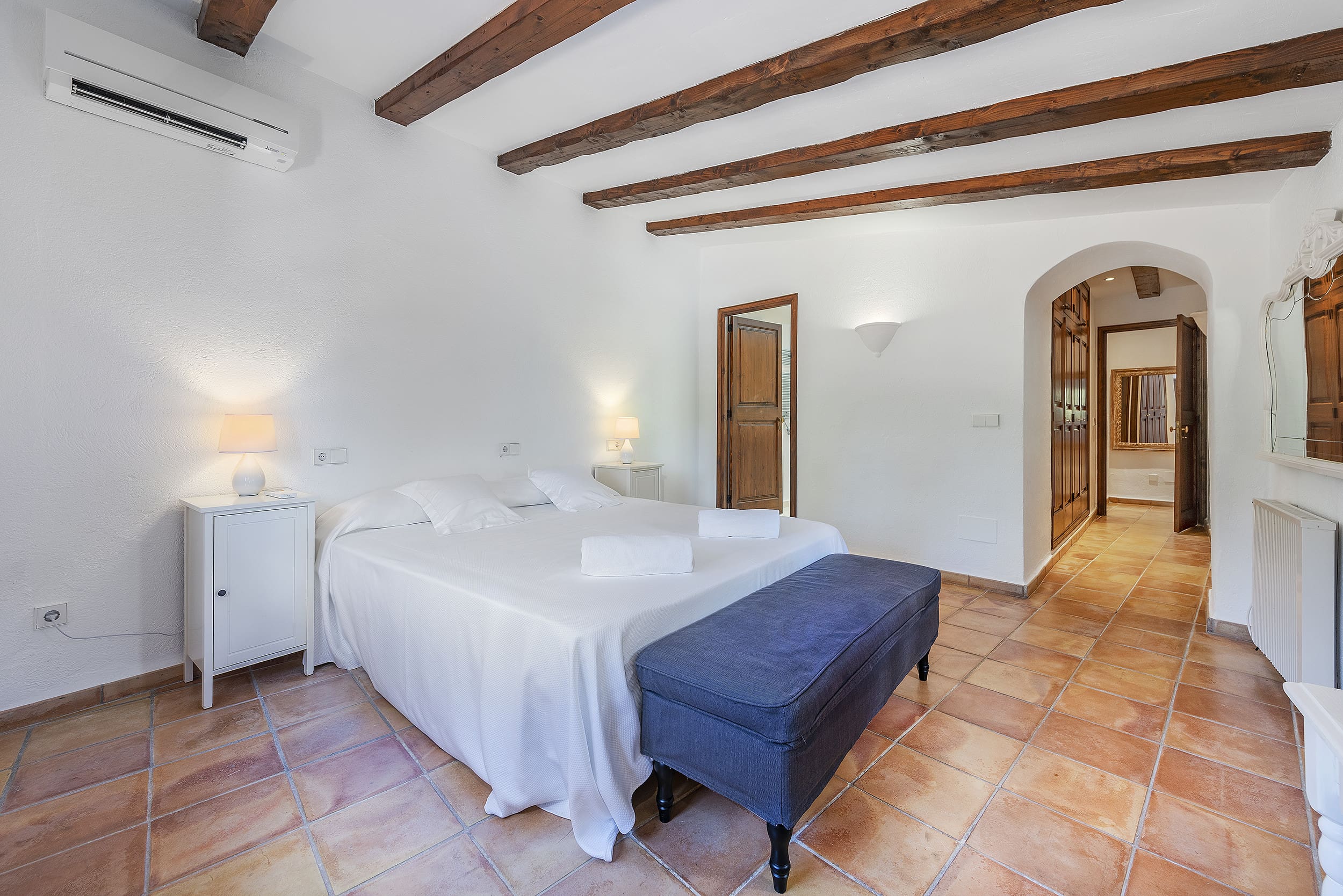 Casa Pi de Pollença accommodates up to eight guests across five bedrooms and four bathrooms. While there is no dedicated desk, the dining table serves as a laptop-friendly workspace. Note that cots and high chairs are not provided, so please bring your own if traveling with infants. Smoking is permitted, and there is a separate laundry room for convenience. Explore our luxury villa rentals in Spain for more properties.