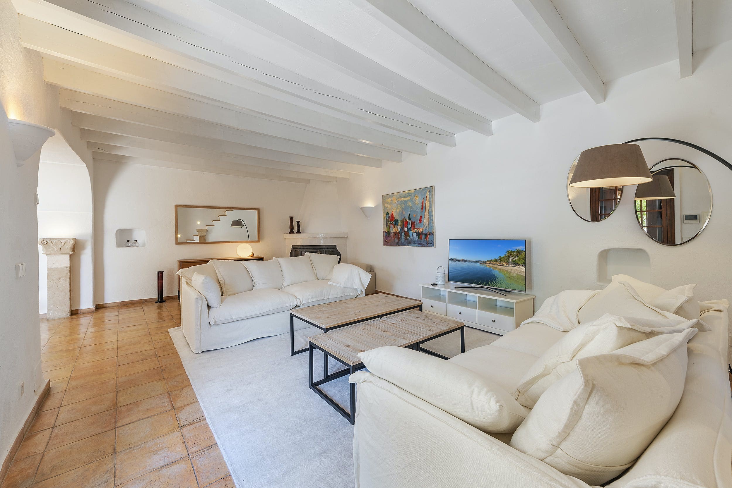 The interior of Casa Pi de Pollença is a testament to refined living, boasting five spacious bedrooms and four elegant bathrooms. The main house offers four beautifully appointed bedrooms, while an additional private bedroom and bathroom are found in the secluded annexe, perfect for guests seeking extra privacy. The living areas are thoughtfully designed to provide comfort, with plush seating and tasteful decor. A fully equipped kitchen invites culinary enthusiasts to create gourmet meals, while the dining table doubles as a convenient workspace for remote working.