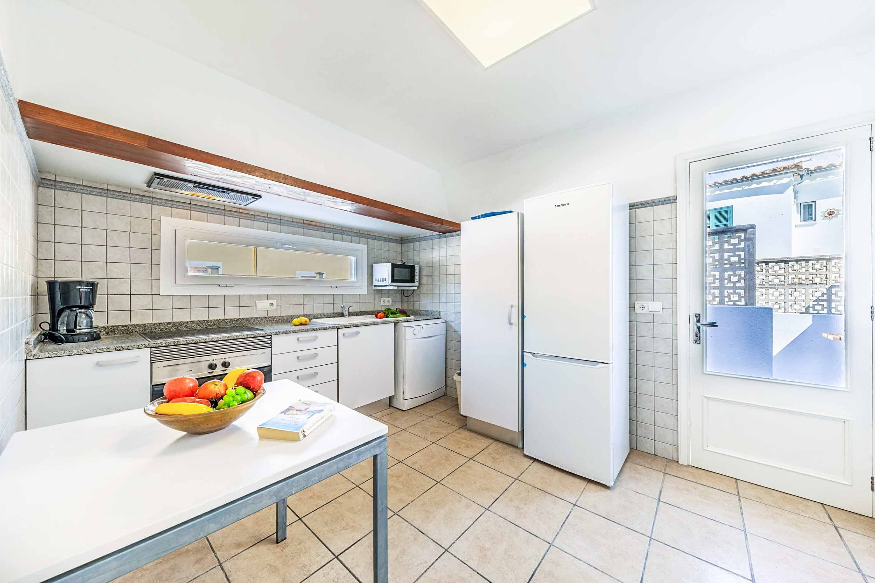 Step inside and be captivated by the elegant design and spacious interiors of this luxury apartment in Mallorca. The living area features high wood beam ceilings and marble checkered floors, creating a bright and open environment. With comfortable furnishings and a rustic fireplace, the space exudes warmth and sophistication. The fully equipped kitchen and dining area provide everything you need for a memorable culinary experience.