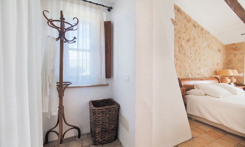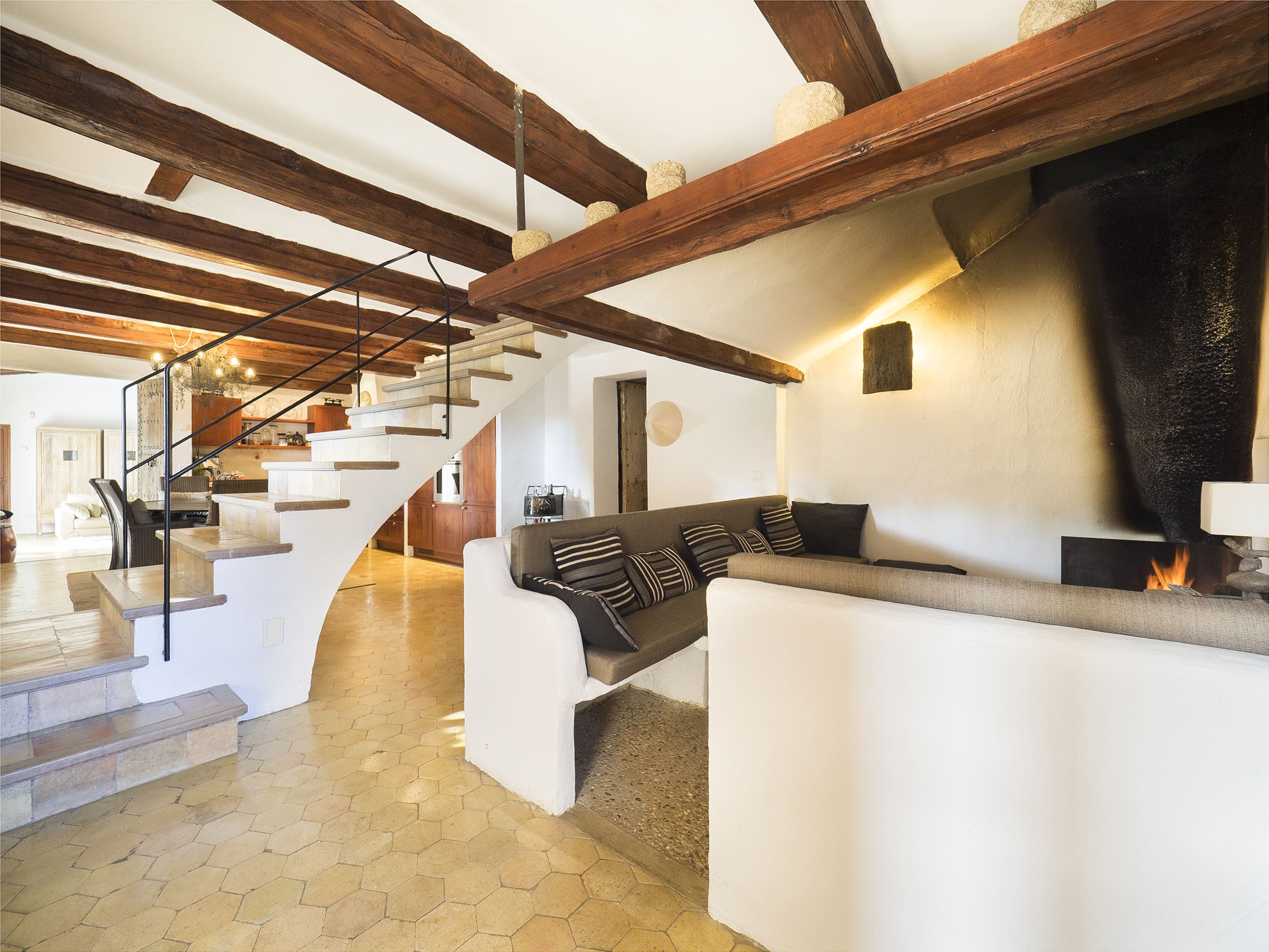 Step into your haven of elegance where contemporary design meets classic Mallorcan charm. The villa’s interiors boast spacious living areas adorned with chic furnishings and a cosy fireplace alcove, perfect for unwinding after a day of exploration. The fully equipped kitchen caters to all your culinary needs, while the four bedrooms, including a unique guest house by the pool, ensure privacy and comfort for up to seven guests. The absence of a dedicated workspace is creatively resolved with the dining table doubling as a laptop-friendly area, ideal for remote work.