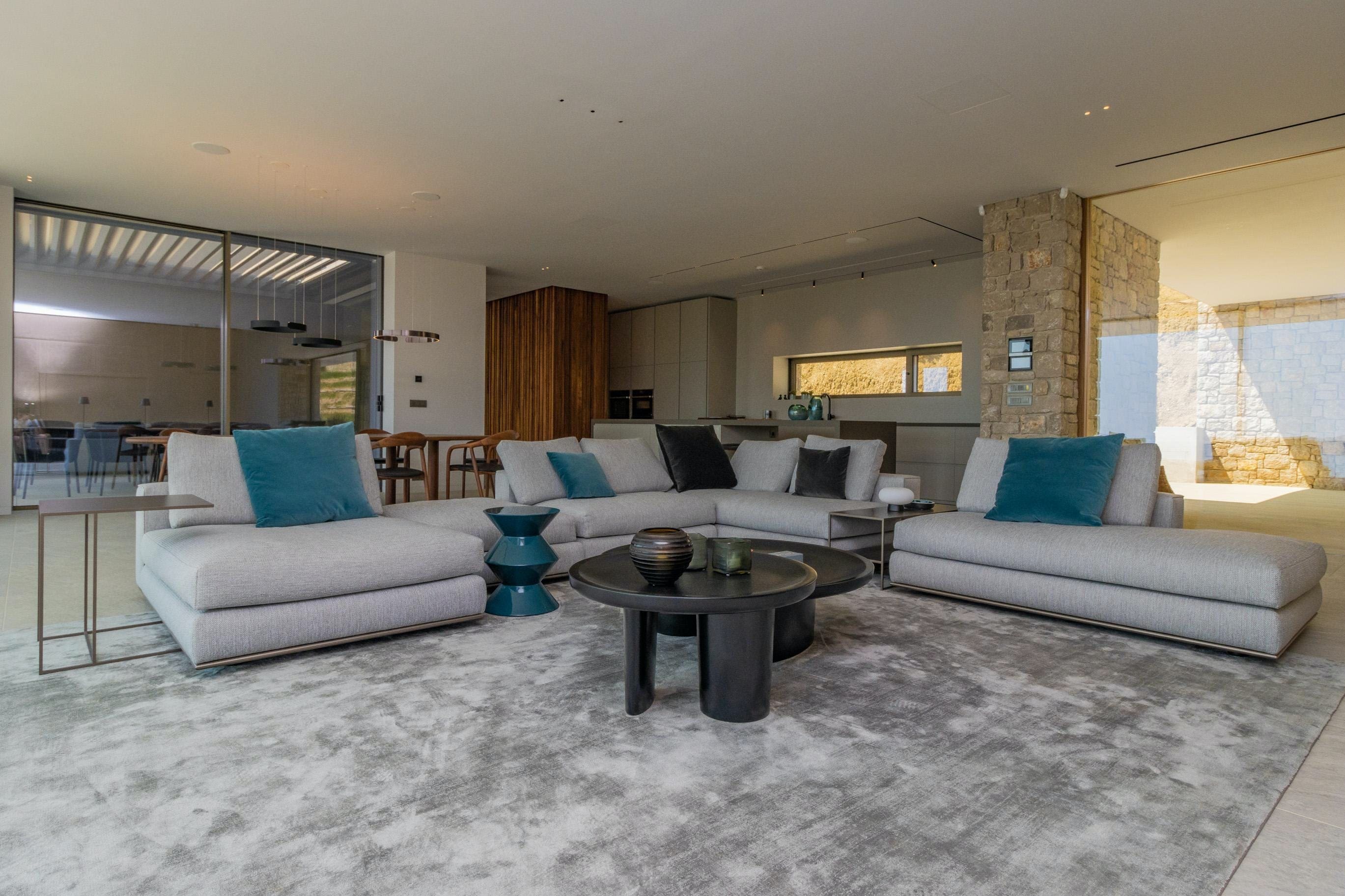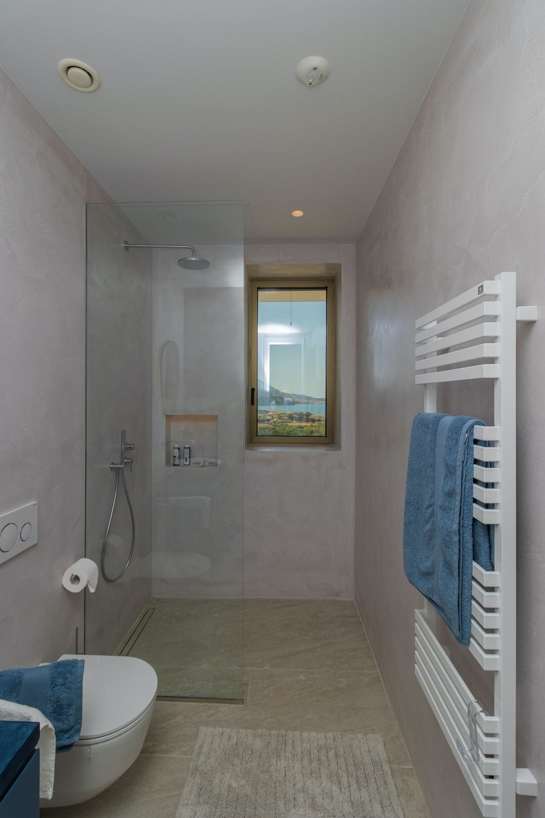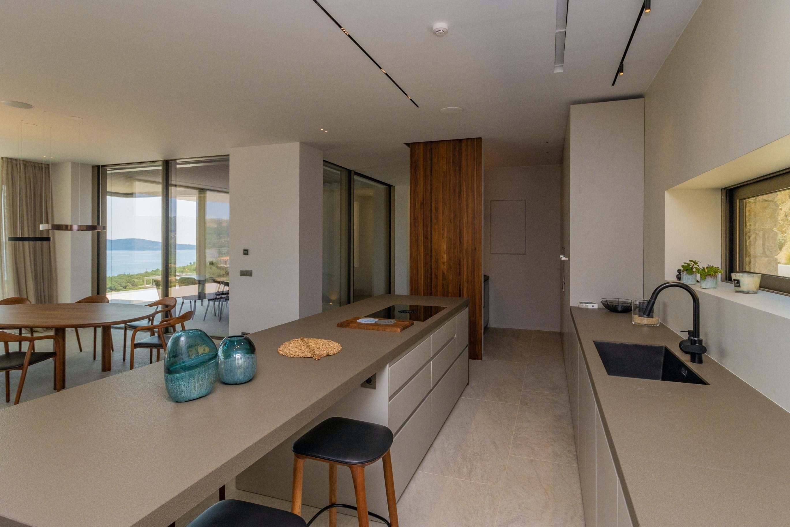 The villa’s outdoor spaces are a true highlight, featuring an expansive infinity pool that seamlessly blends with the horizon. Surrounded by lush gardens and olive trees, the pool area offers a tranquil setting for relaxation. Enjoy alfresco dining on the spacious terrace while taking in the stunning sea views. The nearby beaches are just a short drive away, providing ample opportunities for sunbathing and water activities.